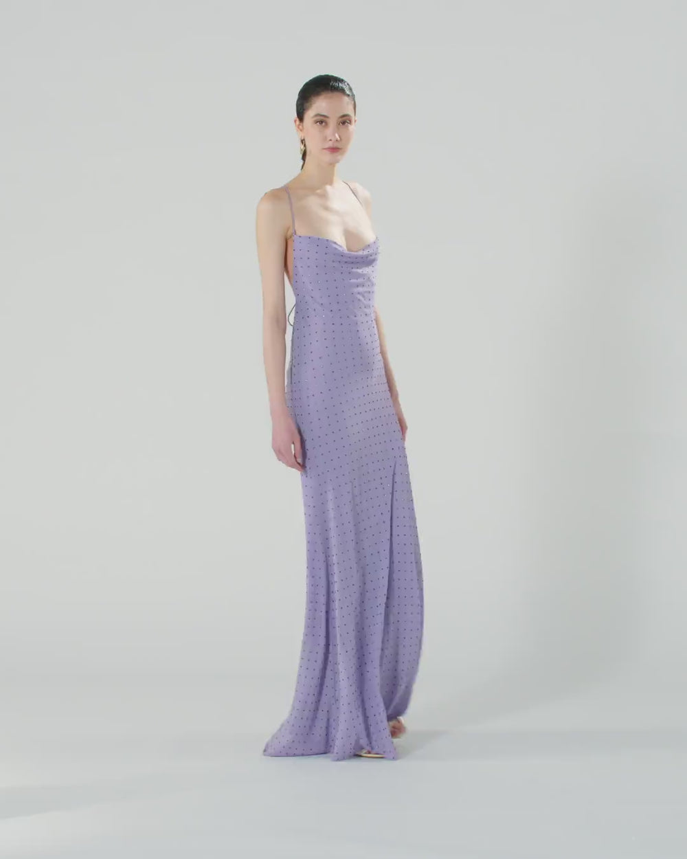Long slip dress with spaghetti straps, loose neckline with draping at the front and back-revealing wide round neckline at the rear, punctuated only by two ribbons that tie in the middle. Made from georgette fabric with a refined matte finish, which delicately caresses the body and delivers a light, fluid silhouette, this model is embellished with shiny rhinestones dotted all over in a way that encapsulates PINKO's DNA as a brand. Feminine but with bold character, this dress is destined to become the star or your looks for special evenings and exclusive ceremonies.
