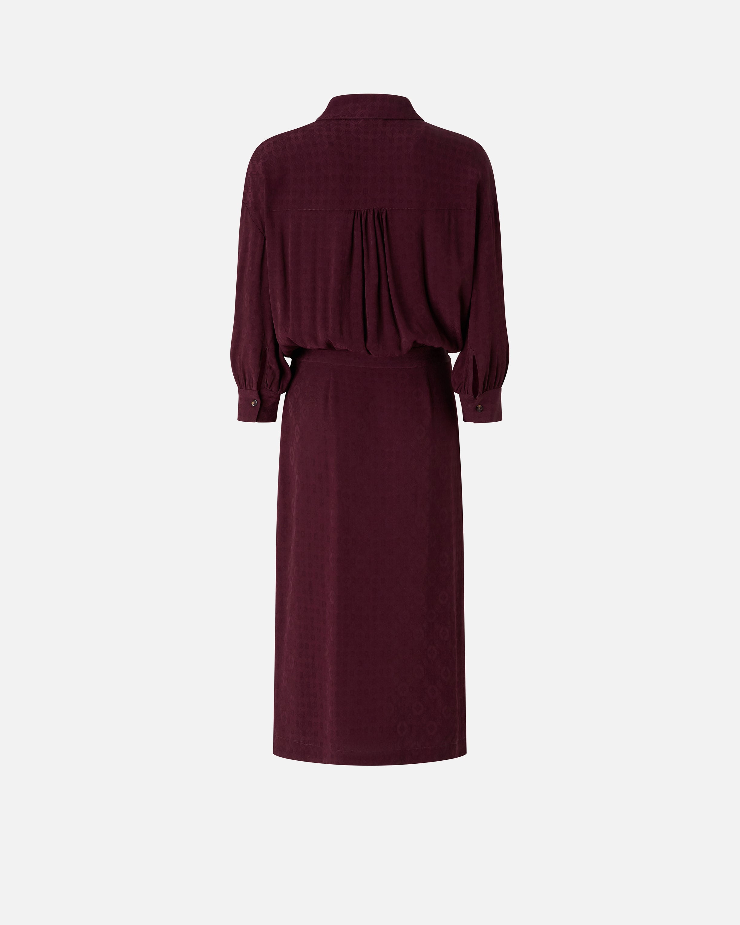 Midi dress in flowing viscose fabric, ideal to follow the silhouette without constricting it, customised with an all-over tone-on-tone jacquard tie-inspired pattern. The style has a softer upper part, featuring a shirt design with classic collar, three-quarter sleeves with button at the hem, front button placket, pointed front yoke and a yoke with central gathers. The skirt, meanwhile, stands out for its slimmer cut and wrap closure complete with integrated belt to be tied with a bow at one side. Thanks to its versatility, this dress lends itself to being worn on different occasions: just change your shoes and accessories to adapt it to more formal events or casual evenings in company. - ALAINA DRESS