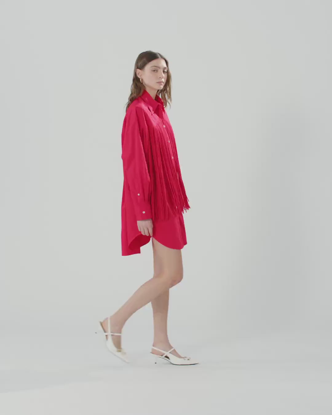 Straight-cut mini shirt dress with long sleeves, shirt collar, front button placket and buttoned cuffs. This model is made from pure cotton poplin with a cool, crisp feel and features long, tubular fringes in lightweight cotton voile, applied by hand to the front yoke in a nod to classic Texan style. The dress is complete with the iconic PINKO logo lettering embroidered on the front and a slightly pointed, country-inspired rear yoke with two pleats that lend extra movement.