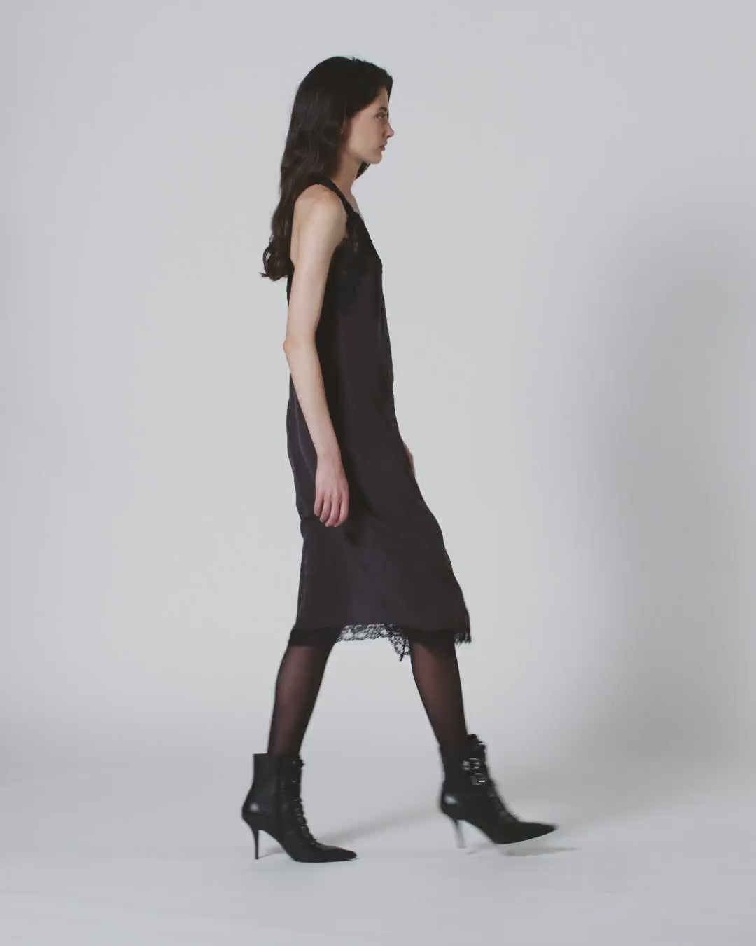 Long lingerie-style dress made of silk crêpe de Chine. The model is trimmed with rebrodè lace details on the bottom, on the diagonal slit on the front and on the straps that cross at the back forming a maxi shoulder strap. The garment offers a loose fit, perfect for not sacrificing comfort. This dress is as elegant as it is versatile: wear it with a pair of flats for a daytime look, elevate your special evening style with a pair of high heels.