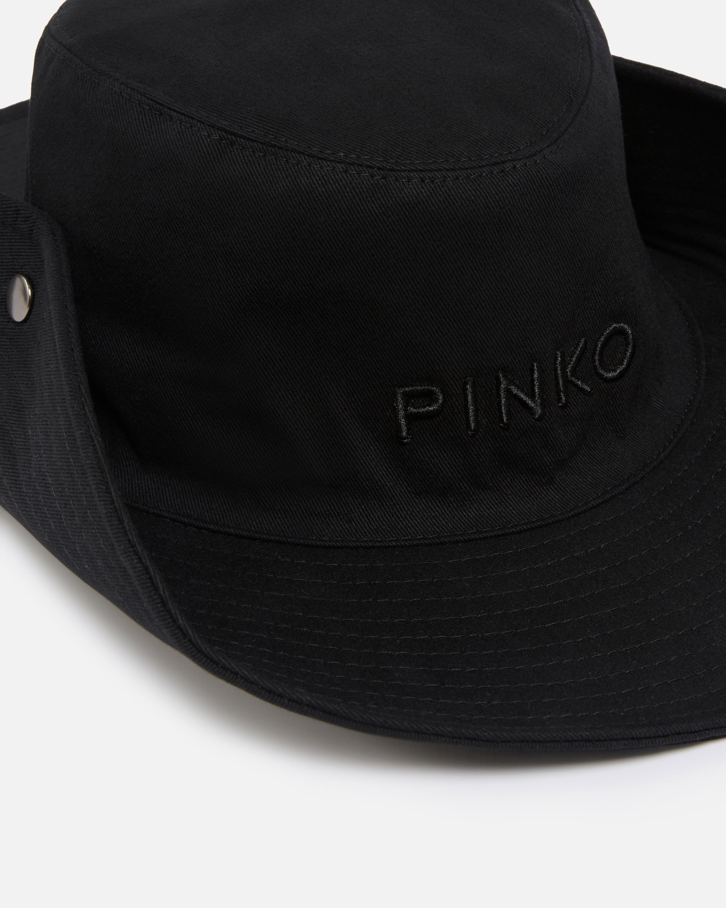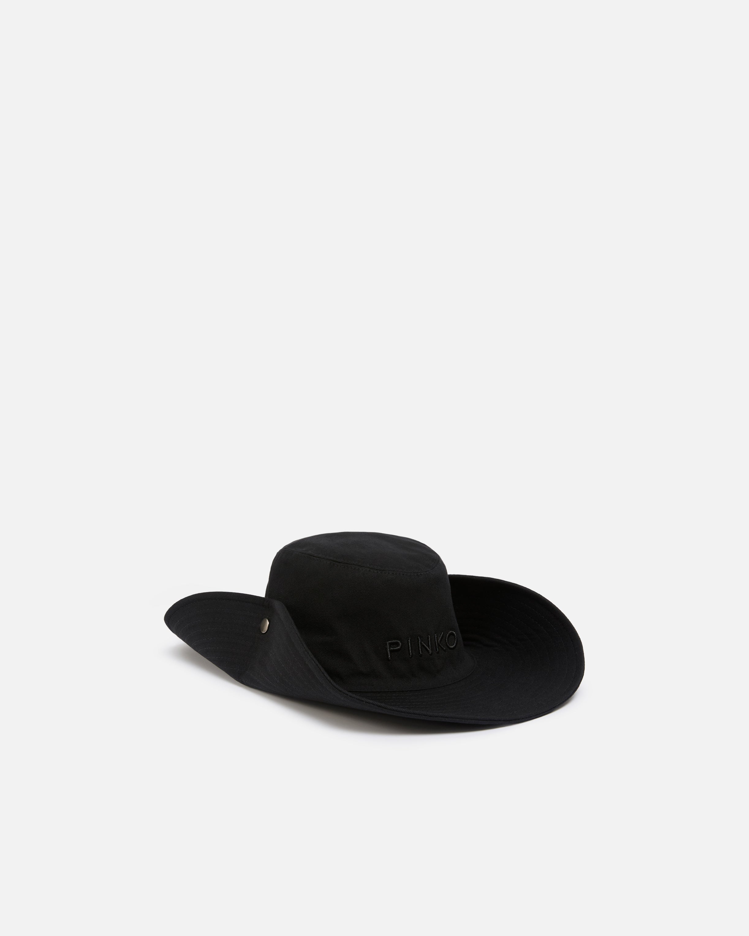 Wide-brimmed hat in pure cotton drill. This model features the iconic PINKO logo lettering embroidered in tonal thread on the front and a stitched brim with snap buttons at the sides that can be fastened to give it a country-like shape.