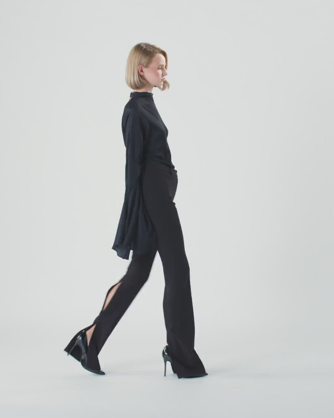 Refined silk-blend crepe de Chine blouse with a soft and light hand. The style features long sleeves complemented by a wide insert on the cuffs that adds movement and elegance, and is embellished by a deep V-neck on the back that adds a touch of femininity and contemporaneity to the minimal design. Thanks to its versatility, this women's blouse will accompany you on the most special or formal occasions, for example paired with a sophisticated suit.