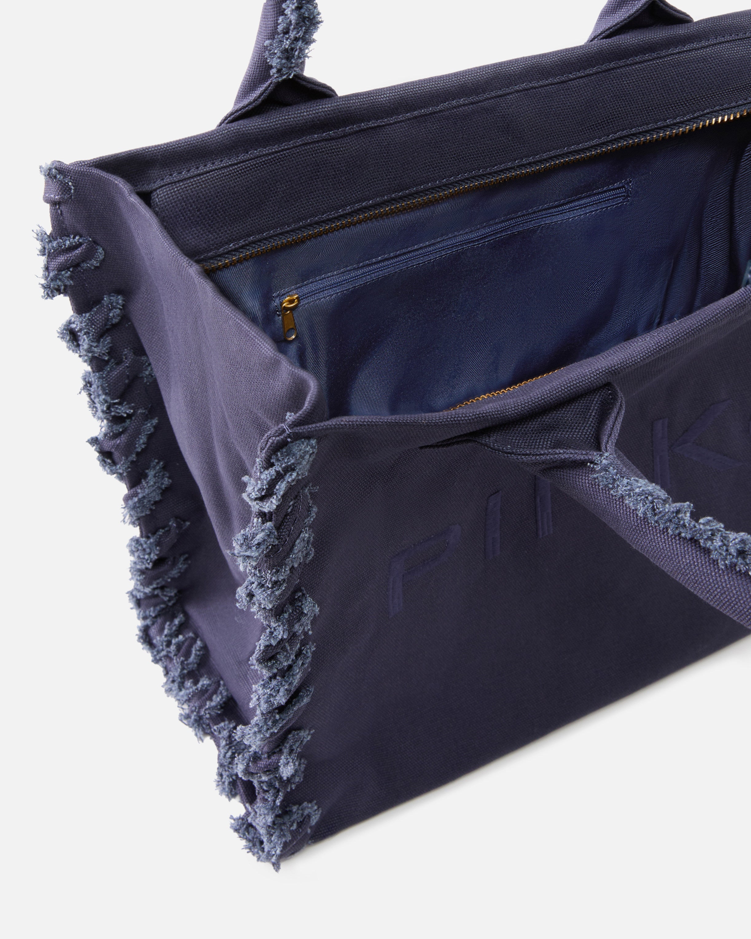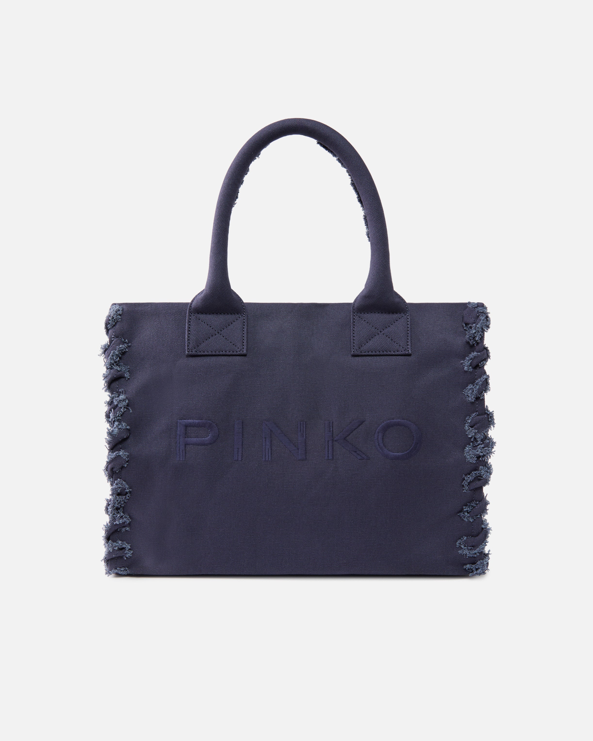 Medium-sized Beach shopping tote with slightly elongated rectangular shape, made from canvas and customised with tonal PINKO logo lettering embroidered on the front. This model, perfect to use as a beach bag, is enhanced by a twisted and slightly frayed-effect embellishment on the side edges, and features a top handle with frayed inner edges for hand or shoulder carry. The zip fastening opens to reveal a cotton drill-lined interior featuring a convenient slip pocket. Activate your PINKO accessory: verify the authenticity of your product and access a personalised experience by scanning the Love Birds embroidery on the back with your smartphone!