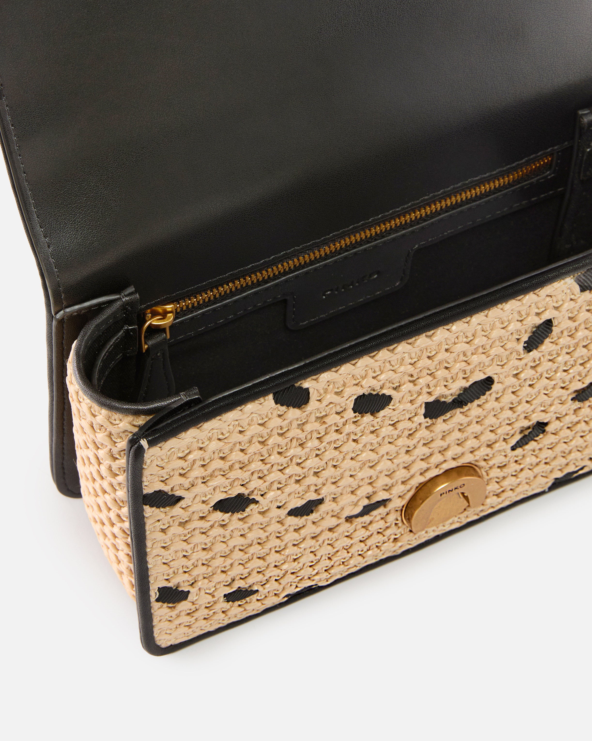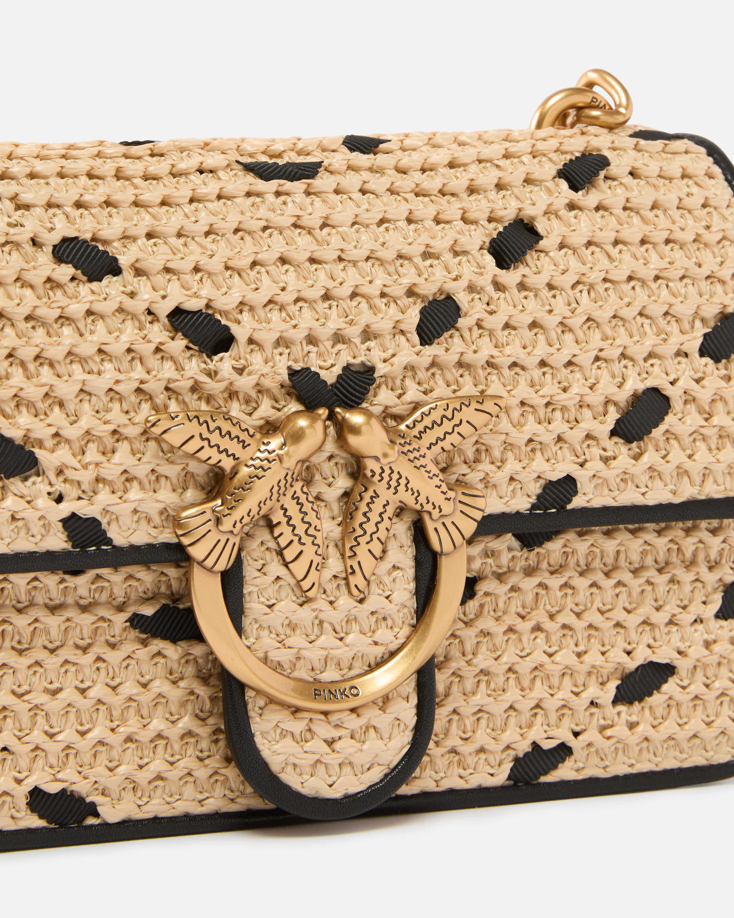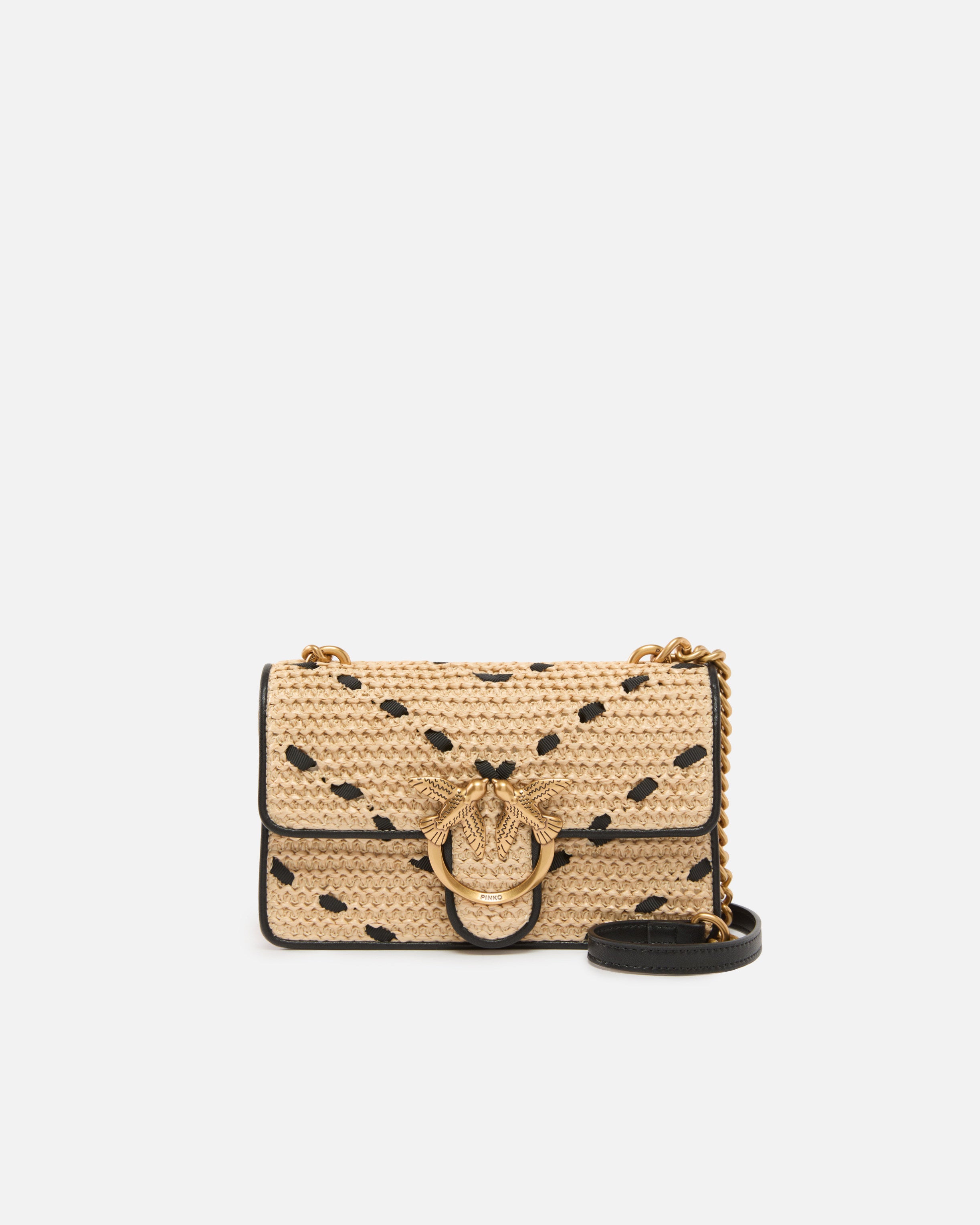 Mini Love Bag One Light small, lightweight bag in woven raffia with a distinctly summery feel, decorated with a chevron pattern in ribbon. This bag, also finished on the outer trims and inside of the flap in soft silky leather, includes a chain strap with rounded wire and a leather shoulder pad, allowing you to carry it in three different ways: by hand, crossbody and on the shoulder. The magnetic button fastening is complemented by the iconic Love Birds Diamond Cut buckle and reveals a cotton drill-lined interior, featuring a slip pocket with logo label and zip. Activate your PINKO bag: verify the authenticity of your product and access a personalised experience by scanning the Love Birds embroidery on the back of the bag with your smartphone!