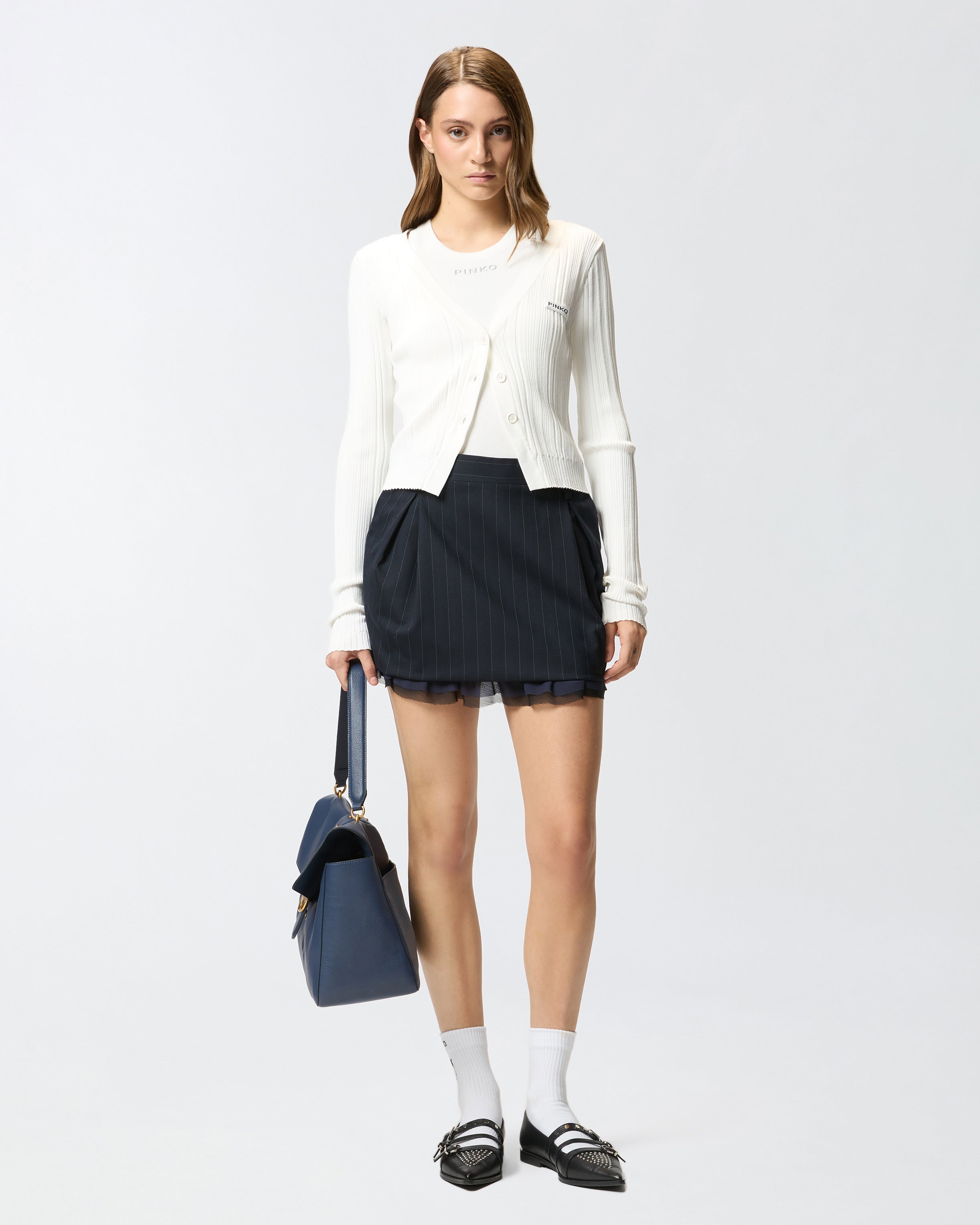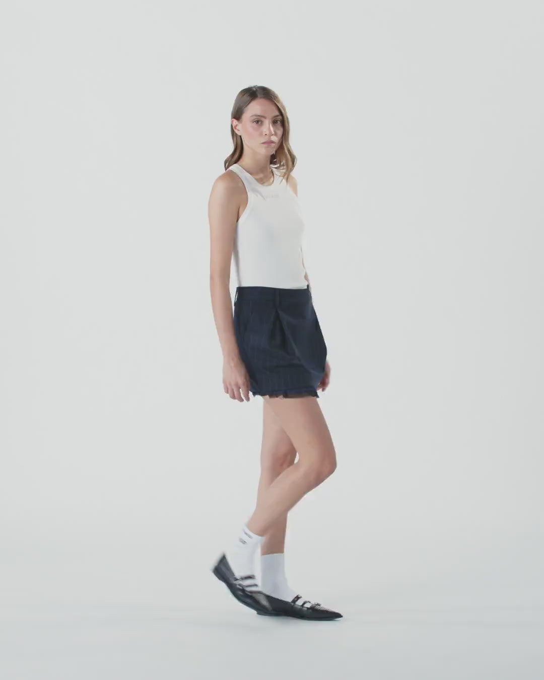 Short skirt lined with a balloon silhouette, highlighted by a soft pleated construction. The fabric used is a classic poly wool pinstripe characterized by a change of texture and light to emphasize the design of the material. The waist is equipped with comfortable belt loops, while the bottom is raw-cut for a lighter and more fluffy final effect. Invisible zip closure on the back. Combine the miniskirt with the jacket of the same pattern for a truly original total look that is impossible to forget.