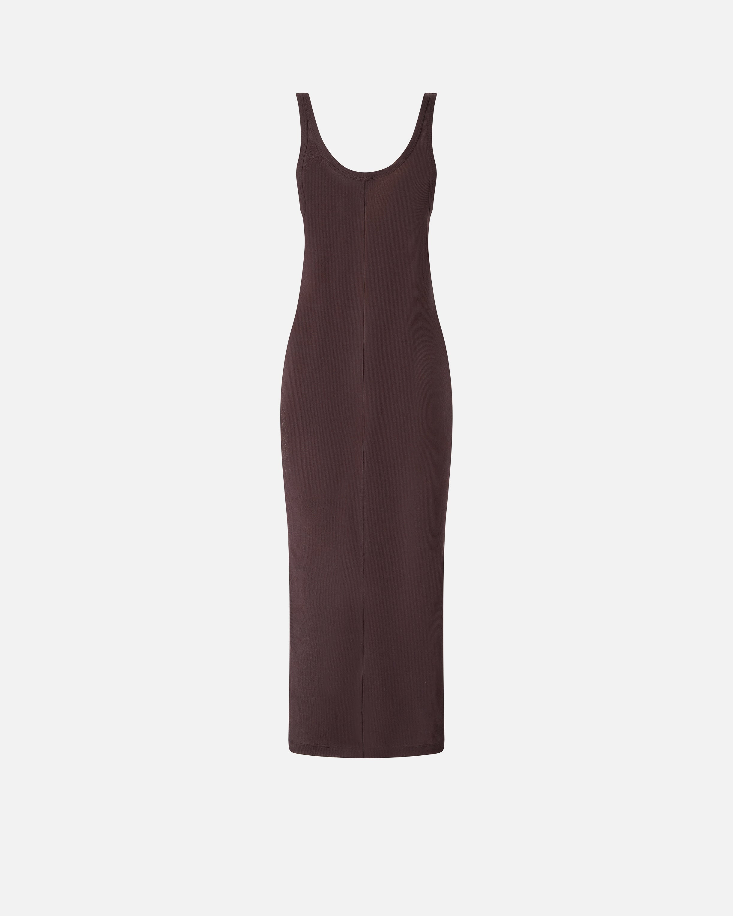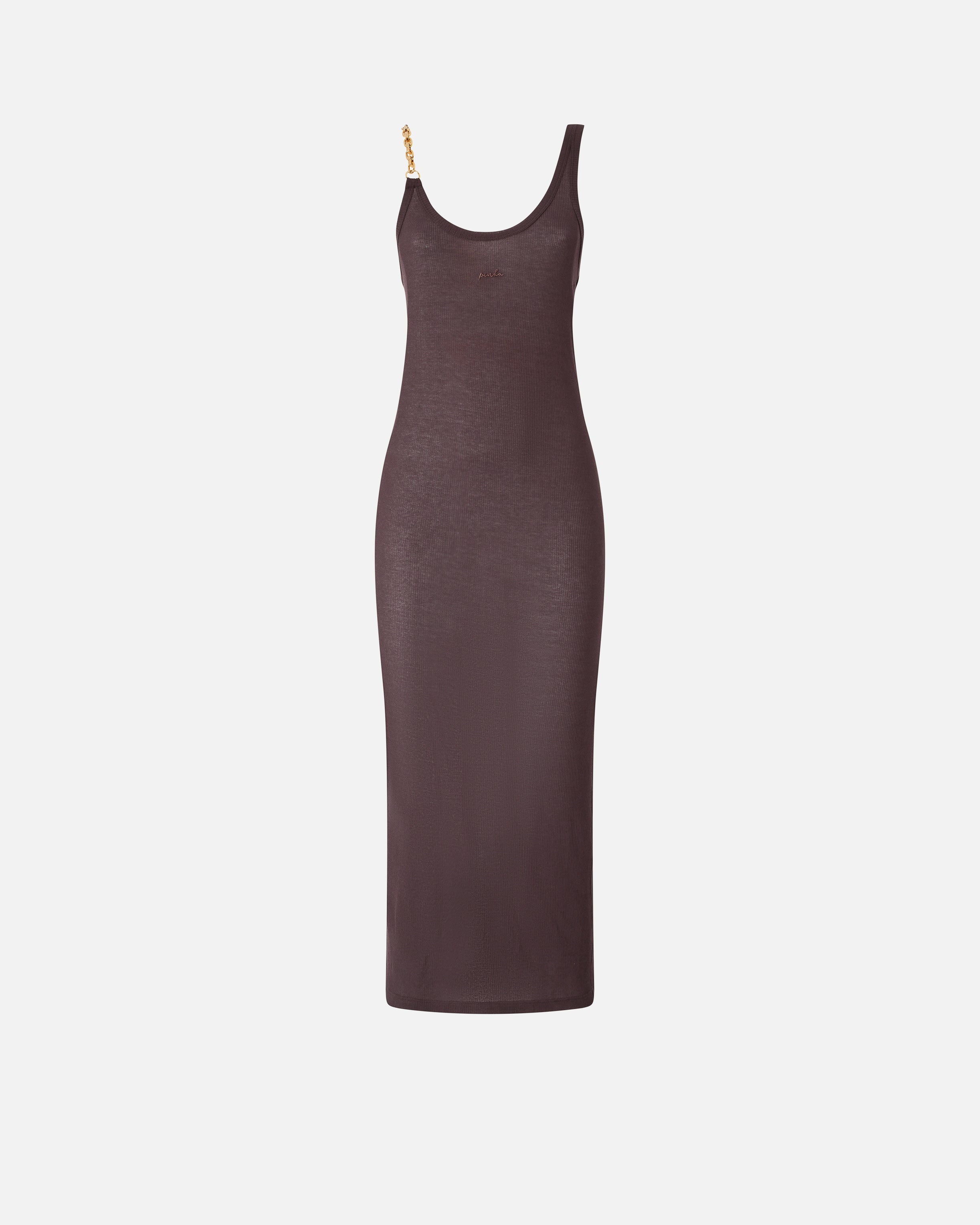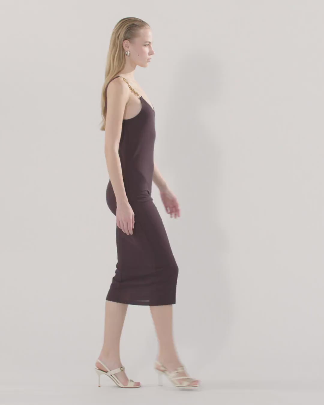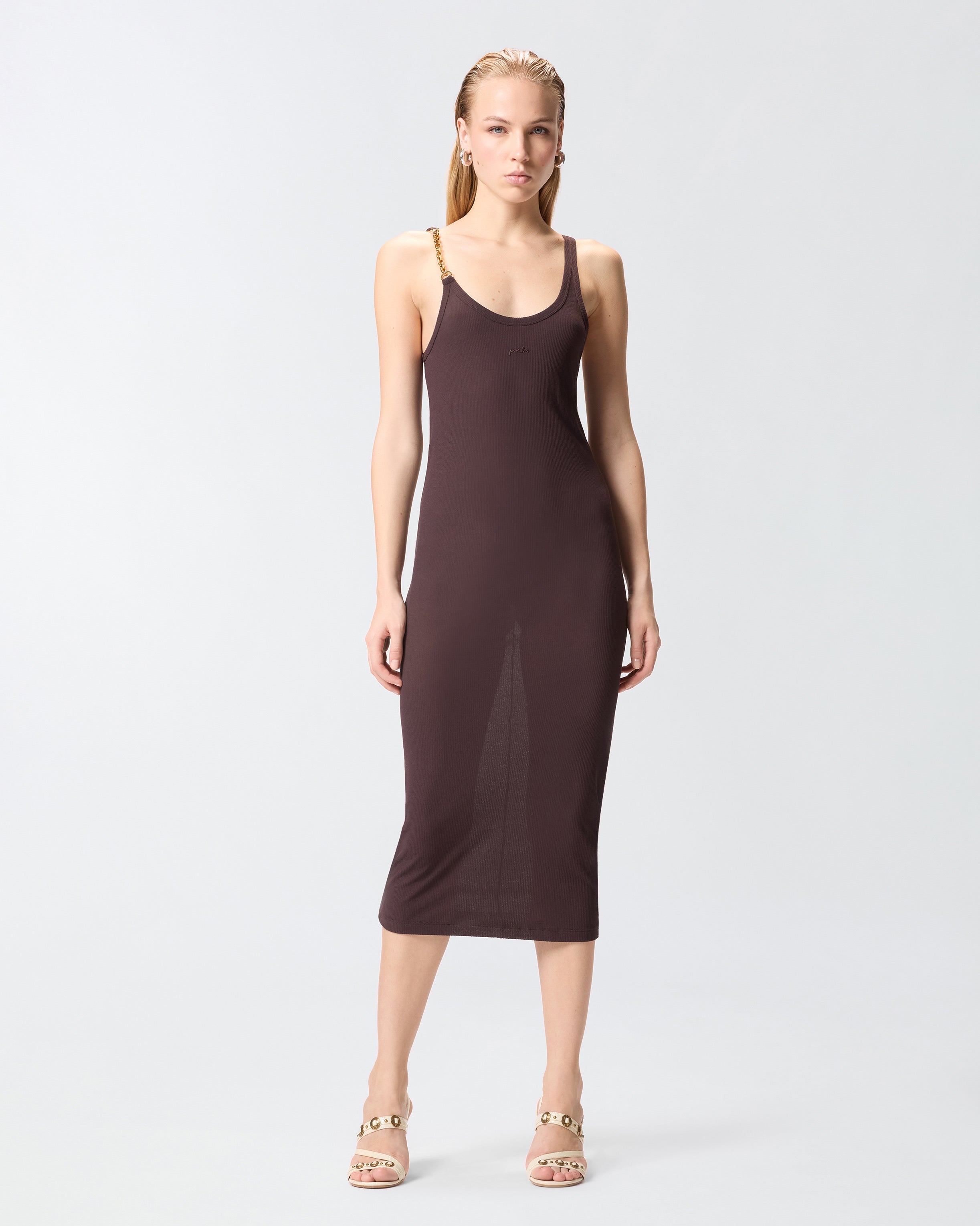 Sleeveless midi dress with slim-fitting sheath silhouette, made from ribbed crepe fabric that caresses the body. The sensual allure of this piece, accentuated by the wide round neckline at the front and back, is given an edgy touch by the chain detail adorning one of the shoulder straps and customised with tonal PINKO logo lettering on the front. This dress is ideal for a feminine daytime look with a pair of low shoes or a special-evening outfit with a pair of pumps.