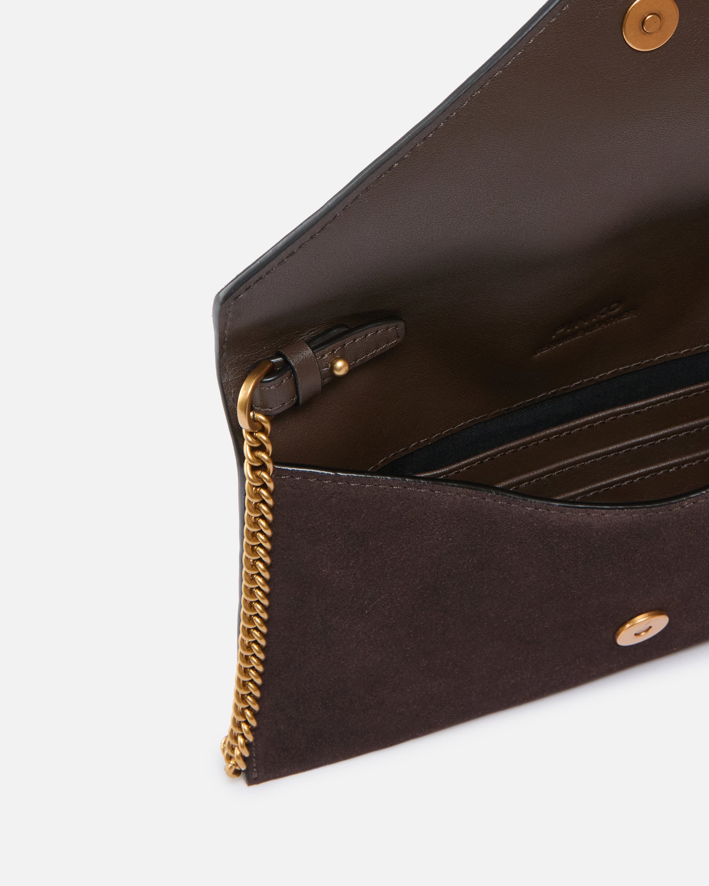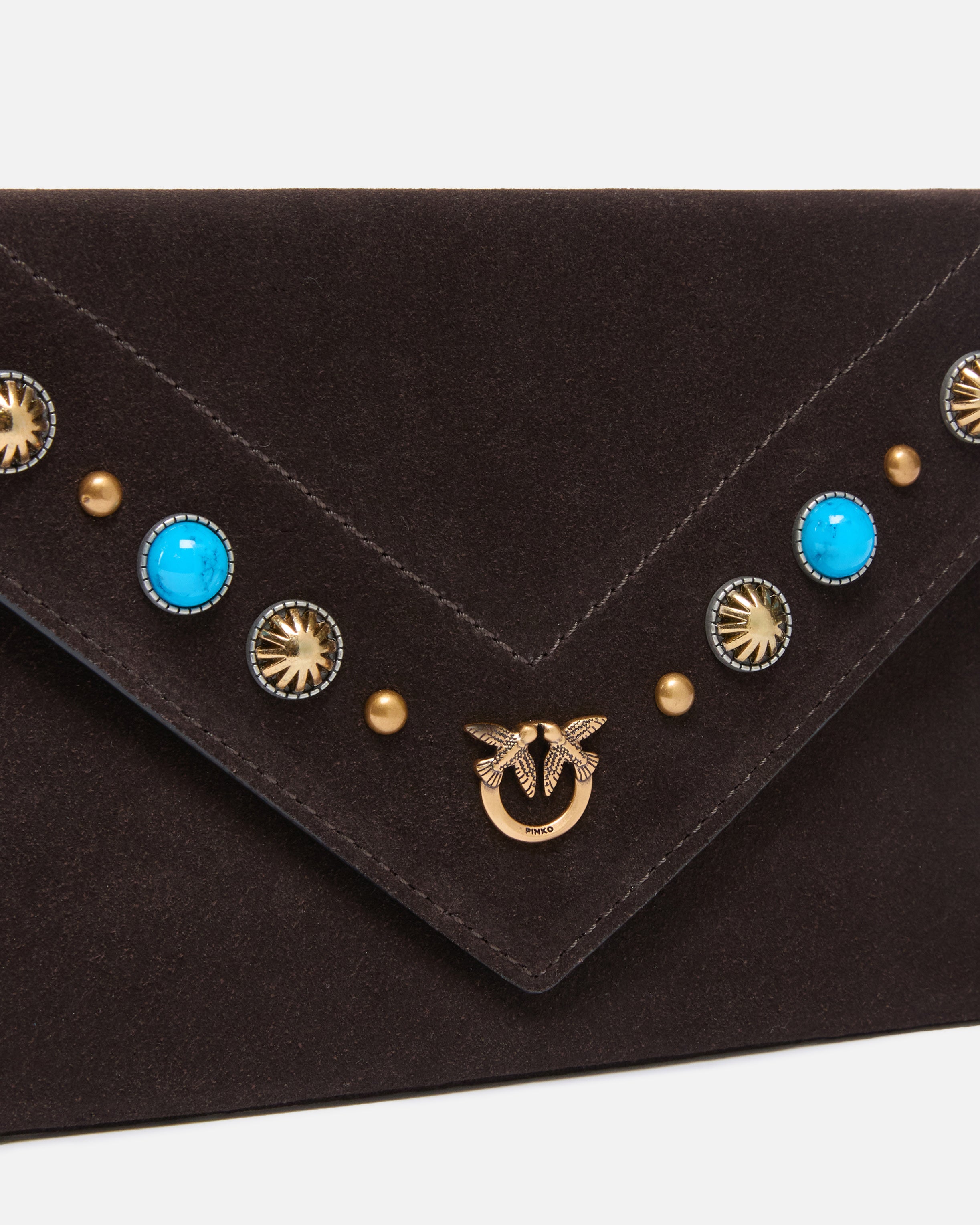 Small flat clutch bag in soft suede leather, decorated with the iconic Love Birds logo at the magnetic closure and an alternation of metal studs and turquoise stones along the edge of the flap. Equipped with a thin, removable chain shoulder strap for wearing on the shoulder or carrying by hand, the accessory features a cotton drill-lined interior complete with slip pockets for holding cards and documents. Activate your PINKO bag: verify the authenticity of your product and access a personalised experience by scanning the Love Birds embroidery on the back of the bag with your smartphone!