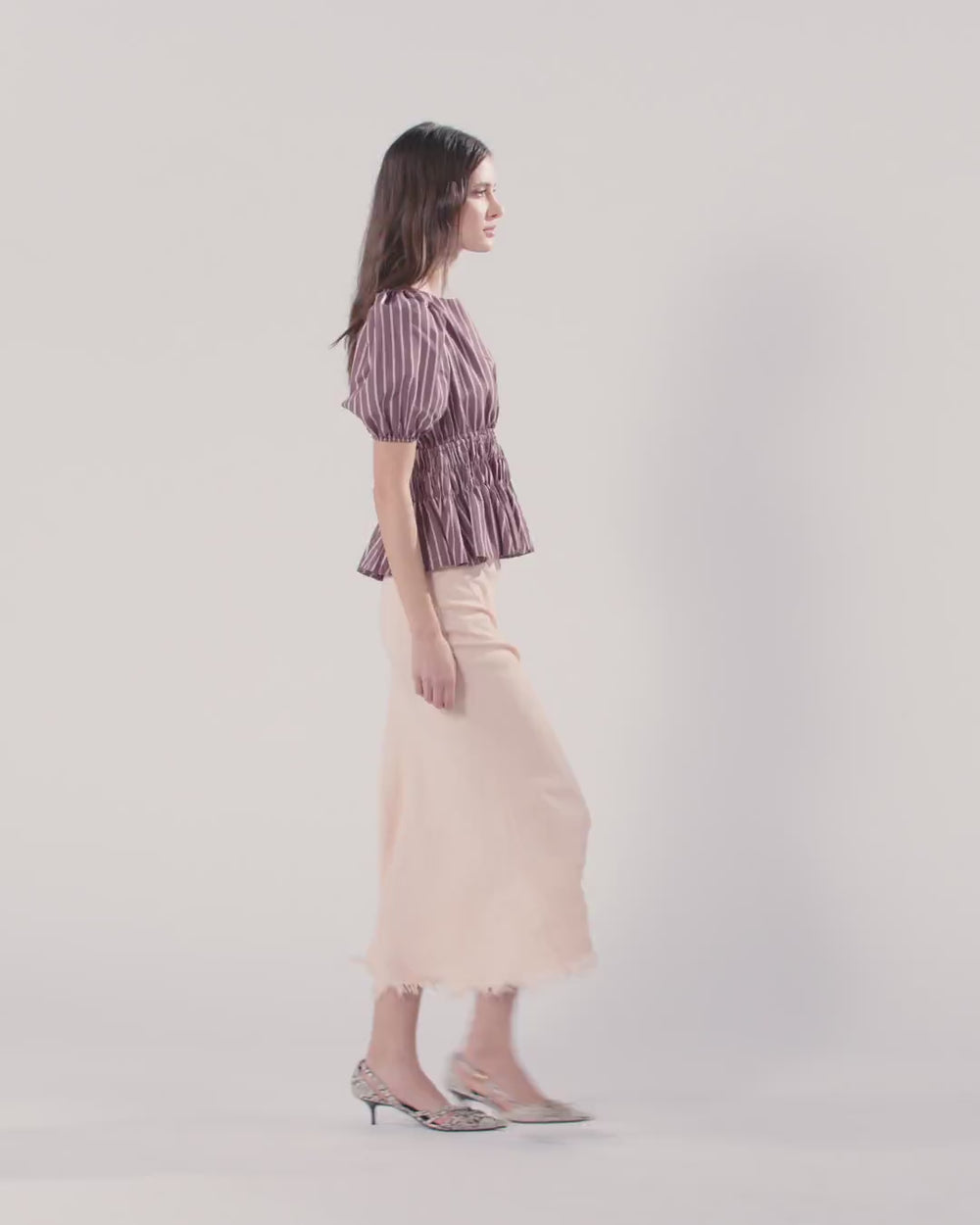 Cropped top with a round neck at the front and large puffed sleeves with an elasticated hem. Made from a fluid, yarn-dyed viscose fabric with a vertical striped pattern, the garment is made special by a ruched waistband that gives way to a soft ruffle at the hem, and by the back, featuring ties to fasten behind the neck and a deep square neckline that leaves the back open. The piece is partially lined to provide extra comfort while wearing. With this top, which pairs perfectly with classic high-waisted trousers or a pair of jeans, it is effortless to create a feminine, refined daytime look with a bon ton–inspired feel.