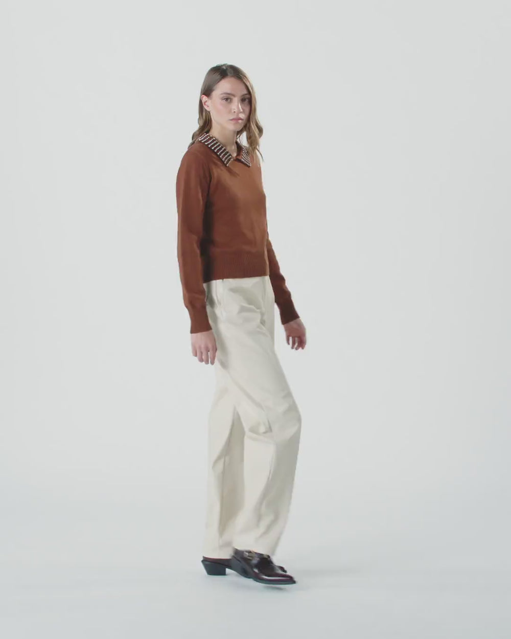 Slim-fitting, long-sleeved sweater with polo-style collar. The collar immediately catches the eye thanks to the rhinestone appliqués that embellish the design. The hem and cuffs are ribbed, while the tone-on-tone label with the PINKO lettering logo stands out on the lower front. The piece has undergone finishing tests to minimise the possible formation of pilling, ensuring greater fabric softness and durability.