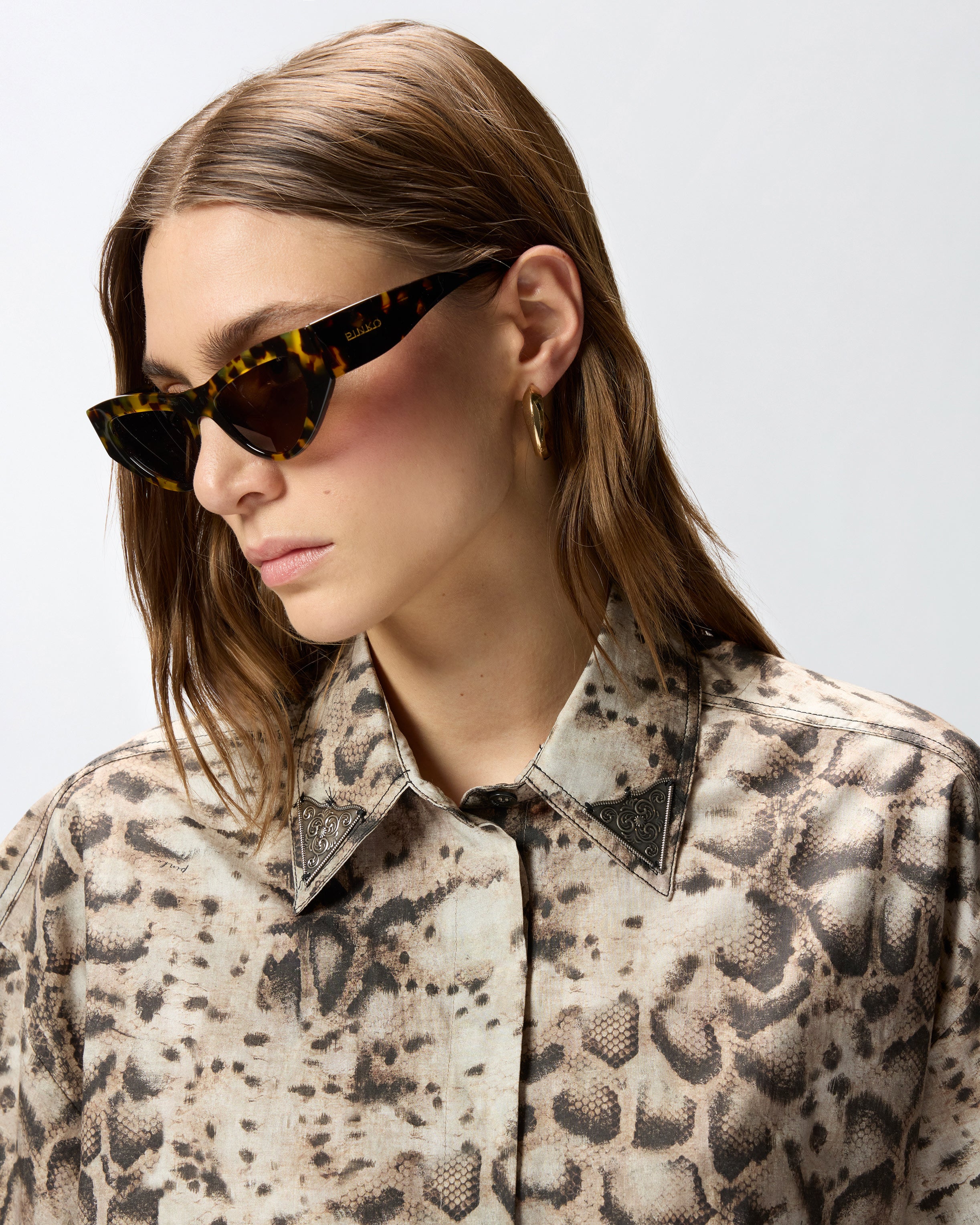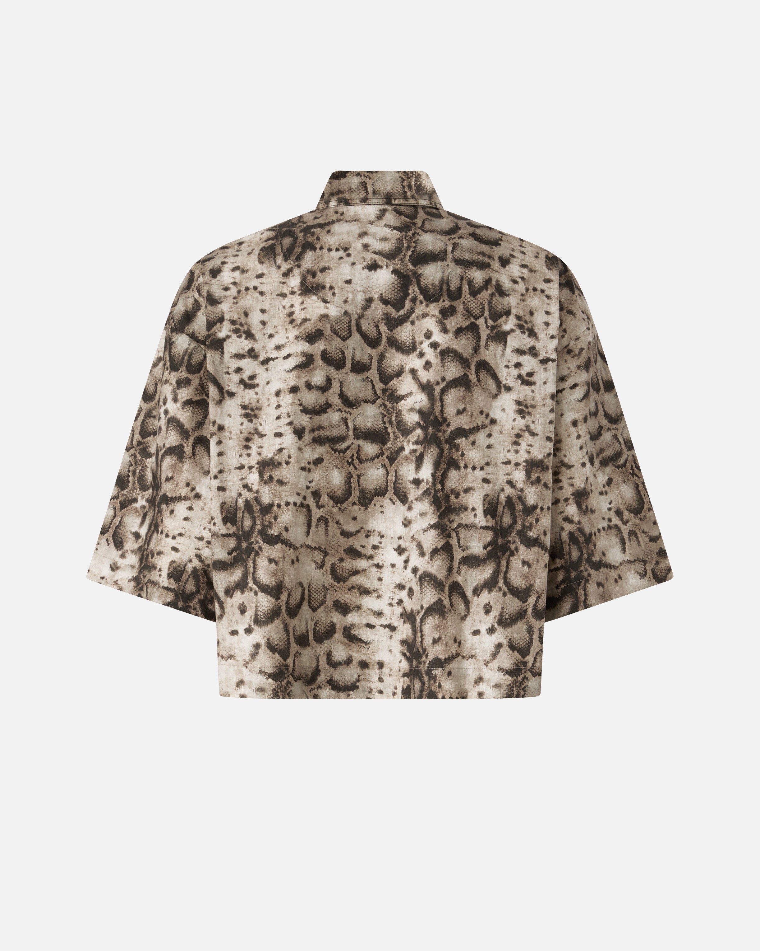 Cropped shirt with wide short sleeves, made from pure cotton poplin with a fresh, pleasant feel. This model, perfect for giving daytime outfits an original finishing touch or creating fresh, relaxed evening looks, is enhanced by carefully designed details that reflect PINKO's character: an all-over floral-inspired print and two finely decorated Western-style metal appliqués on the collar tips. The concealed fastening with only the top button visible completes the garment.