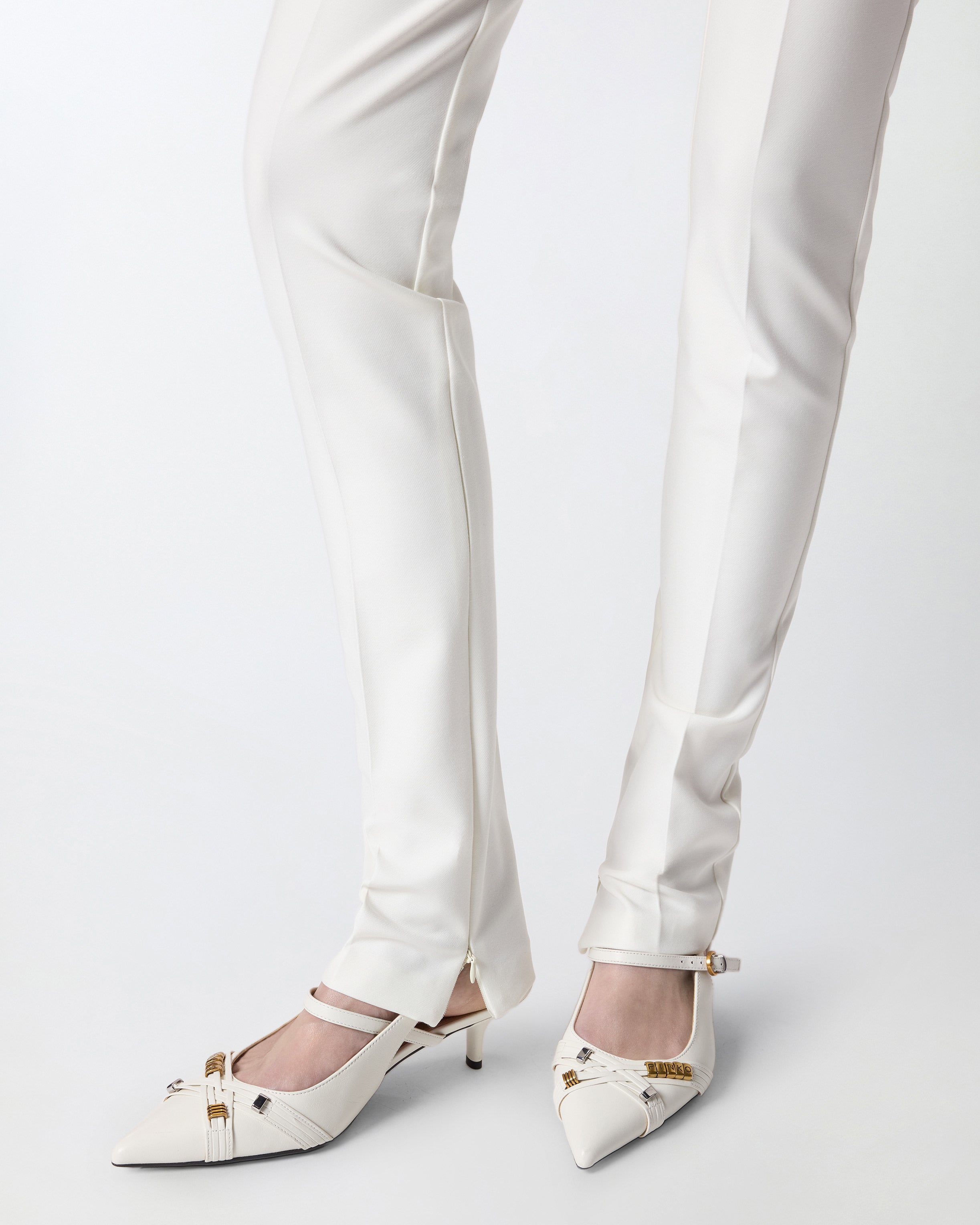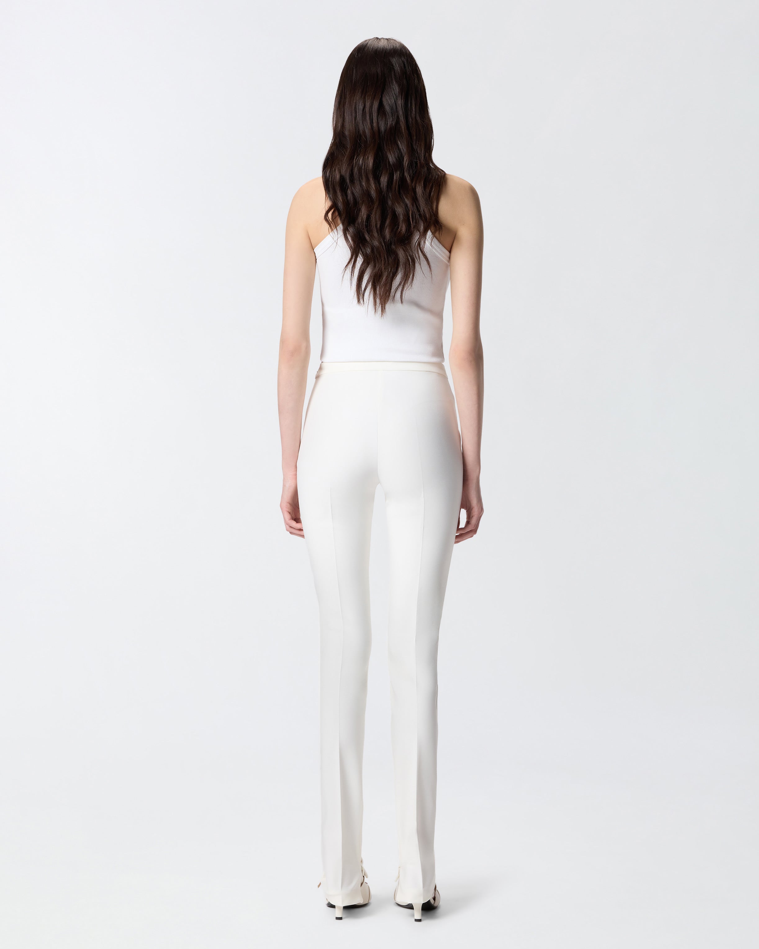 Trousers that speak the language of everyday elegance: the diagonal fabric, with its compact and subtly luminous surface, enhances the leg with a sophisticated visual effect while ensuring comfort. The front crease defines the profile with tailored precision, while the high-waisted cut naturally elongates the silhouette. Pair them with the matching blazer for a high-impact suit, or wear them with a fluid blouse for a refined and versatile look.