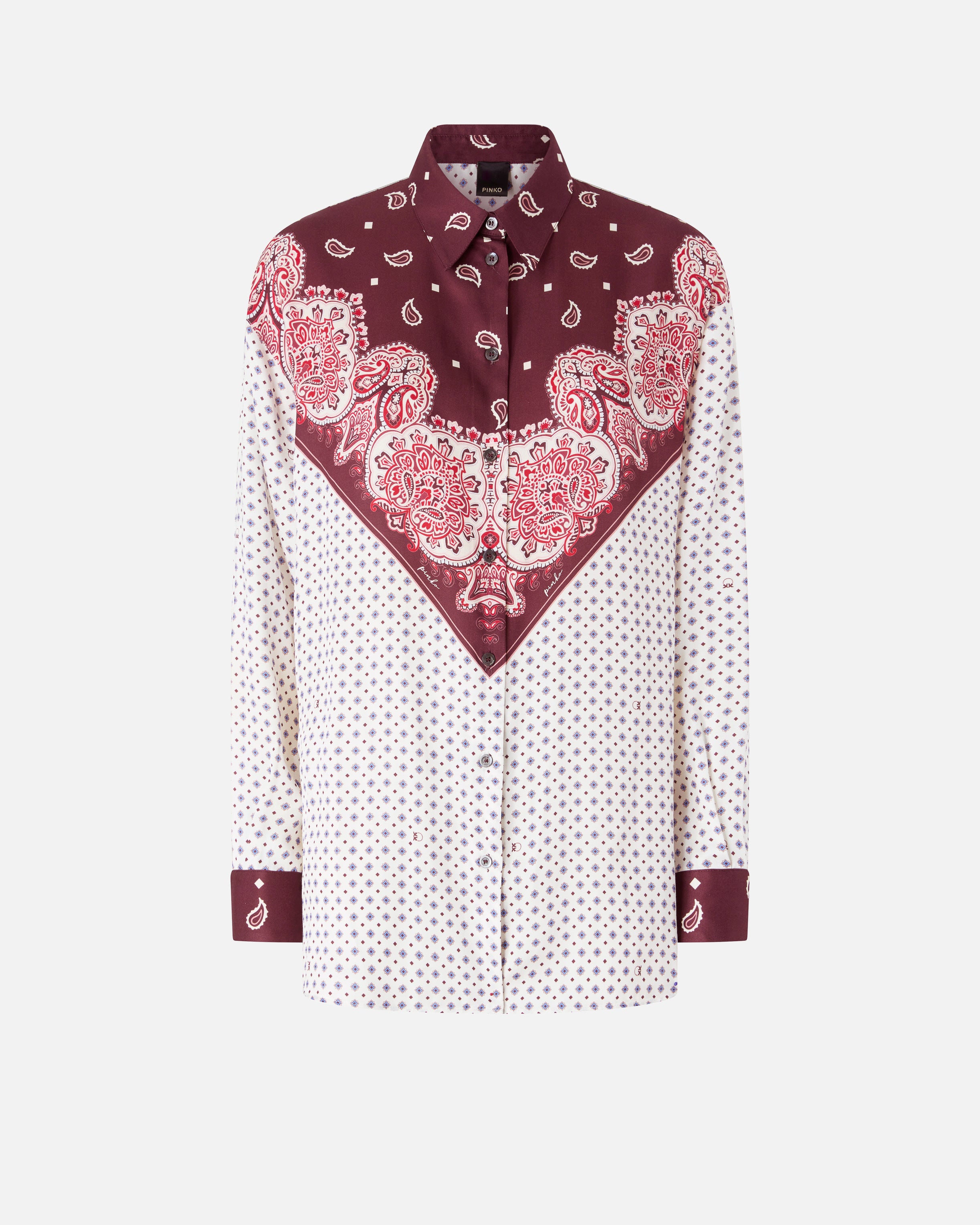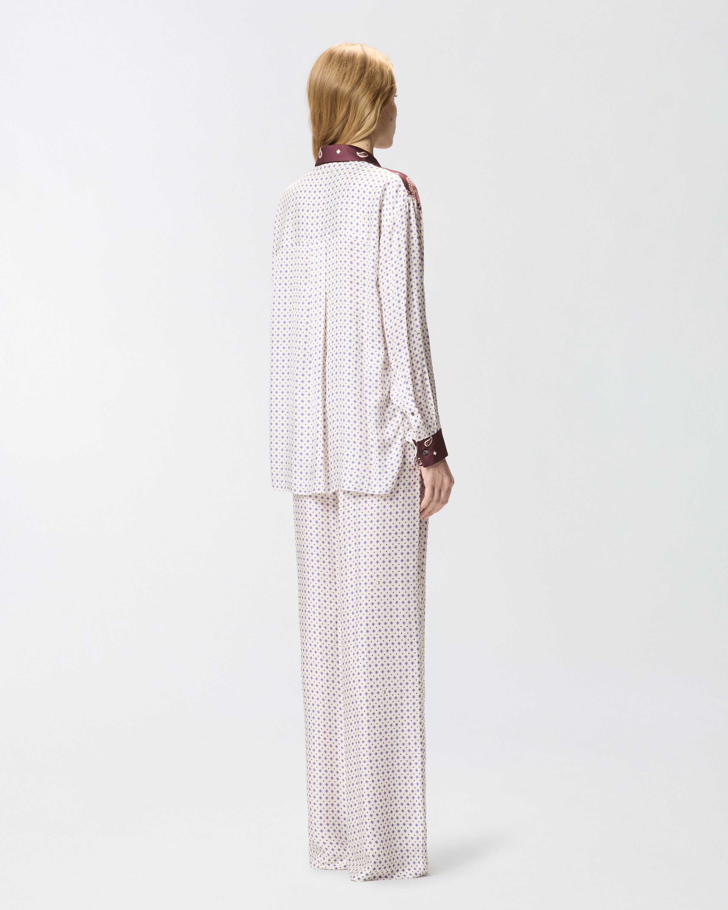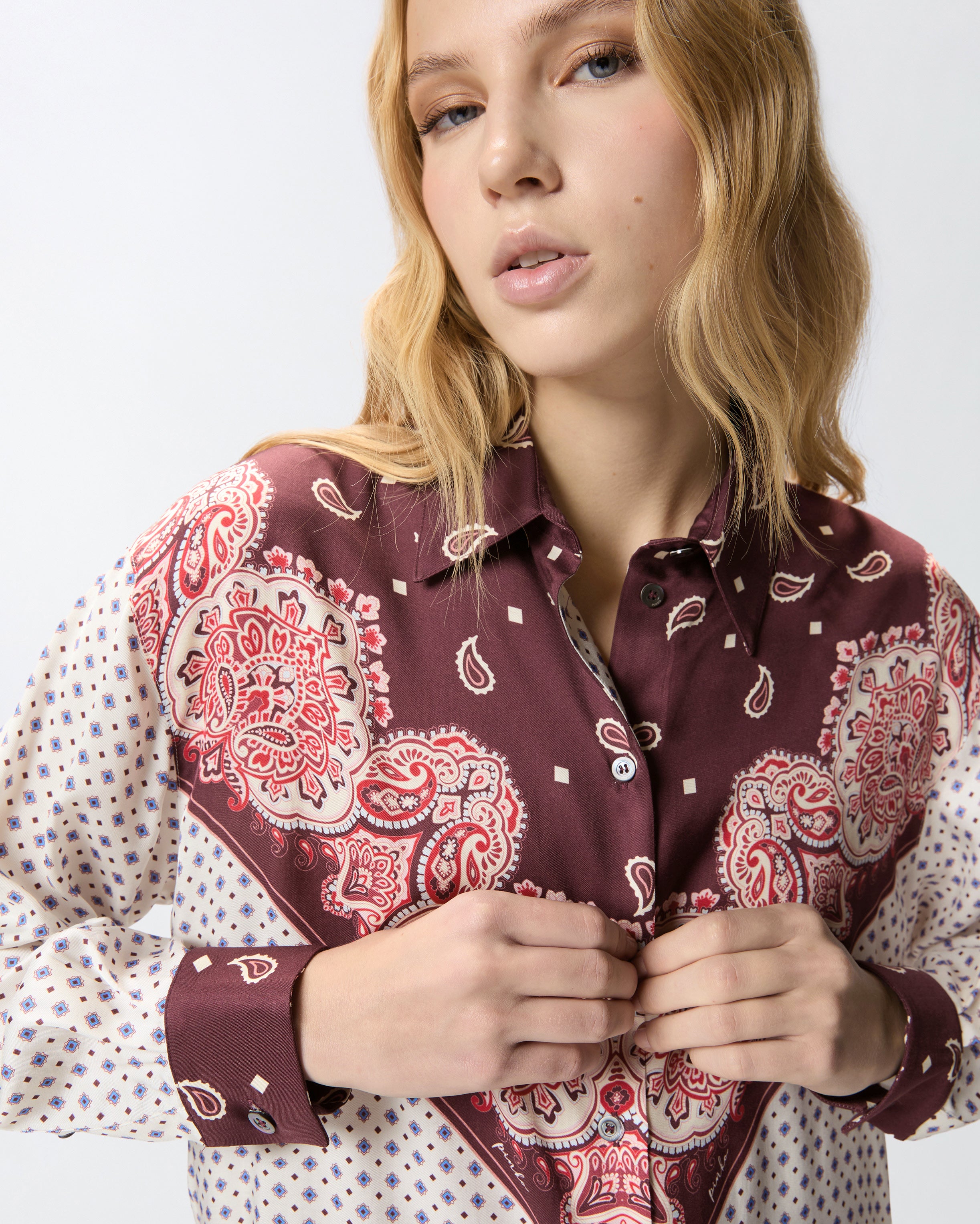 Long, flowing shirt in viscose twill with classic collar, buttoned cuffs, front button placket and rear yoke with two pleats. This model is embellished with a scarf-inspired print featuring an all-over tie-style motif and a contrasting placed print that drapes like a bandana on the front and matches the cuffs and collar. For a head-to-toe look, wear the shirt with the matching trousers in the same pattern.