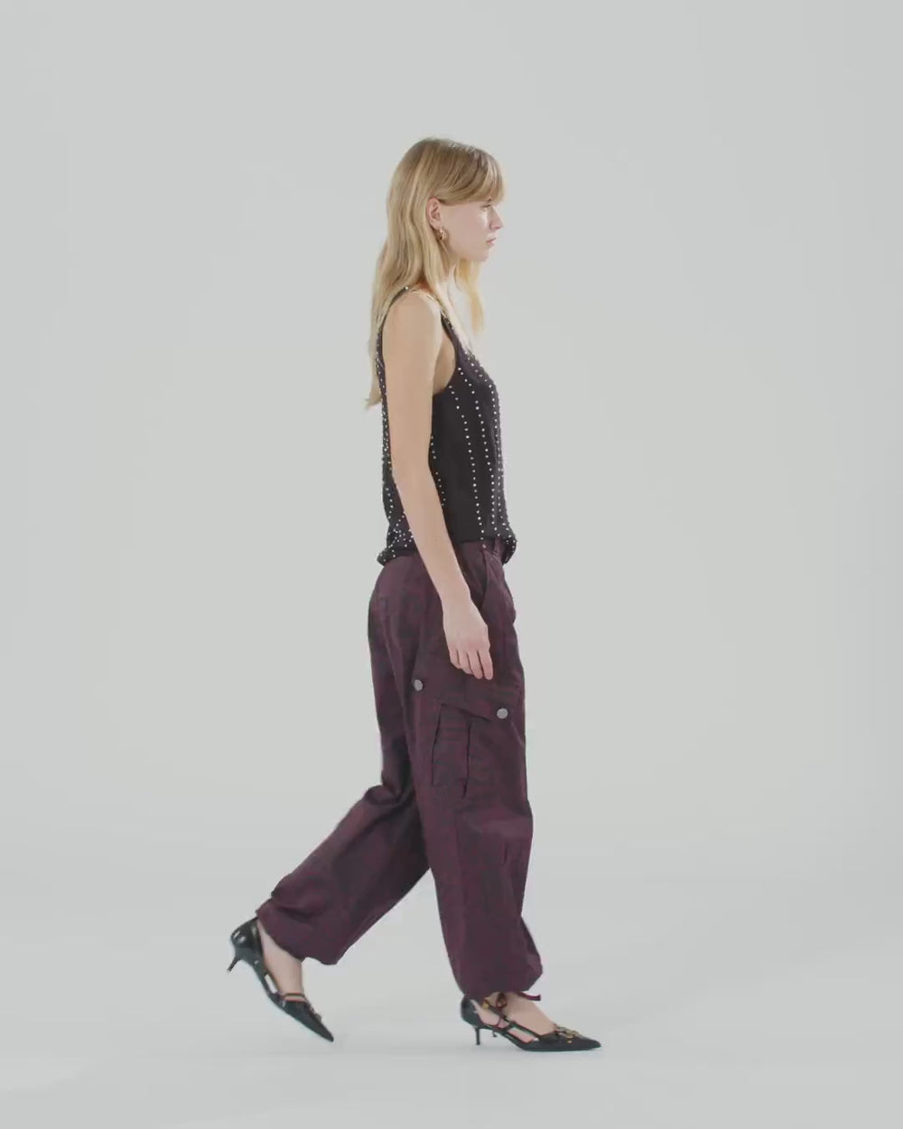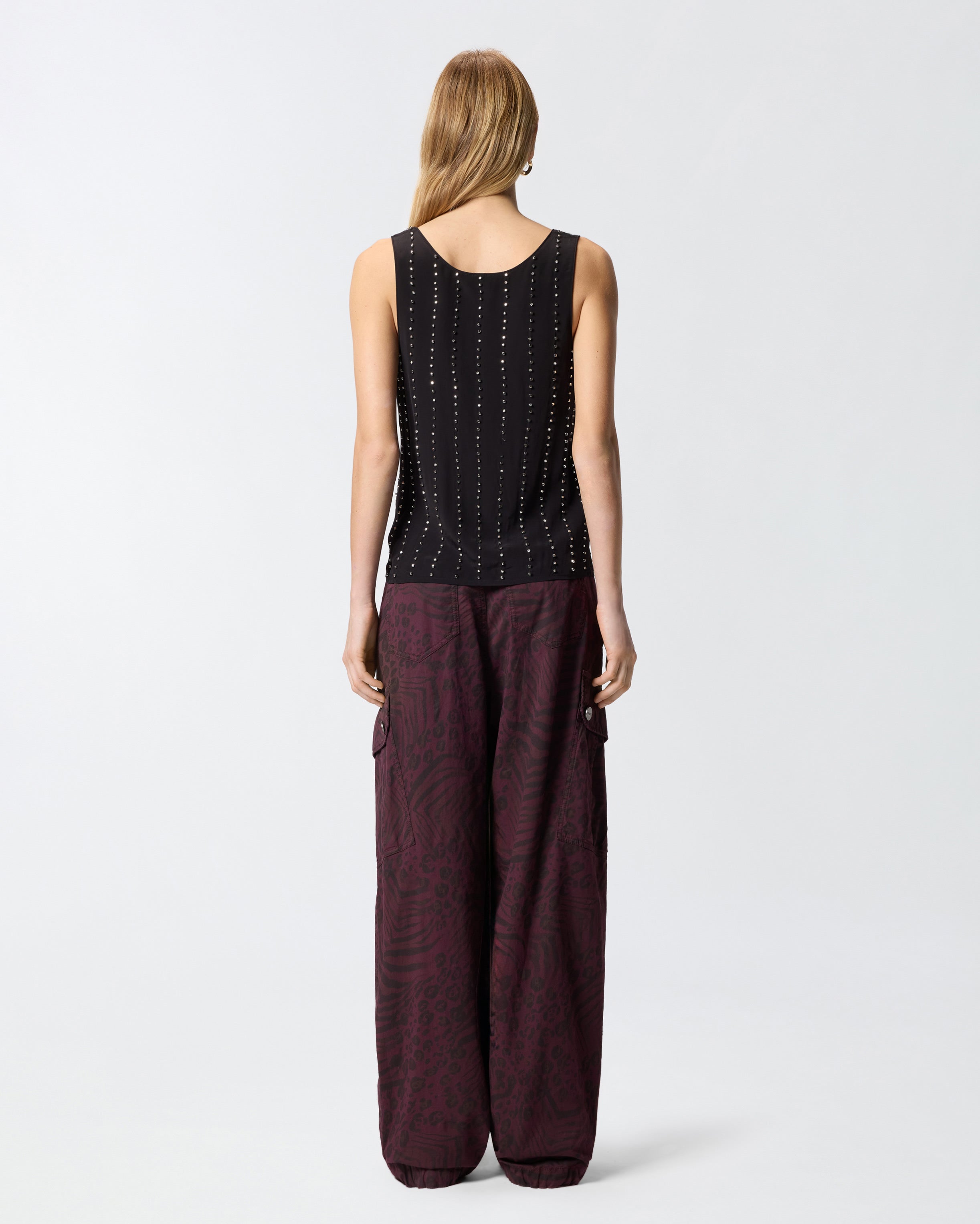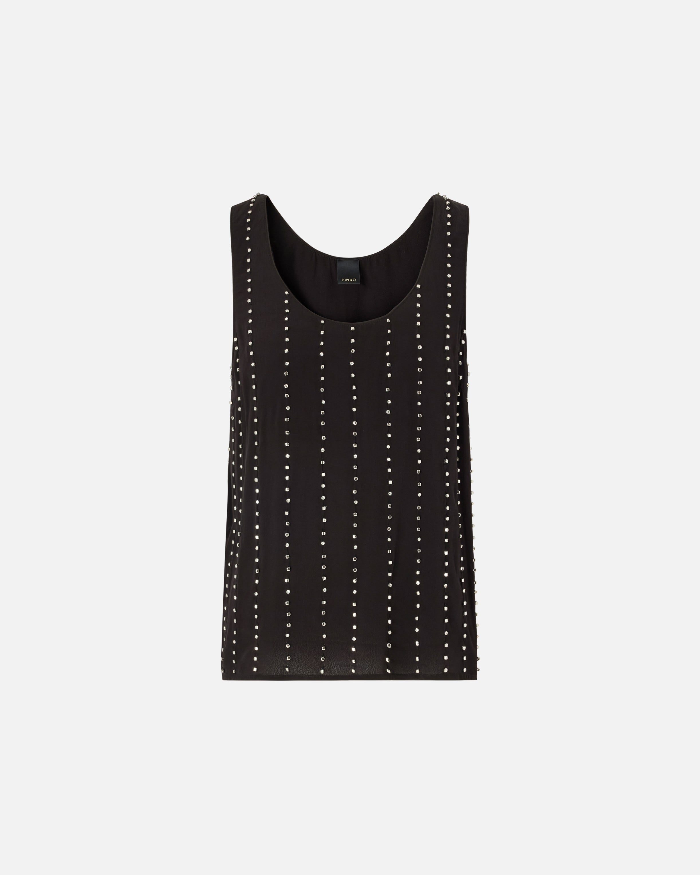 Vest top with a wide round neck, made of viscose crepe fabric with a fluid and flowing feel. Thanks to the striking, pinstripe-inspired motif formed by alternating small cube-shaped metallic elements and hand-embroidered set crystals, this piece is a real gem—literally. Thanks to its versatile yet elegant design, it's perfect to wear under a jacket and with tailored trousers, or with a pair of special jeans.
