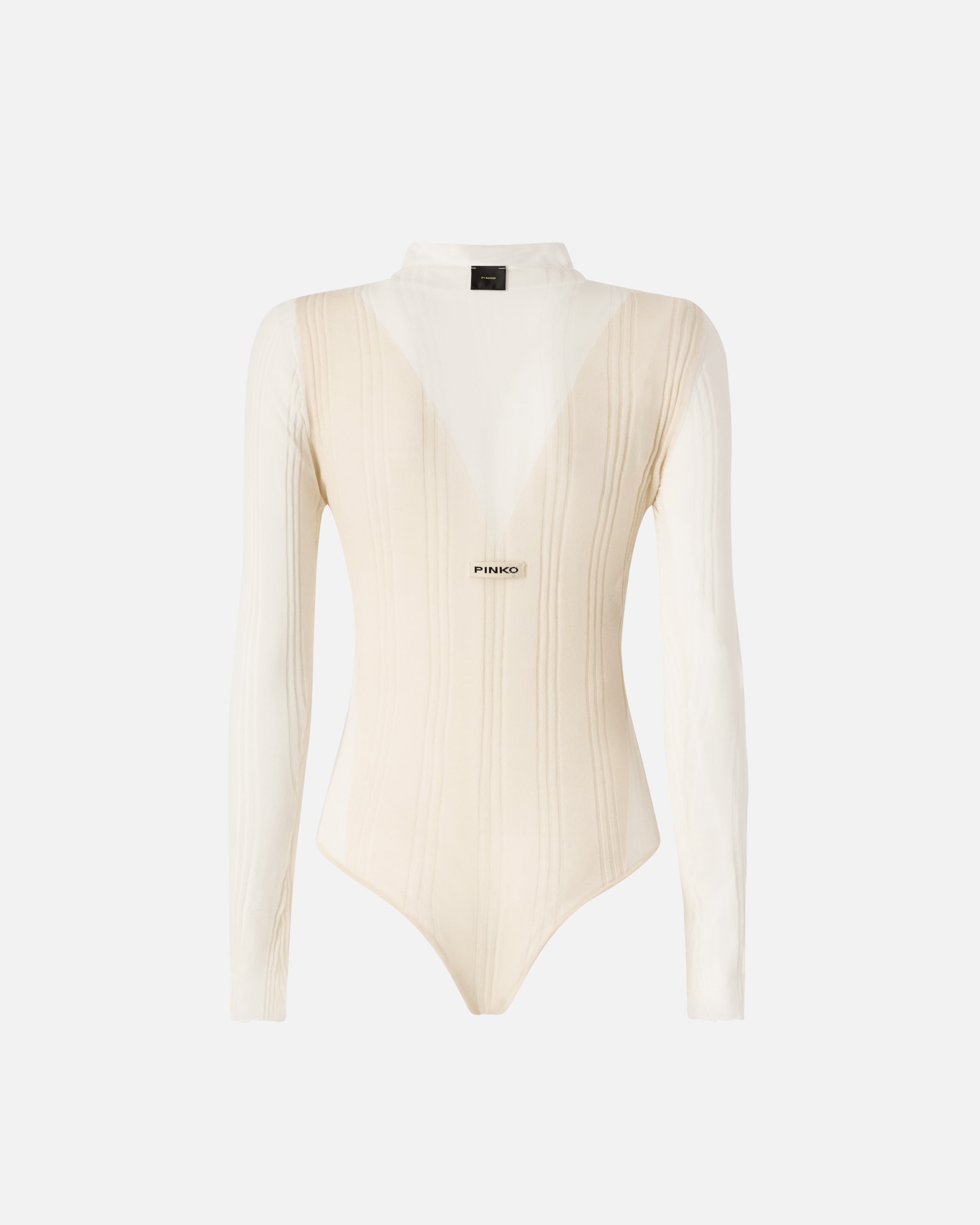 Rib-knit long-sleeved bodysuit made of soft, lightweight wool, silk and cashmere-blend fabric, with sleeves and upper inserts inlaid in cotton-blend fabric with an elegant transparent effect. The final touch is given by the label with jacquard PINKO logo lettering on the back. Understated and contemporary, this model will become a real all-purpose staple in your wardrobe. - DISGELO BODYSUIT