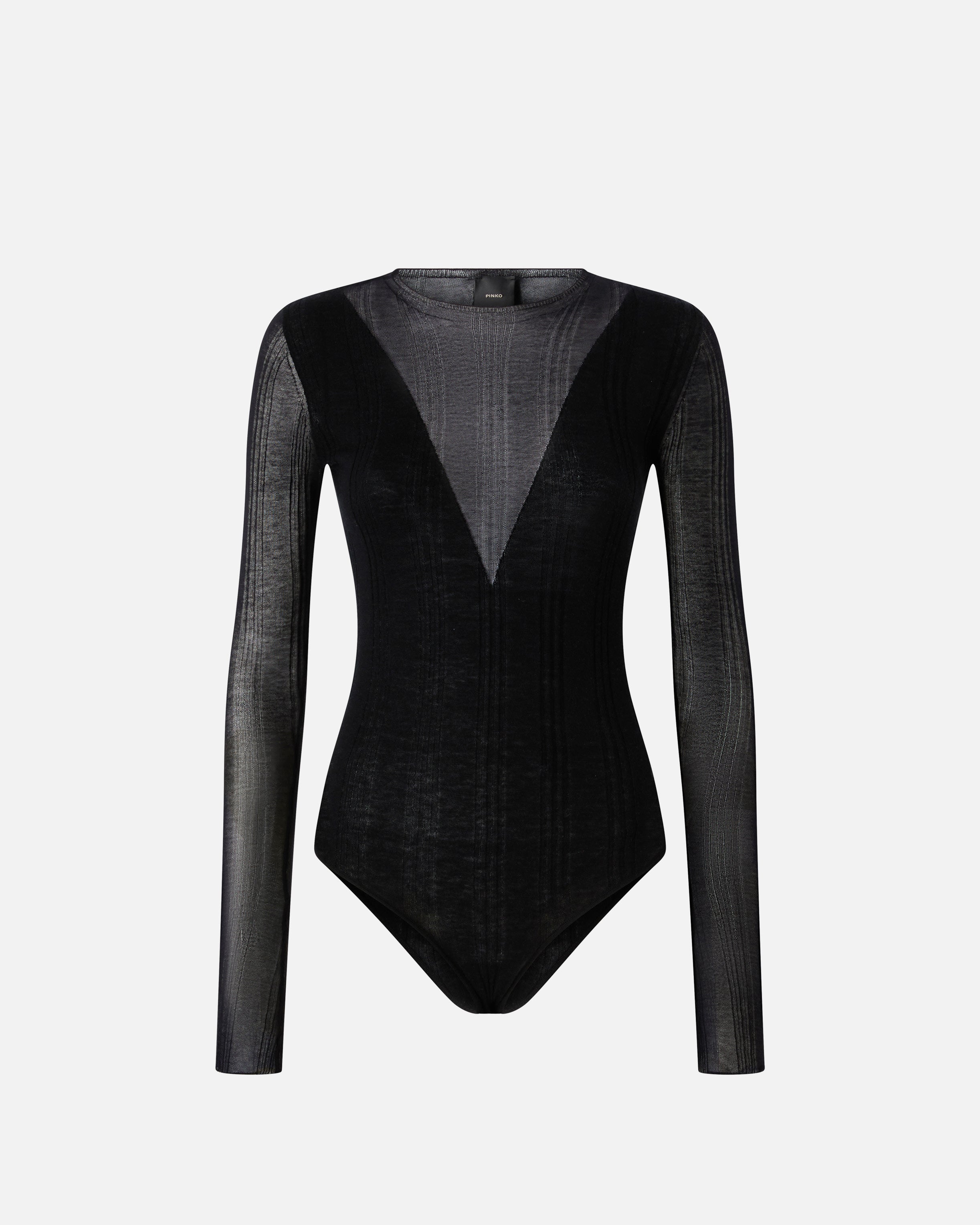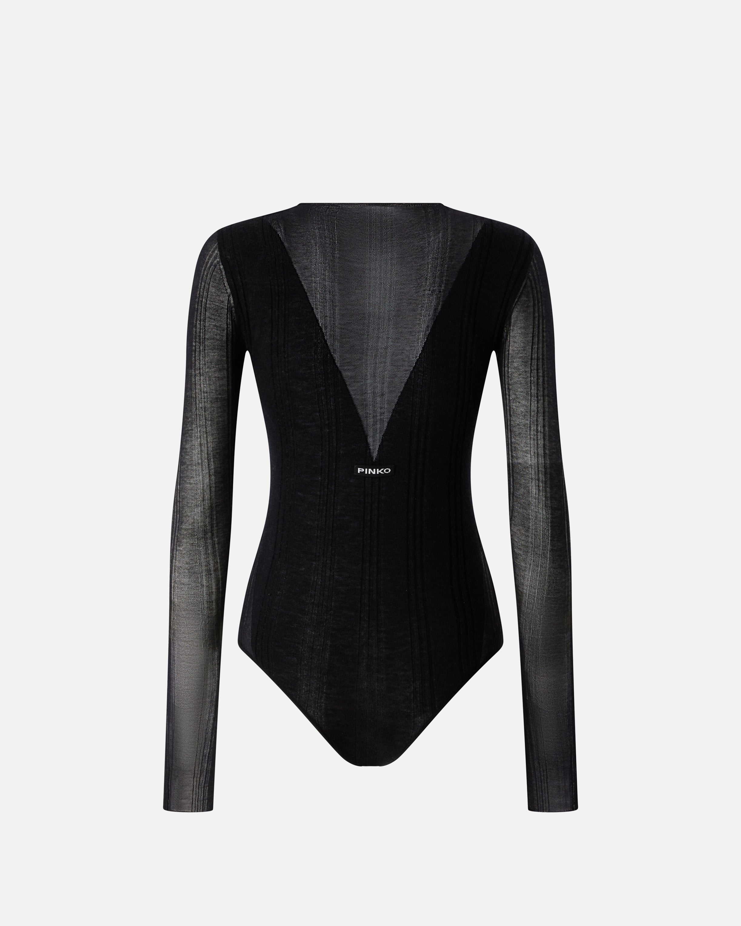 Rib-knit long-sleeved bodysuit made of soft, lightweight wool, silk and cashmere-blend fabric, with sleeves and upper inserts inlaid in cotton-blend fabric with an elegant transparent effect. The final touch is given by the label with jacquard PINKO logo lettering on the back. Understated and contemporary, this model will become a real all-purpose staple in your wardrobe. - DISGELO BODYSUIT