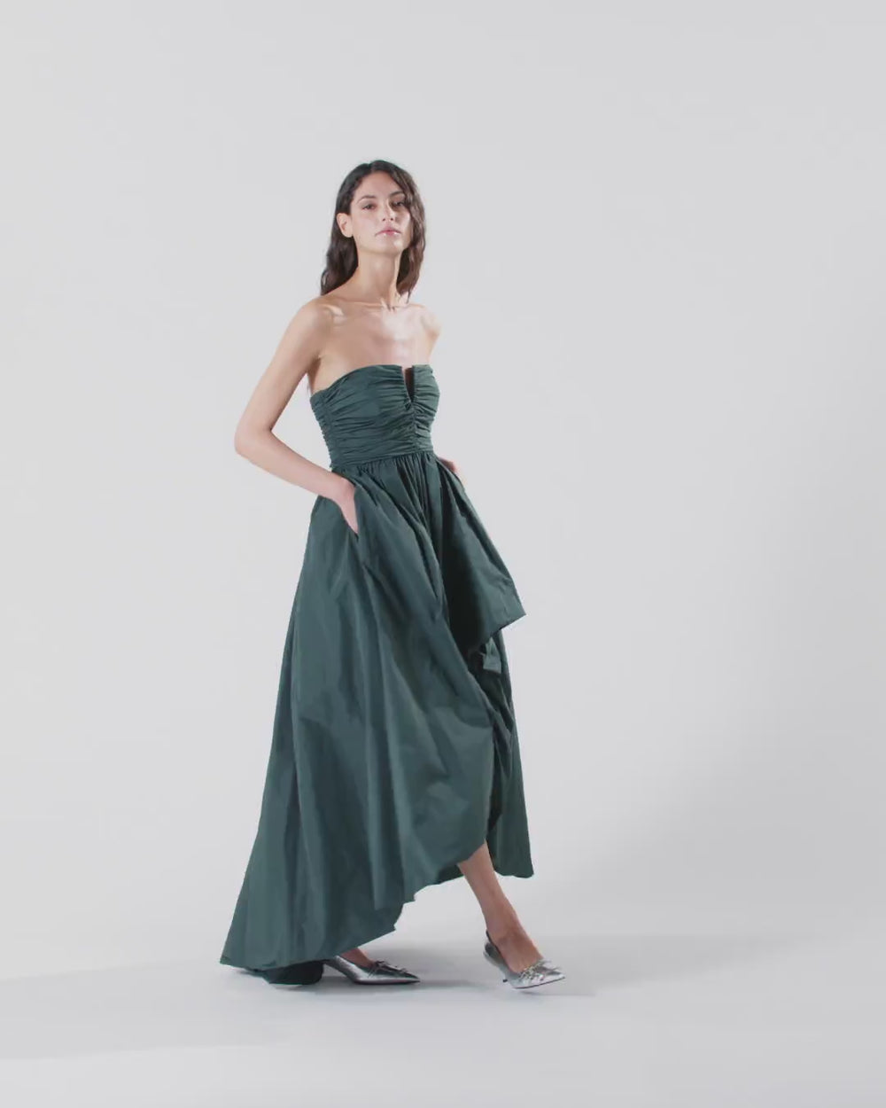 Long taffeta dress, fitted on top and flared on the skirt, with a zip on the back and an opening on the front. The material is light and shiny and blends perfectly with the dynamic-volume design that distinguishes the garment. The feminine line of the strapless bodice is enhanced by the shaped neckline and the ruffled detailing, while the inside of the cups has tape to prevent the dress from slipping. This elegant dress is perfect for wearing on special occasions, whether as an evening outfit or as a ceremony look.