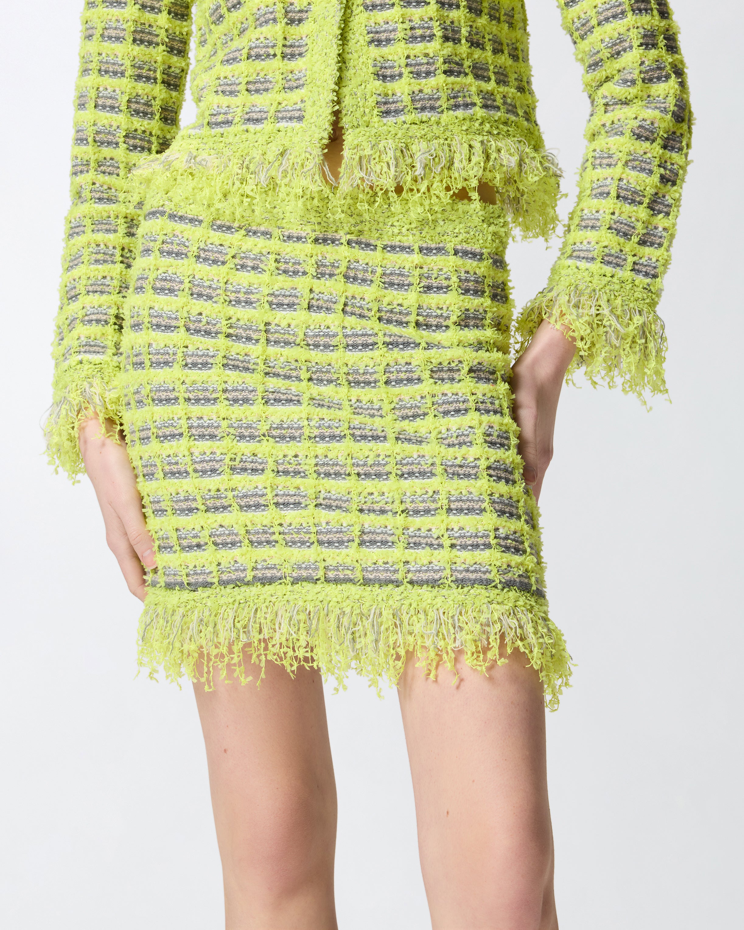 Straight-fit mini skirt in woven basketweave-effect fabric with checked texture and slightly frayed knit edges. The garment features more pronounced fringing at the bottom and a label with jacquard PINKO logo lettering on the back. Wear this mini skirt with the matching jacket for a feminine head-to-toe look ideal for formal occasions. - SAPIDO SKIRT