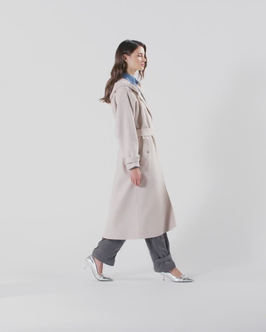Abrigo largo confeccionado en paño doble de mezcla de lana y caracterizado por un cuello envolvente con capucha. La particular línea del abrigo, ligeramente acampanada, se realza con unas voluminosas mangas raglán largas, cerradas con doble botón en el puño. Cinturón a juego del mismo tejido para anudar en la cintura y cierre frontal con botones ocultos. Modelo forrado.