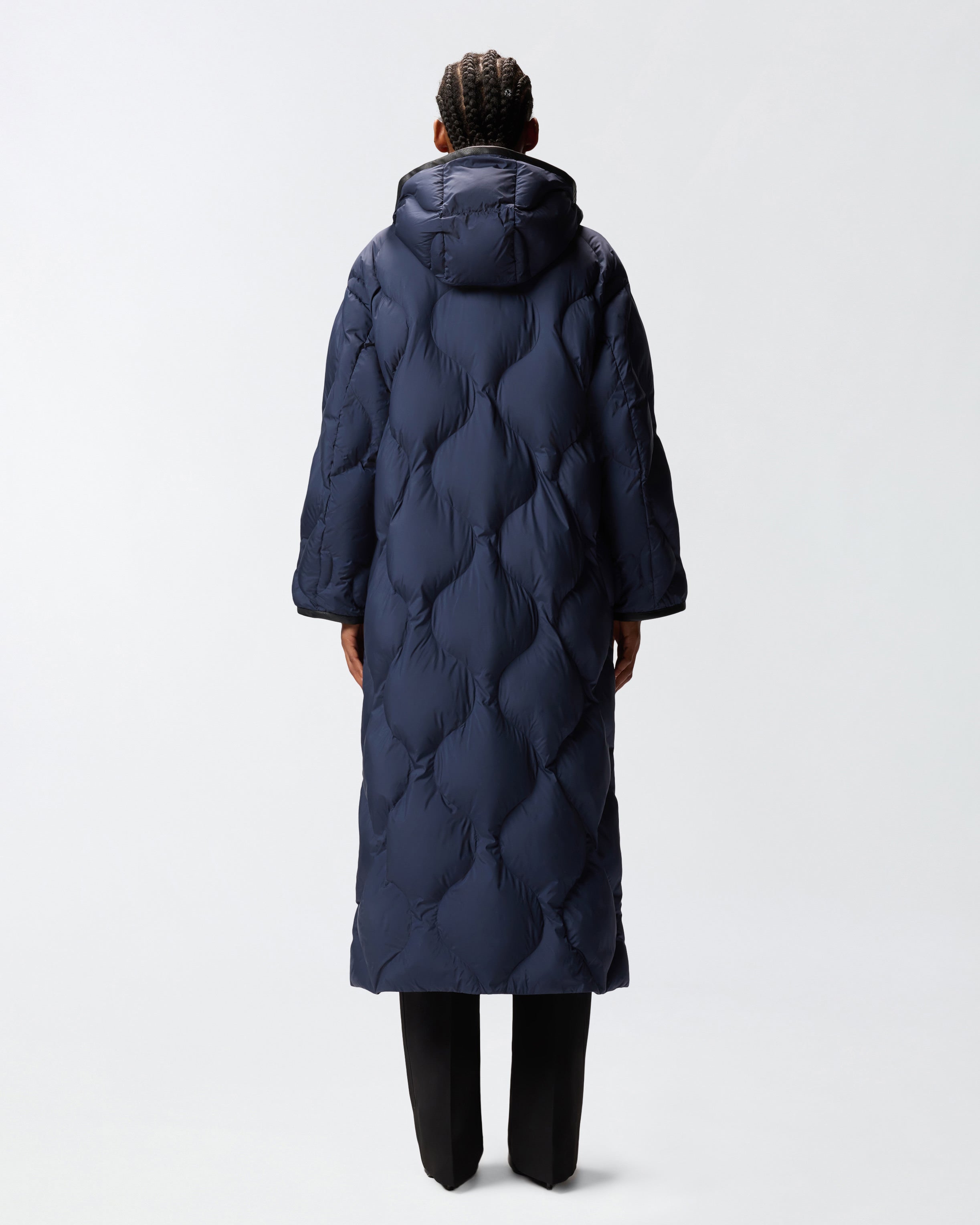 Abrigo acolchado largo hasta el tobillo de tela técnica, pespunteado con maxipatrón de cebolla y dotado de bolsillos ribeteados y una amplia capucha. Esta prenda no renuncia a un cautivador juego de contrastes al más puro estilo PINKO, dado por el material revestido con efecto napa en el cuello alto, en la tapeta que cubre el cierre y en el ribete que perfila el borde de la capucha. Te esperan los días más fríos, afróntalos con un toque de estilo.