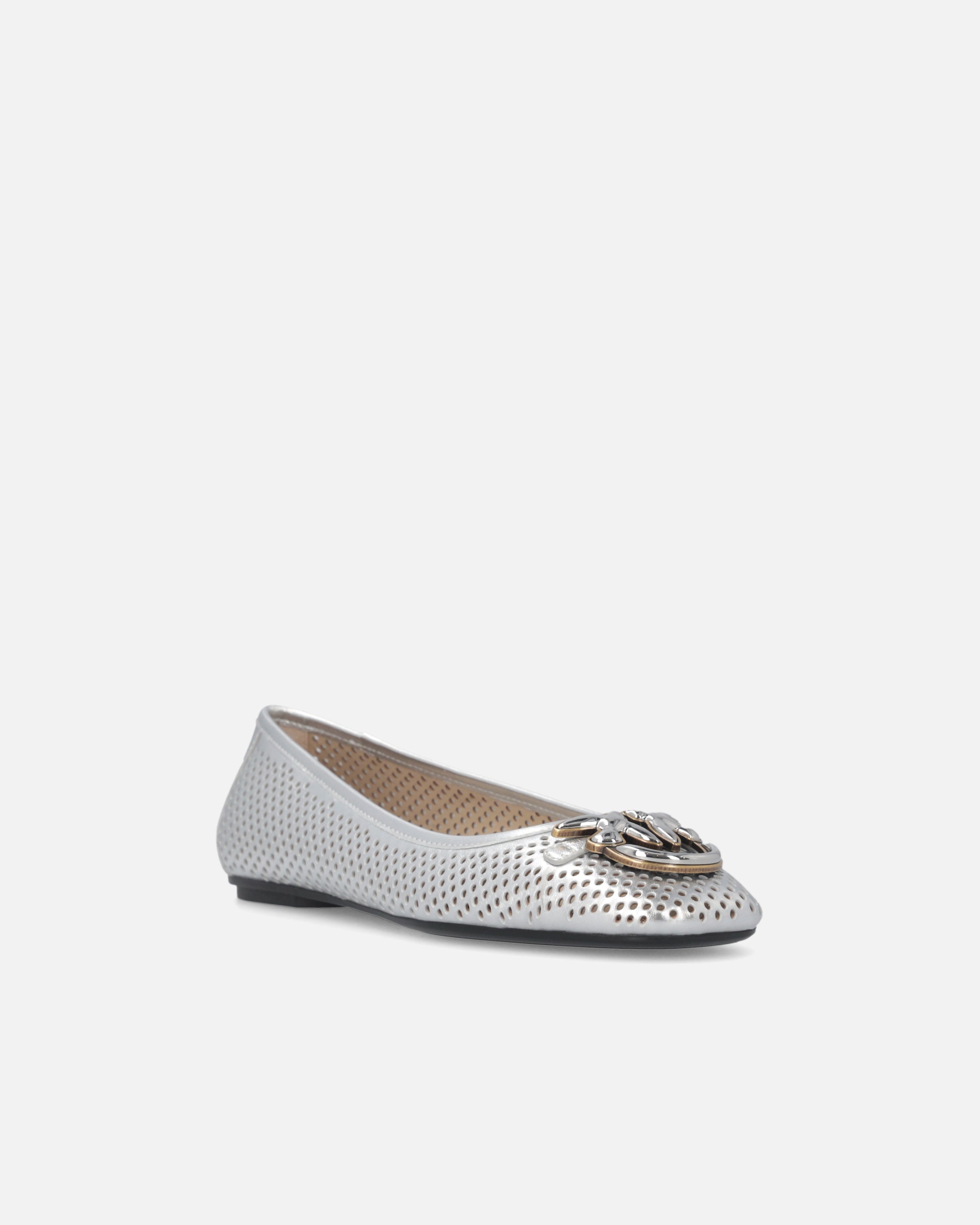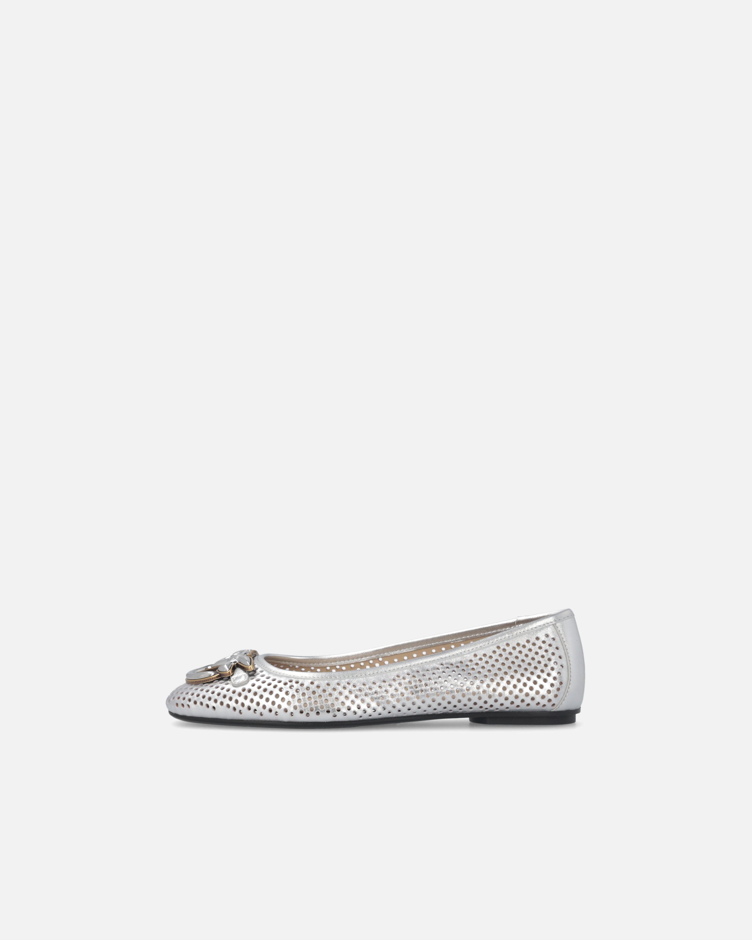 Bailarinas confeccionadas en suave napa para brindar un ajuste cómodo y una estructura flexible que sigue el movimiento natural del pie. El toque brillante del acabado laminado se completa con el logotipo Love Birds en la parte delantera en forma de aplicación metálica con efecto espejo. El diseño minimalista está adornado con un acabado calado que aporta ligereza visual y transpirabilidad eficaz, lo que hace que el modelo sea ideal para la temporada de primavera. Equilibrio perfecto entre elegancia básica y confort diario, estas bailarinas combinan fácilmente con looks casual-chic, de día o de noche. - MAX 11