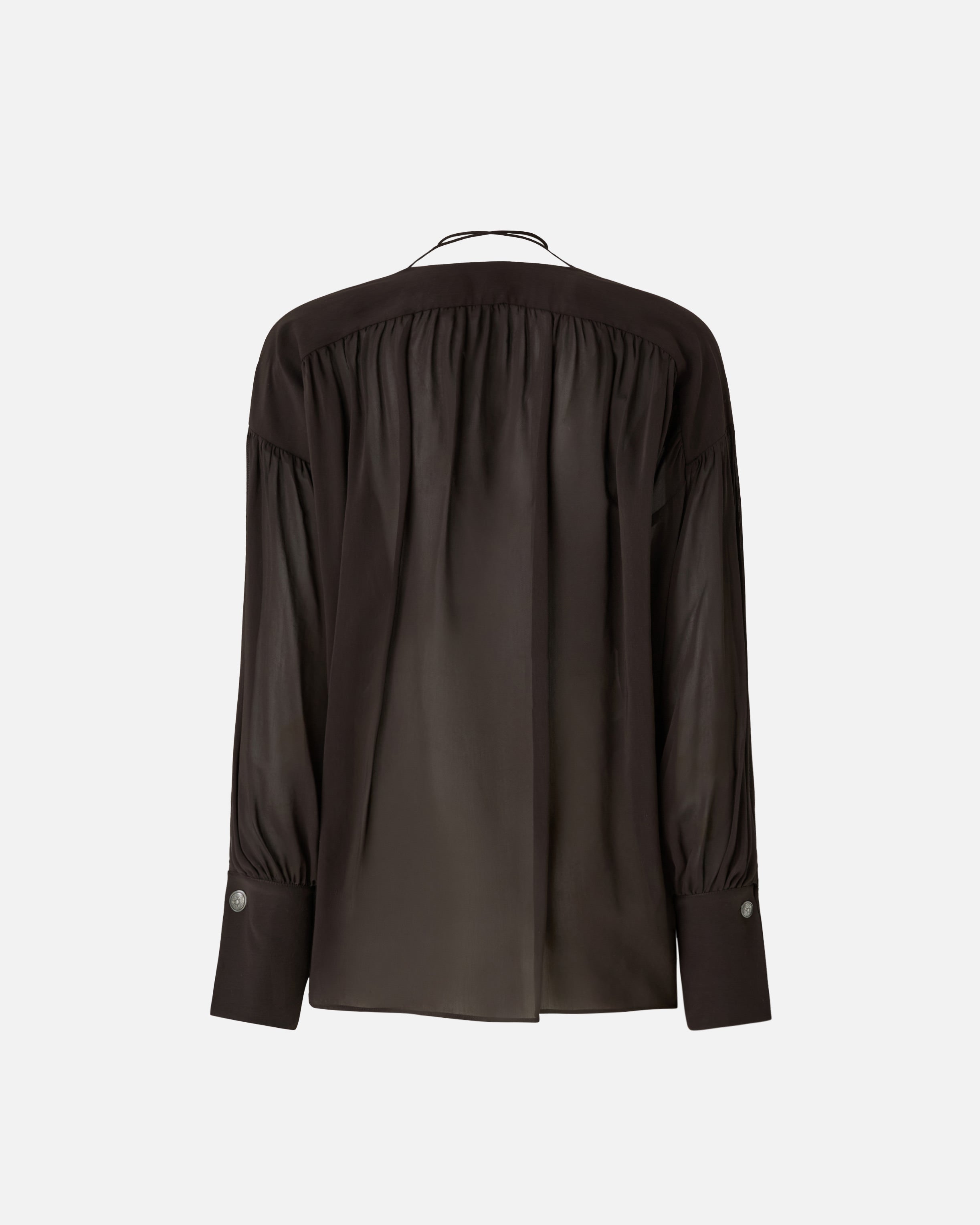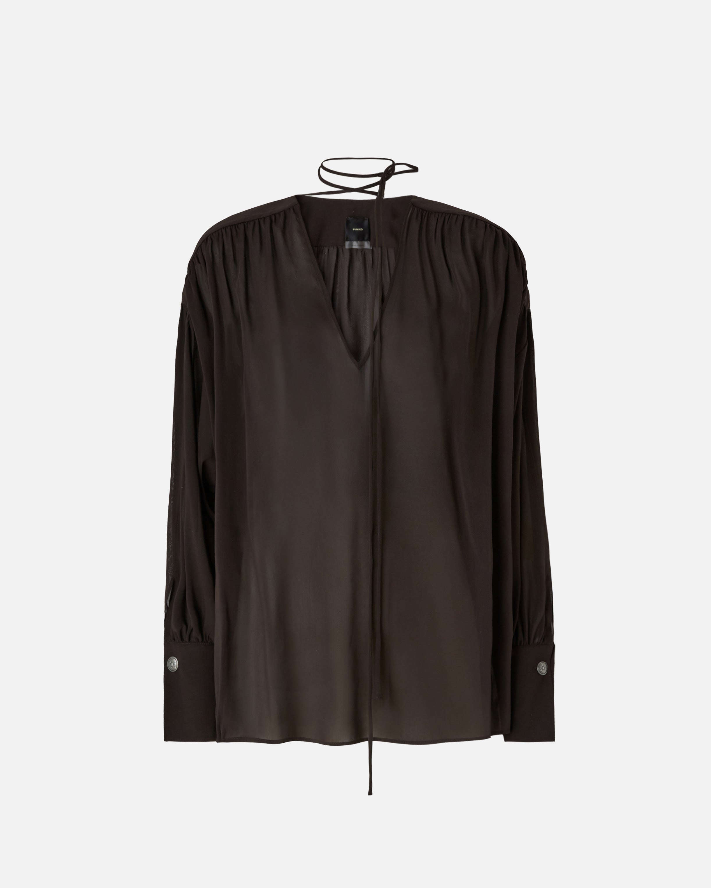 Blusa de corte holgado caracterizada por mangas largas con botón metálico y un pronunciado escote de pico en la parte delantera con cintas largas y finas que se anudan para ajustar la abertura. La prenda está confeccionada en un refinado y fresco tejido de gasa de algodón y viscosa, y se realza por delicados frunces que se originan en el canesú y descienden en suaves pliegues a lo largo de la parte delantera y trasera. Gracias a su versatilidad, esta blusa femenina será ideal para acompañarte en las ocasiones más especiales o formales, por ejemplo en combinación con un sofisticado traje.