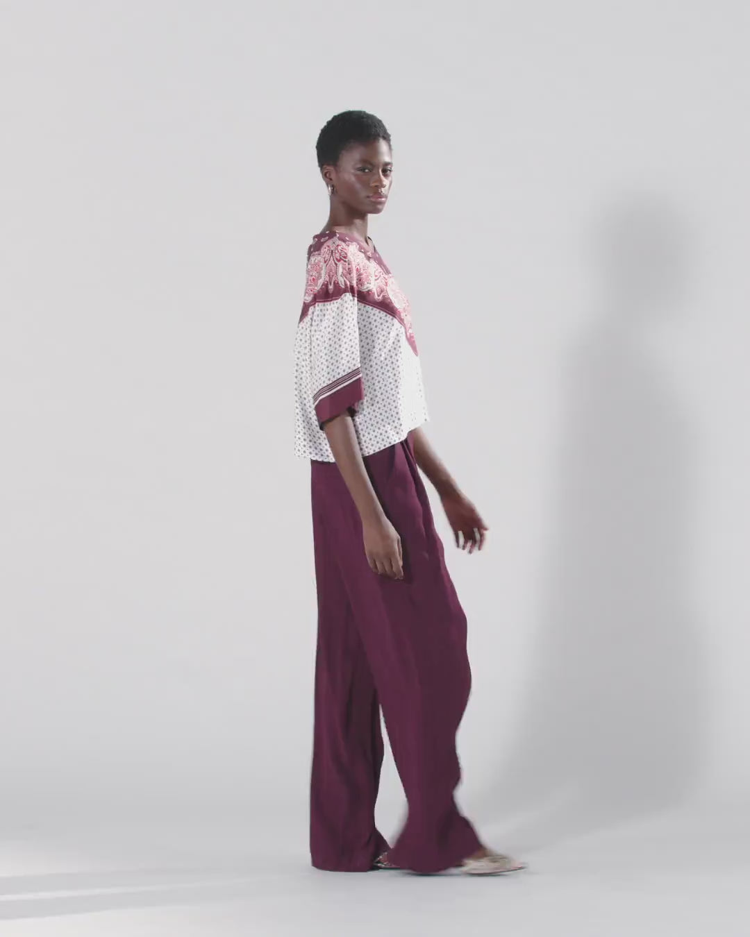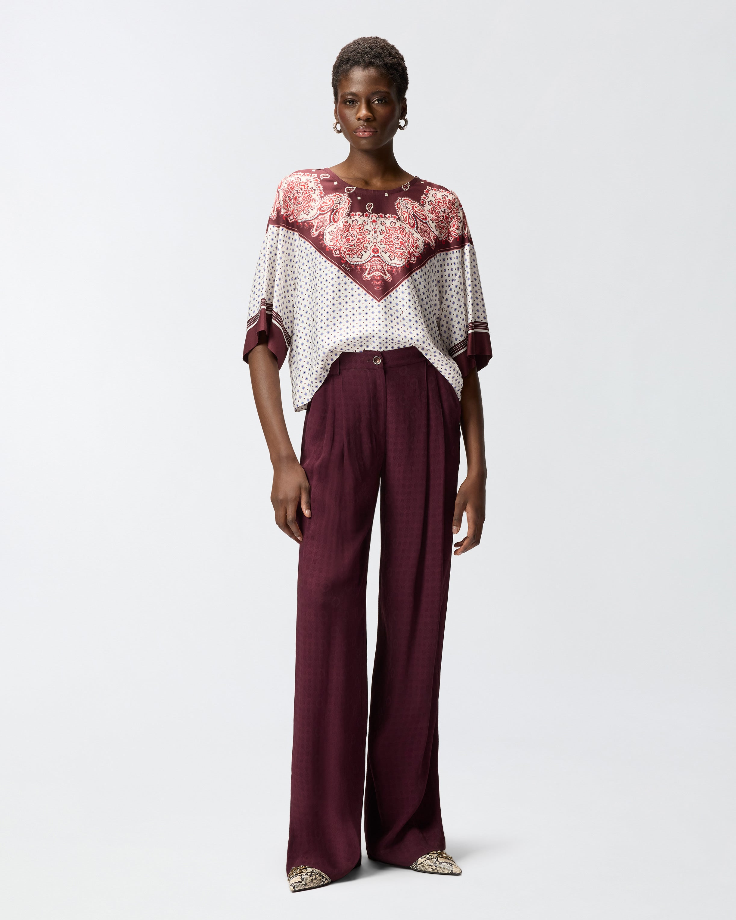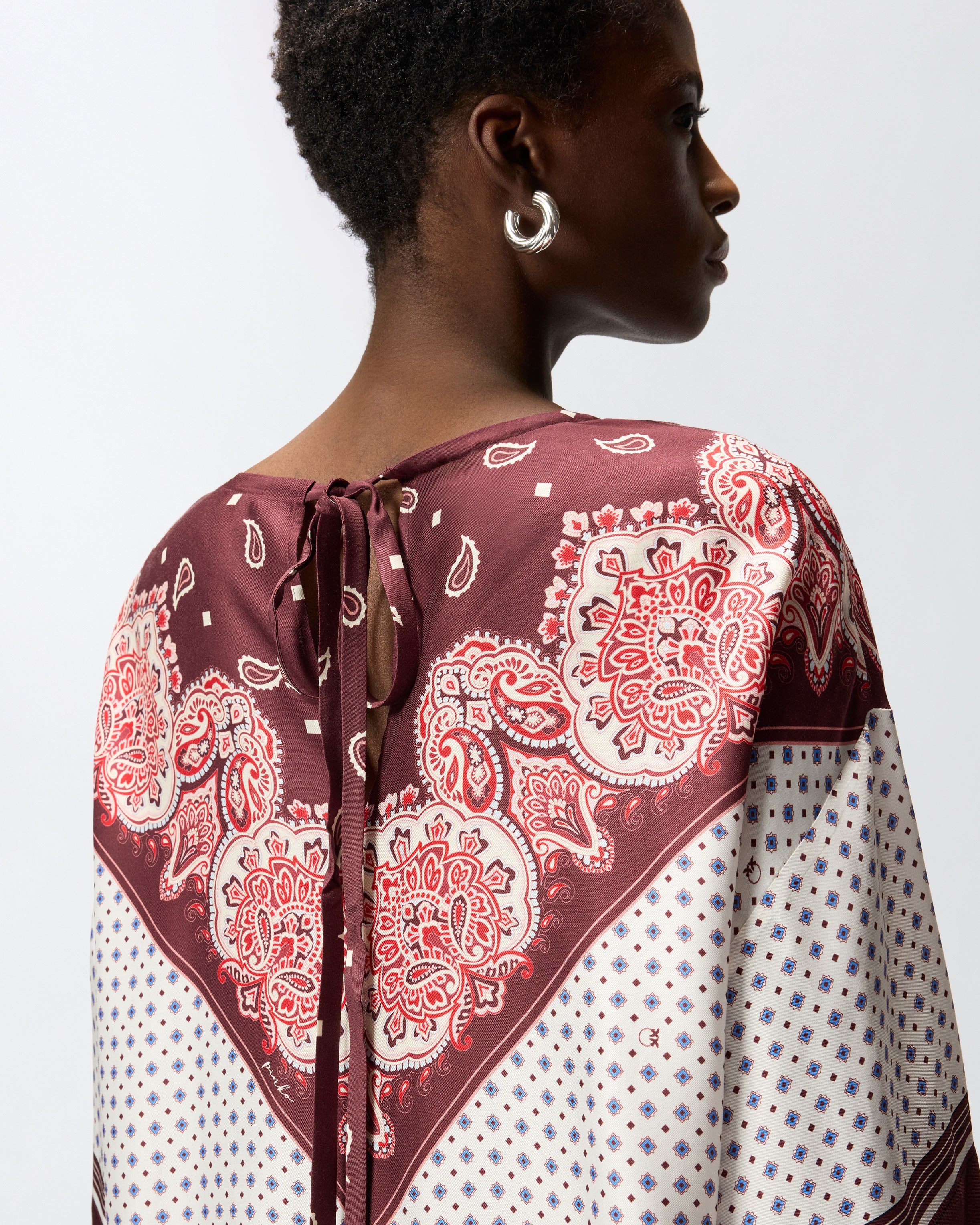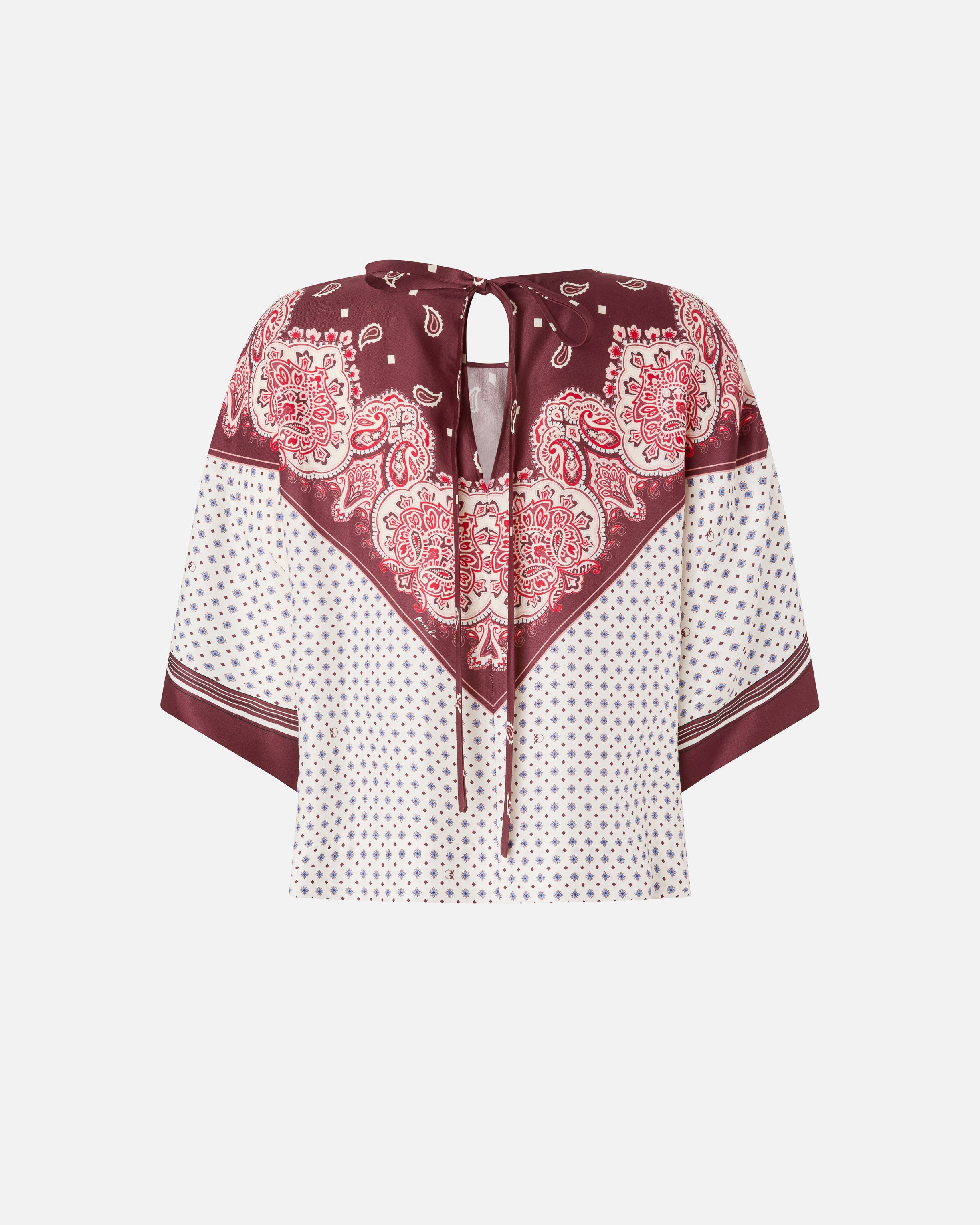 Blusa de corte boxy en sarga de viscosa fluida, con manga ancha hasta el codo y cuello redondo con cintas que se anudan en la parte posterior formando una abertura en forma de lágrima. El modelo está adornado con un estampado inspirado en un fular con motivo integral de corbatería y con un estampado localizado en contraste que cae como una bandana en la parte delantera y que también decora los puños. Para lucir un total look impactante, ponte la blusa con los pantalones del mismo estampado.