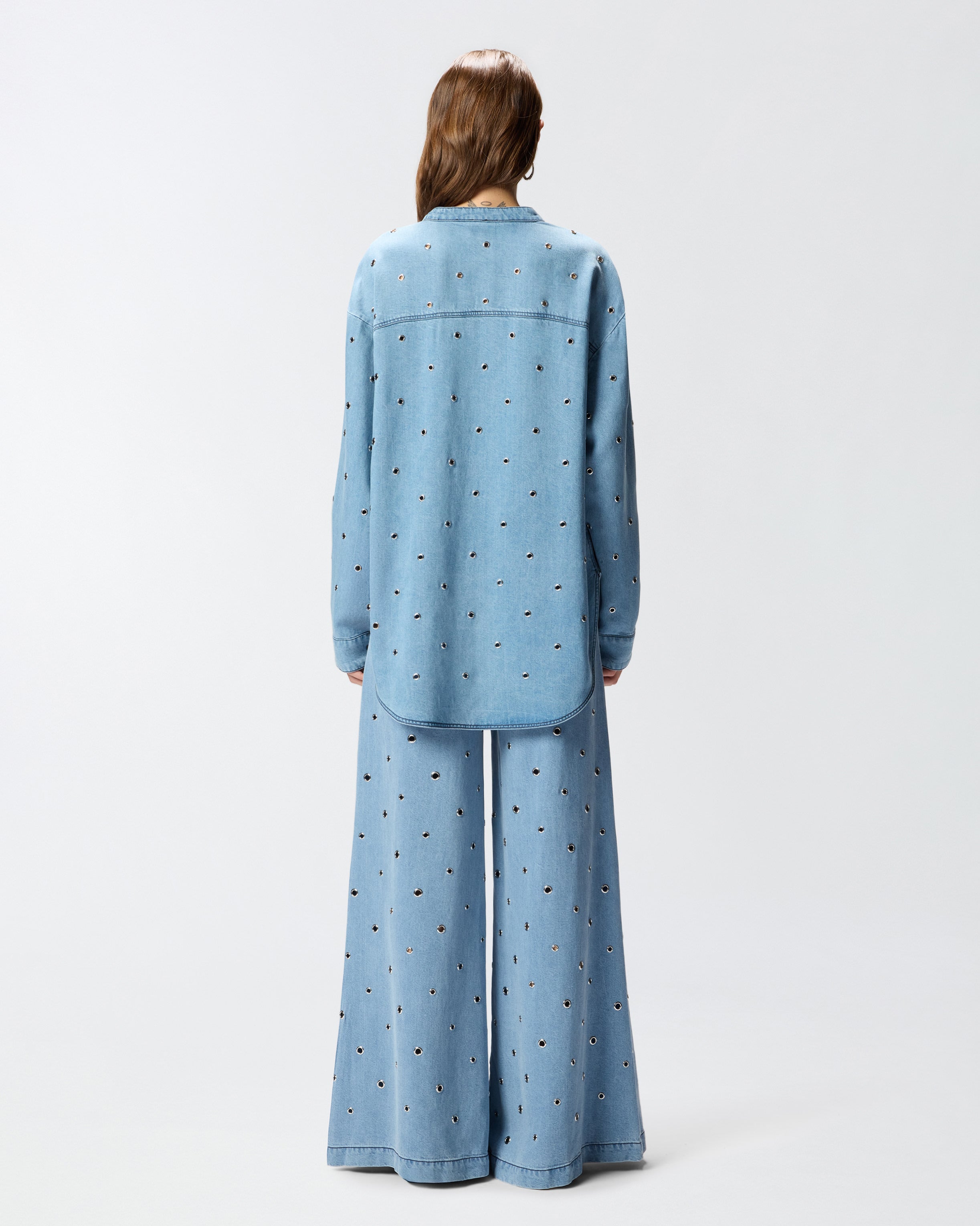 Blusa de corte holgado con manga larga, bajo redondeado y cuello mao que se abre en un escote de pico pronunciado. El modelo se caracteriza por su particular confección: el tejido denim de puro lyocell ligero y fluido presenta un acabado descolorido con destreza y está decorado íntegramente con pequeños ojales metálicos que crean un sutil efecto perforado. Haz que tu look de día sea original y declarativo combinando la blusa con los vaqueros a juego. - BELLICOSO BLOUSE