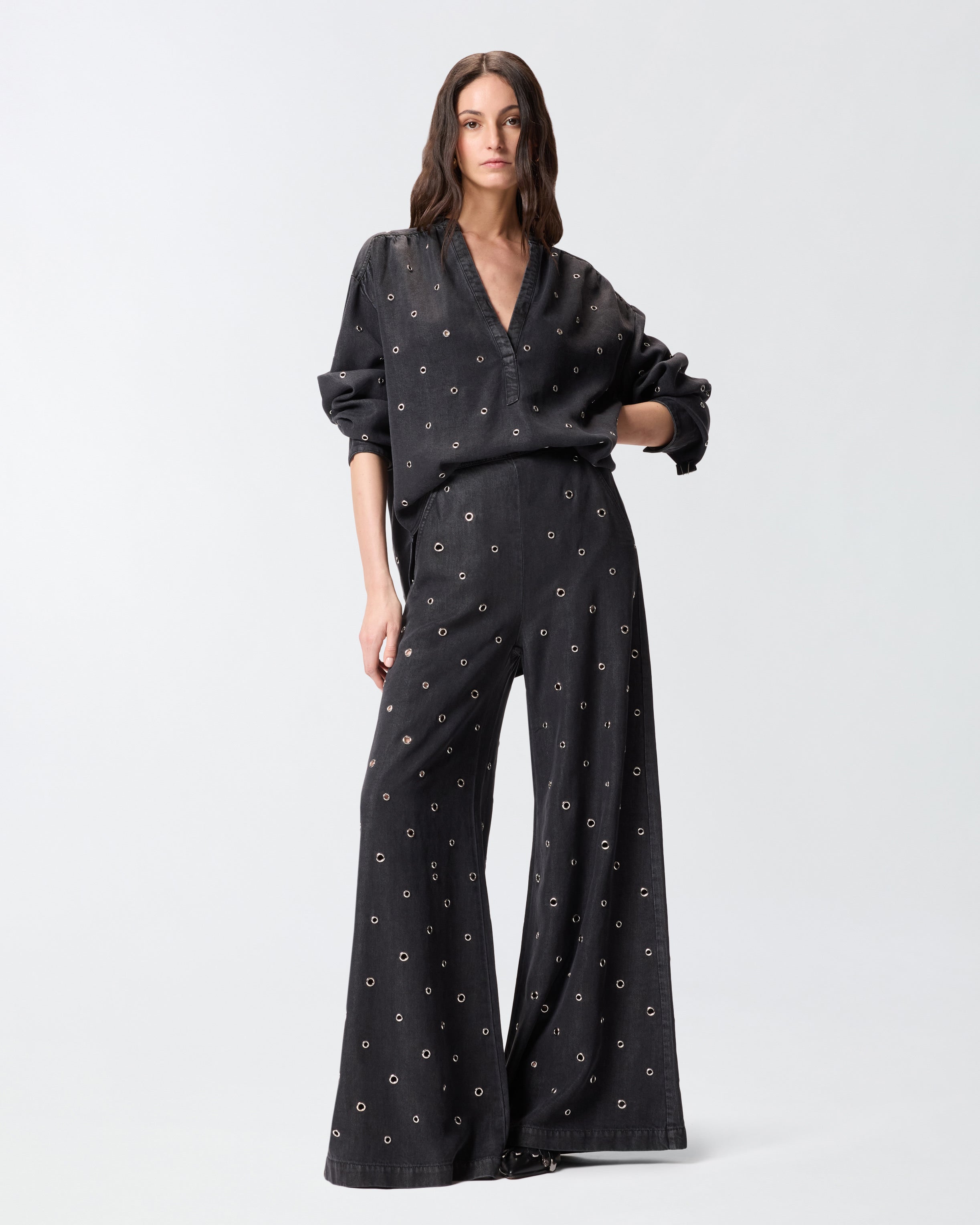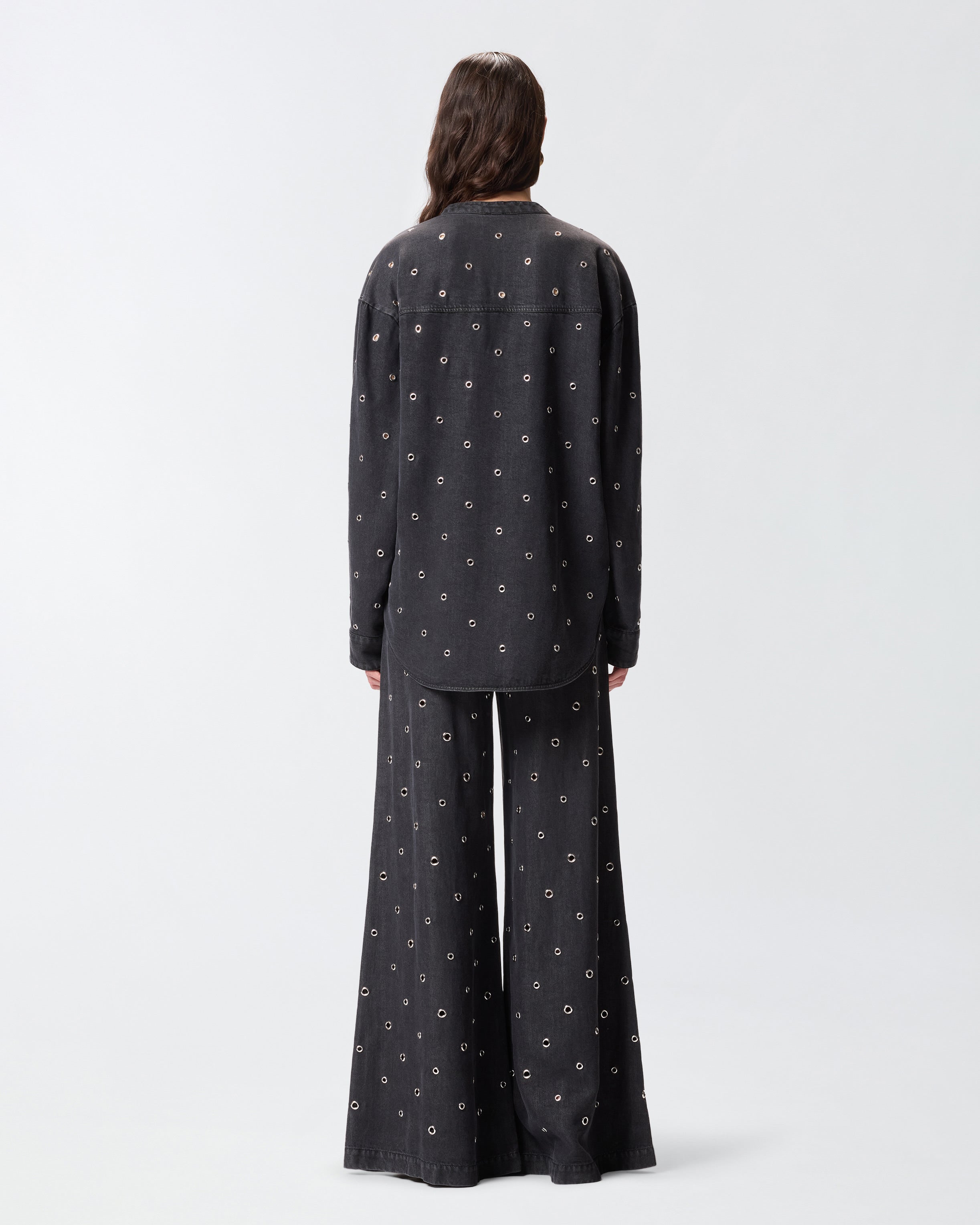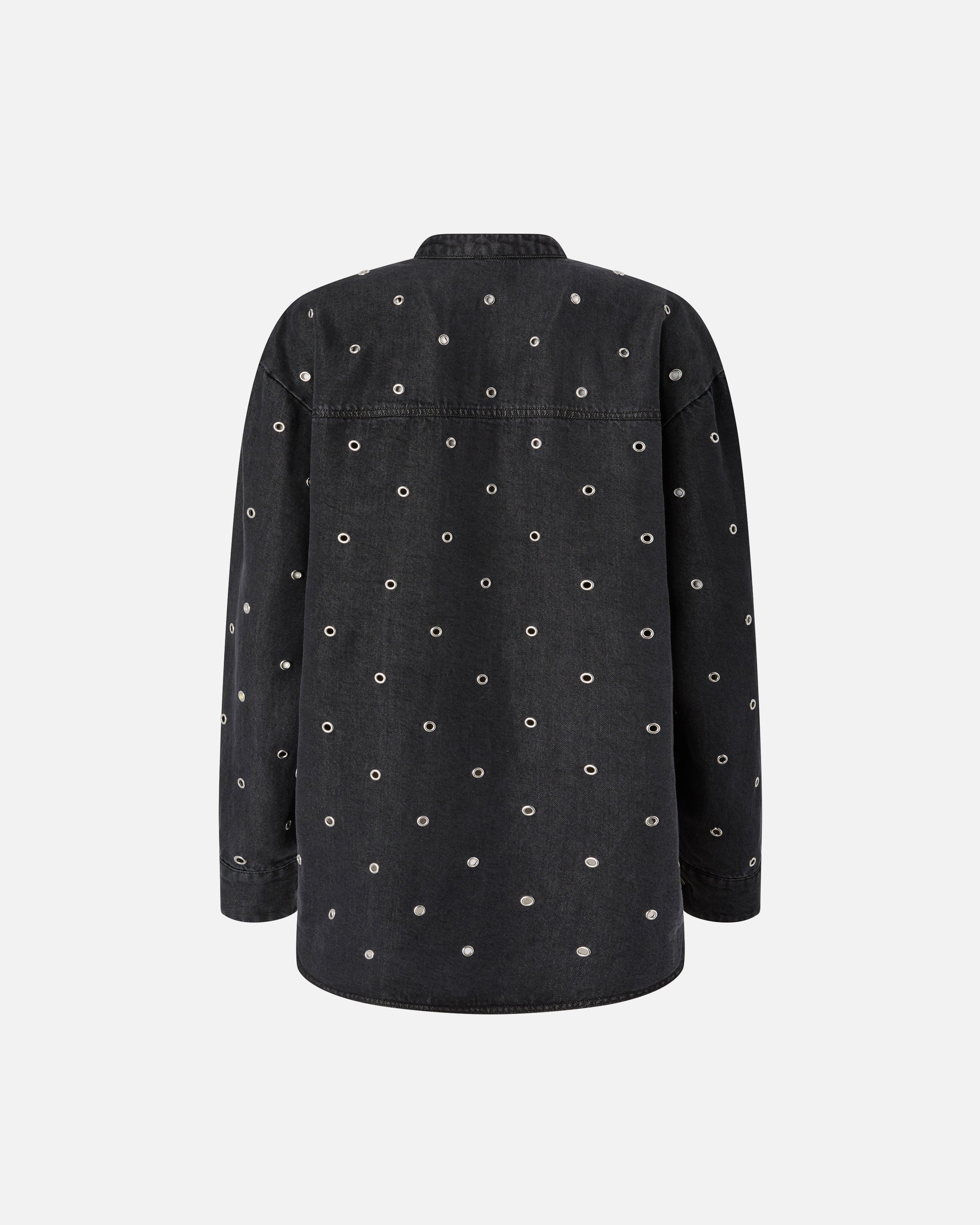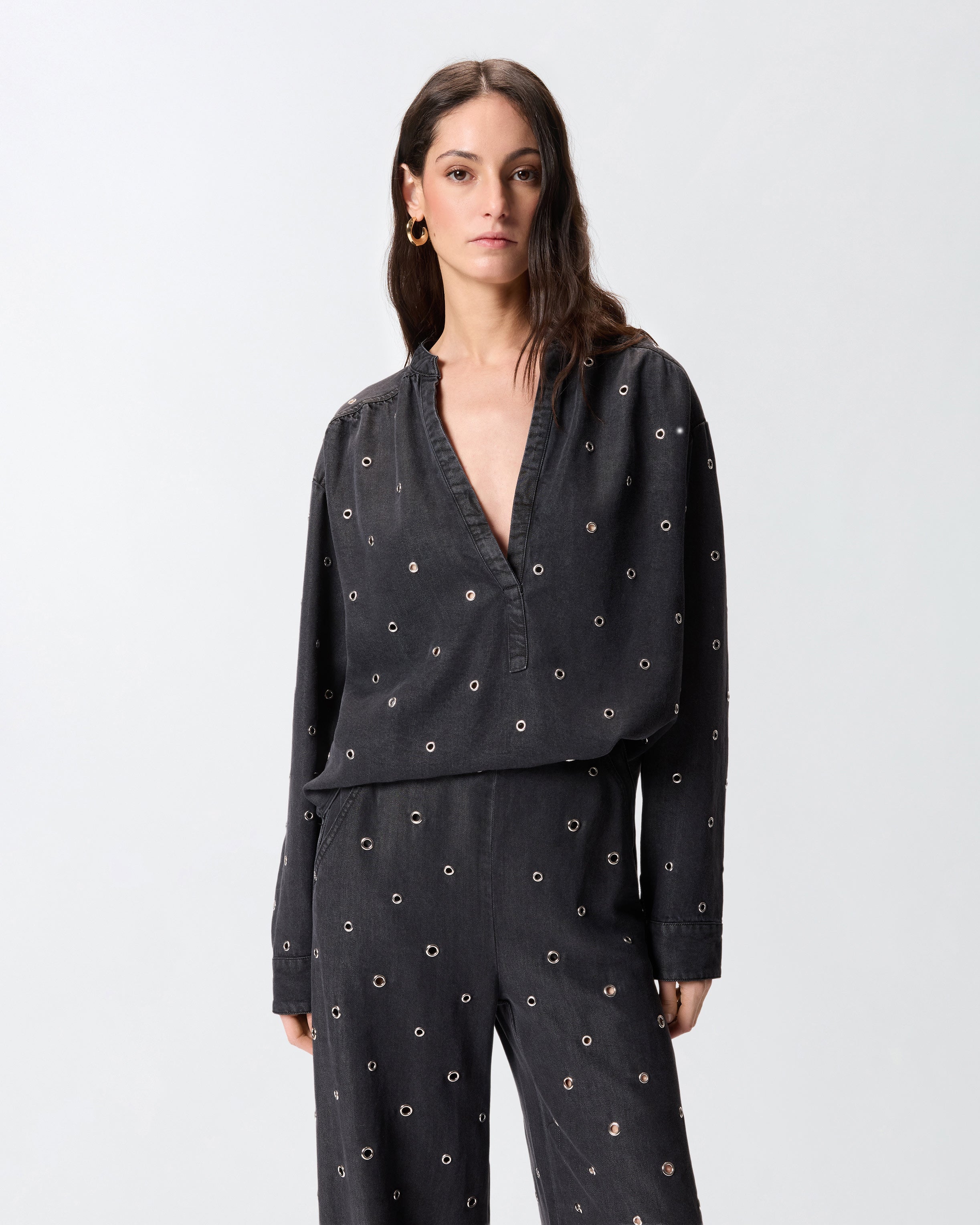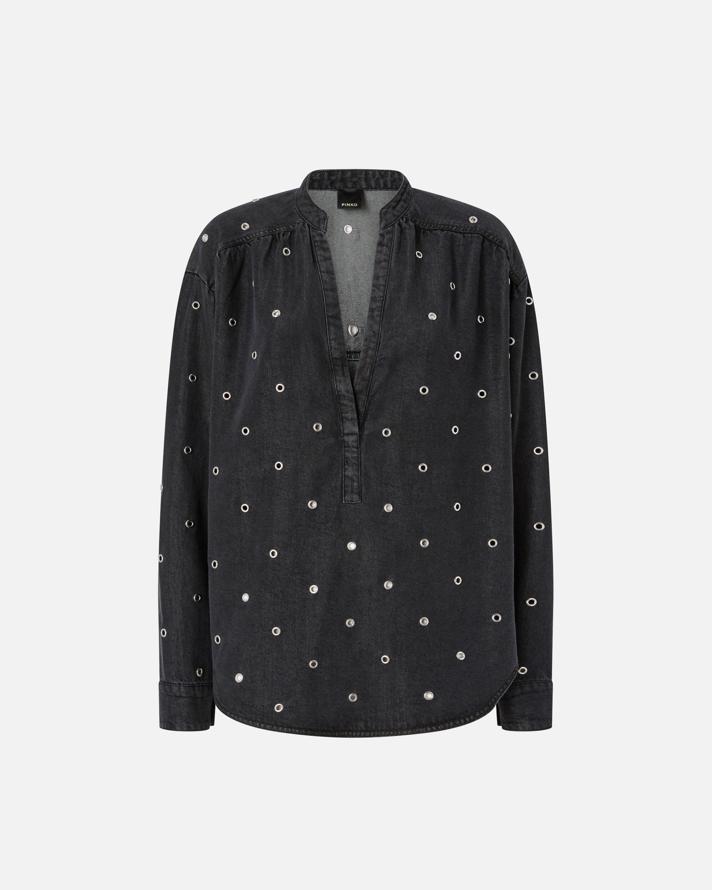 Blusa de corte holgado con manga larga, bajo redondeado y cuello mao que se abre en un escote de pico pronunciado. El modelo se caracteriza por su particular confección: el tejido denim de puro lyocell ligero y fluido presenta un lavado oscuro con detalles ligeramente descoloridos y está decorado íntegramente con pequeños ojales metálicos que crean un sutil efecto perforado. Haz que tu look de día sea original y declarativo combinando la blusa con unos pantalones clásicos o vaqueros. - BELLICOSO BLOUSE