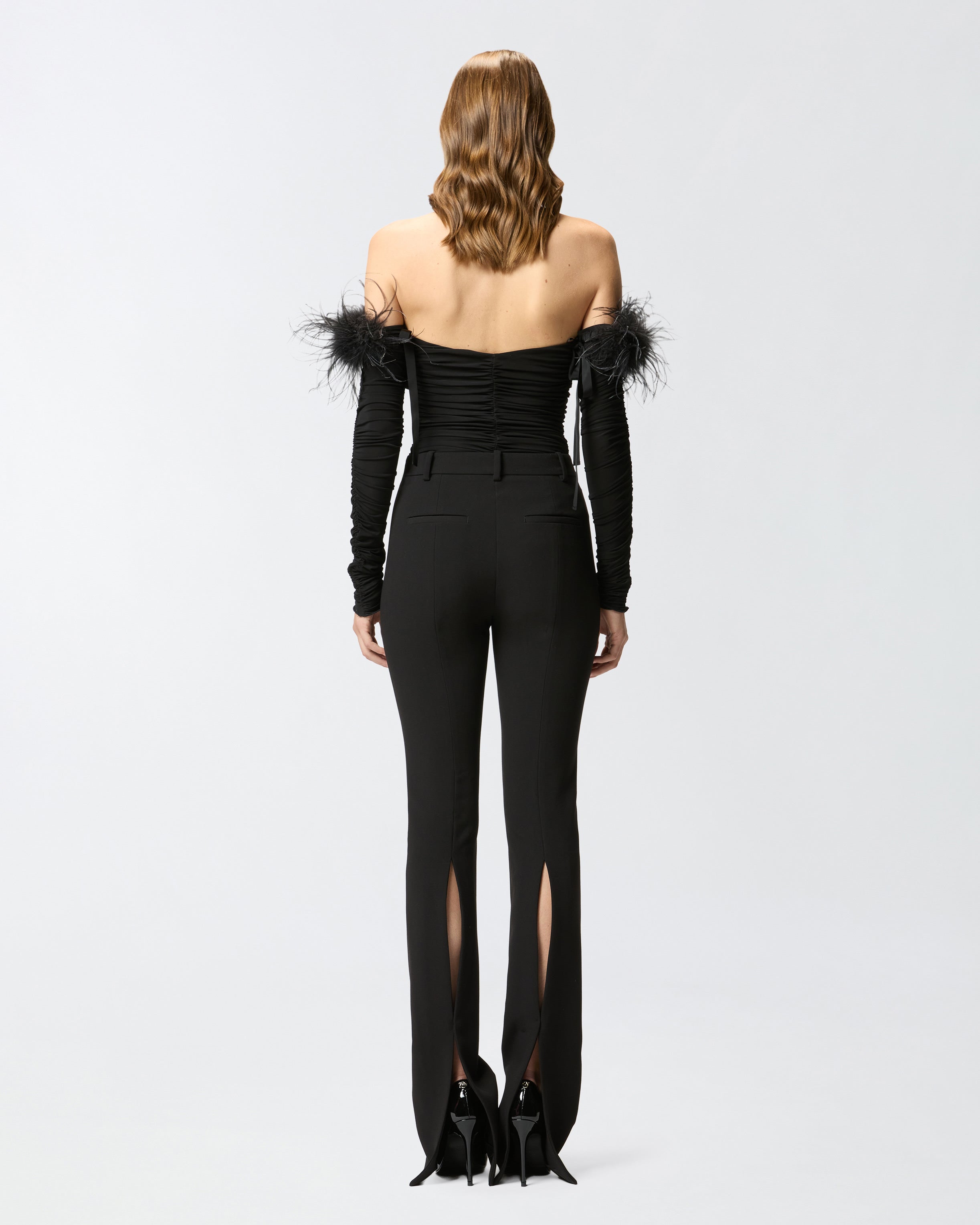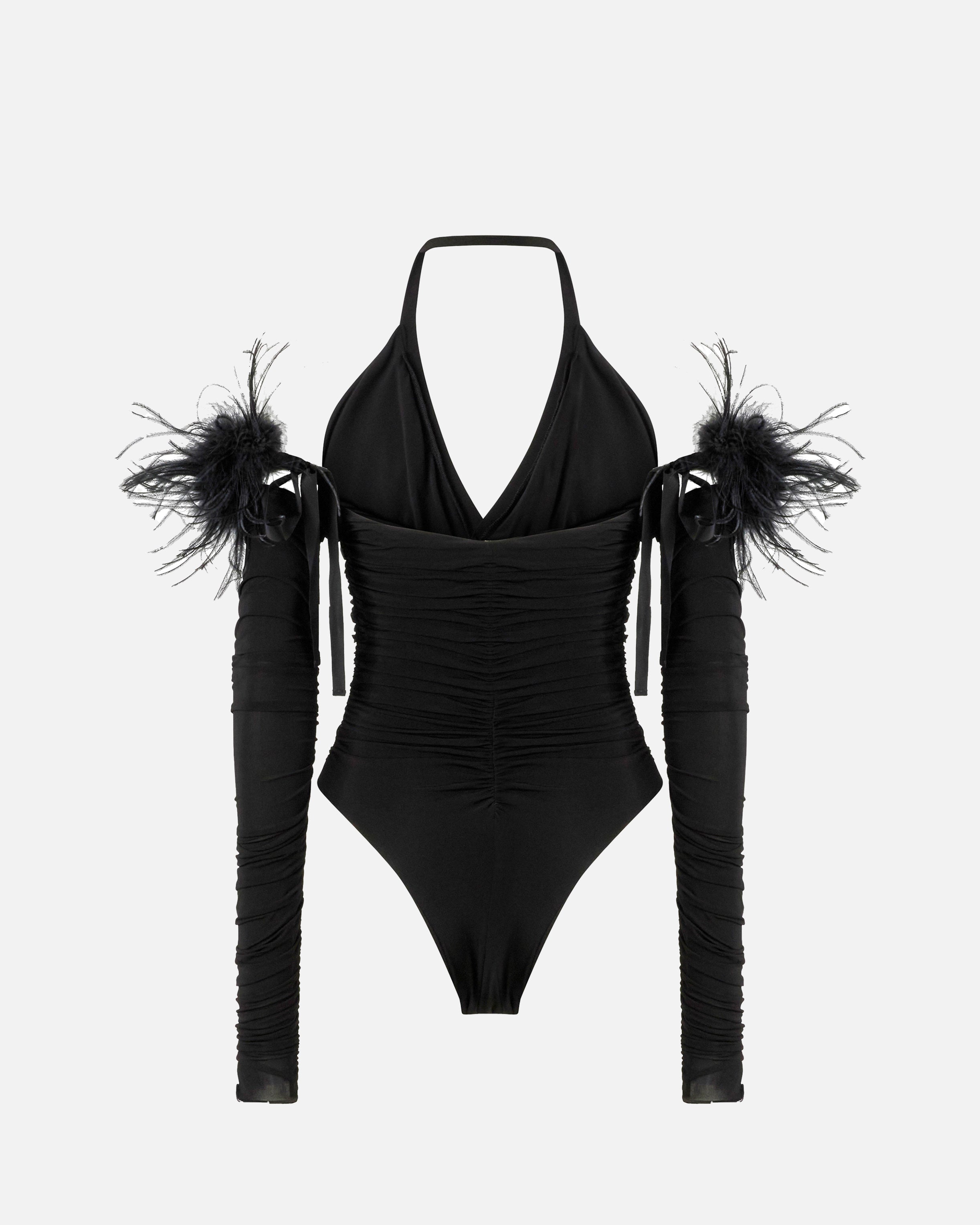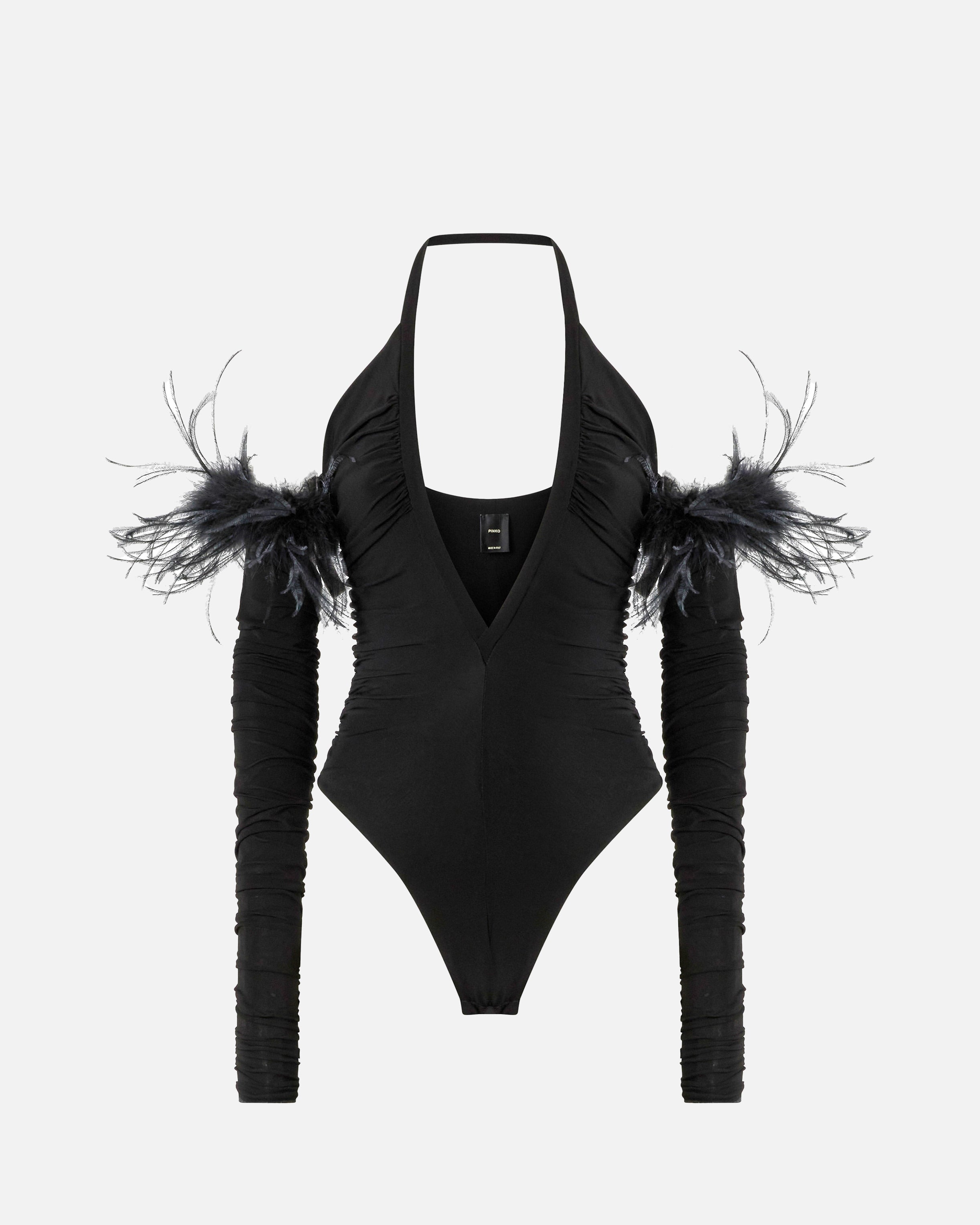 Bodi de tejido de punto ligero con hombros y mangas desmontables mediante botón, que ofrece diferentes opciones a la hora de llevarlo. La ligereza del material permite crear drapeados y fruncidos para realzar una silueta extremadamente femenina y refinada. La particularidad de la prenda viene dada por un escote muy pronunciado y por la aplicación de plumas montadas sobre una cinta de grogrén extraíble, que además de dar un toque de estilo también se convierten en una verdadera joya para llevar al cuello. Este diseño está destinado a convertirse en tu as en la manga cuando el código de vestimenta es de alto nivel.