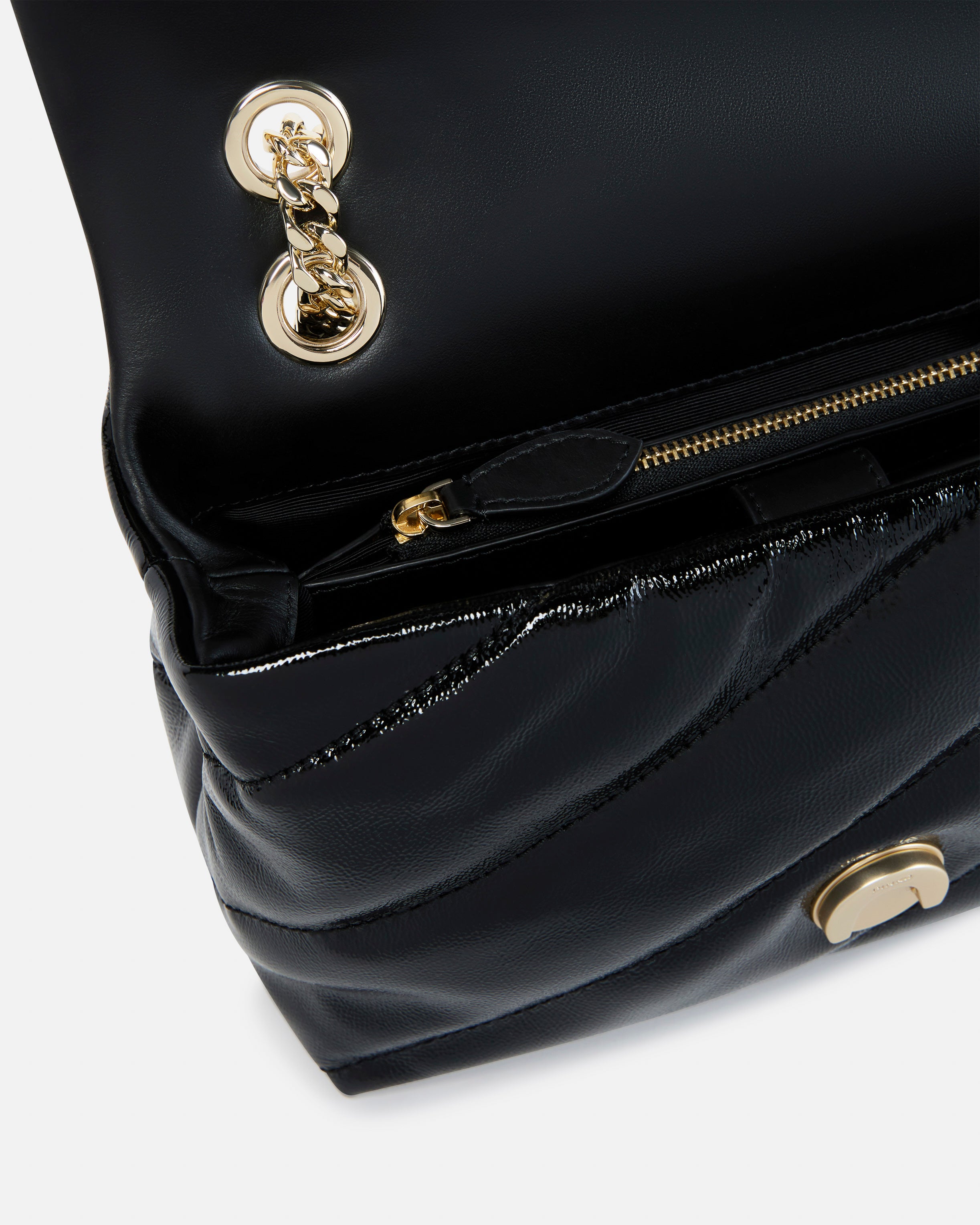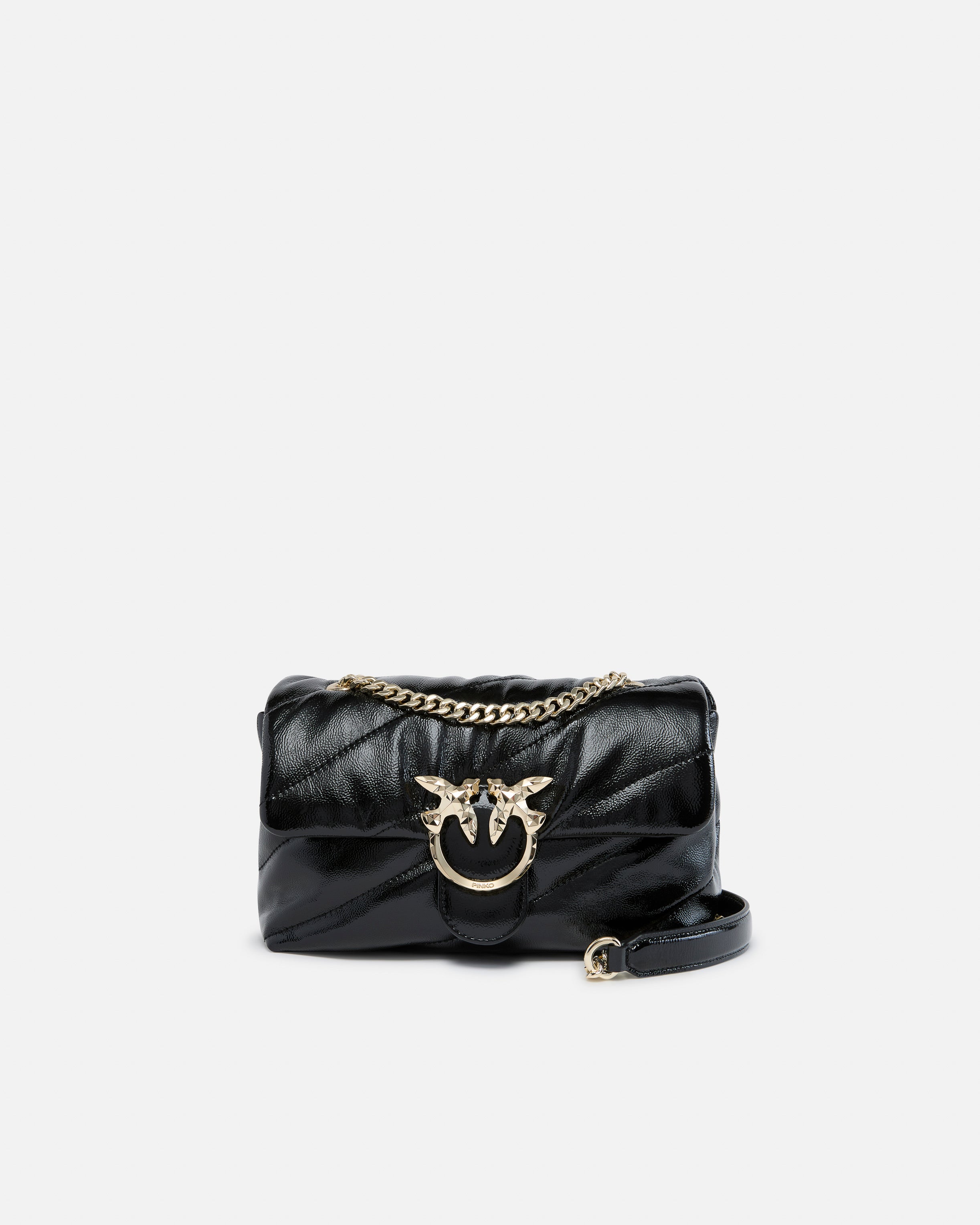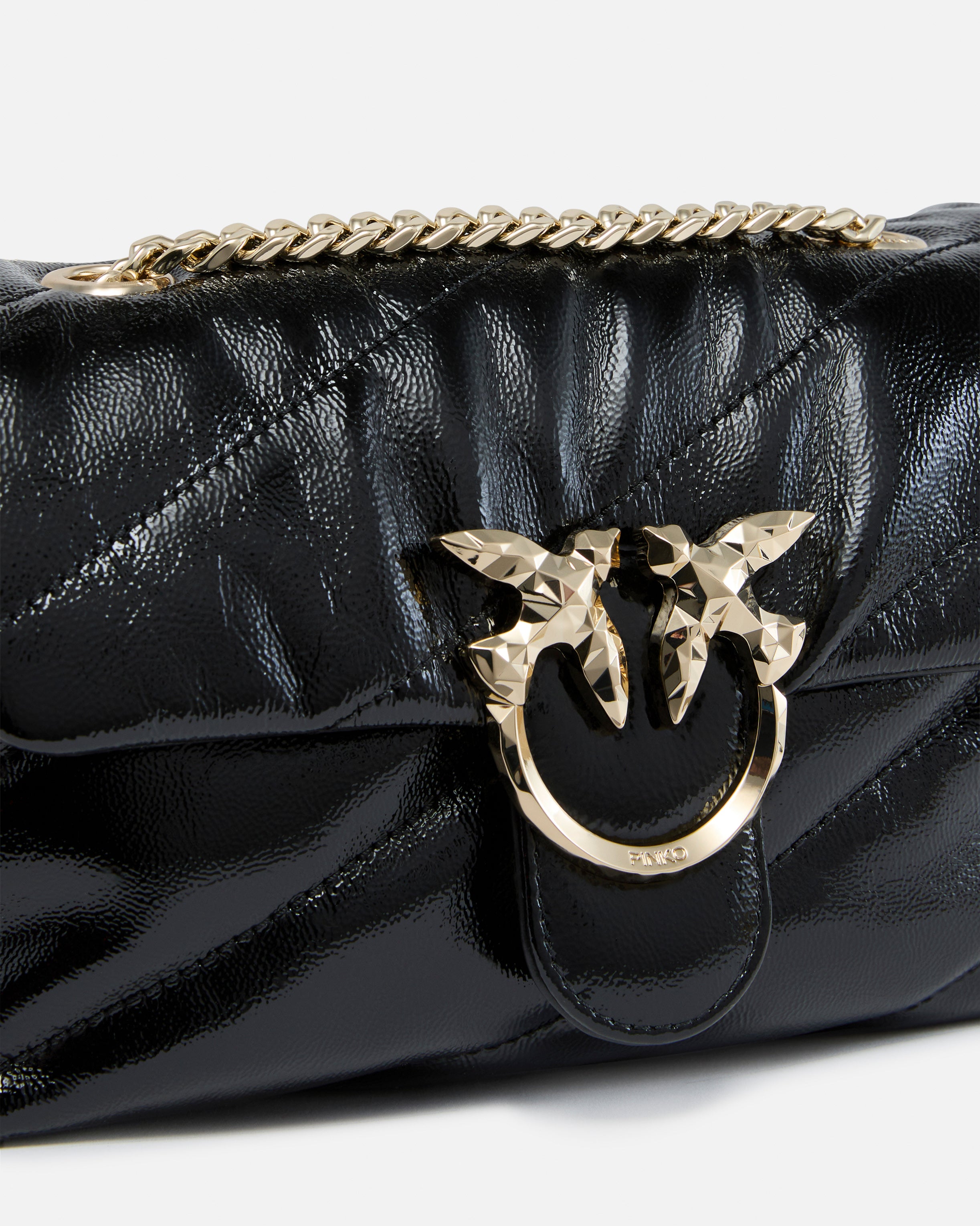 Bandolera de pequeño tamaño Love Bag Puff en sofisticado charol con una textura brillante y ligeramente ondulada, con acolchado oblicuo para que sea blanda y muy suave. El cierre de solapa se adorna con la emblemática hebilla metálica del logotipo Love Birds Diamond Cut, con un acabado facetado que aumenta su efecto tridimensional. El bolso se completa con una correa deslizante que incluye una cómoda hombrera. Además, se puede llevar al hombro doblando la correa. El interior de este pequeño bolso de noche está forrado de tela e incluye un panel divisorio con cierre de cremallera para organizar mejor el espacio. El bolso forma parte de la colección cápsula especial de edición limitada creada en exclusiva para PINKO Galleria. ¡Utiliza el chip especial NFC para vivir una experiencia única sobre el bolso que has comprado!