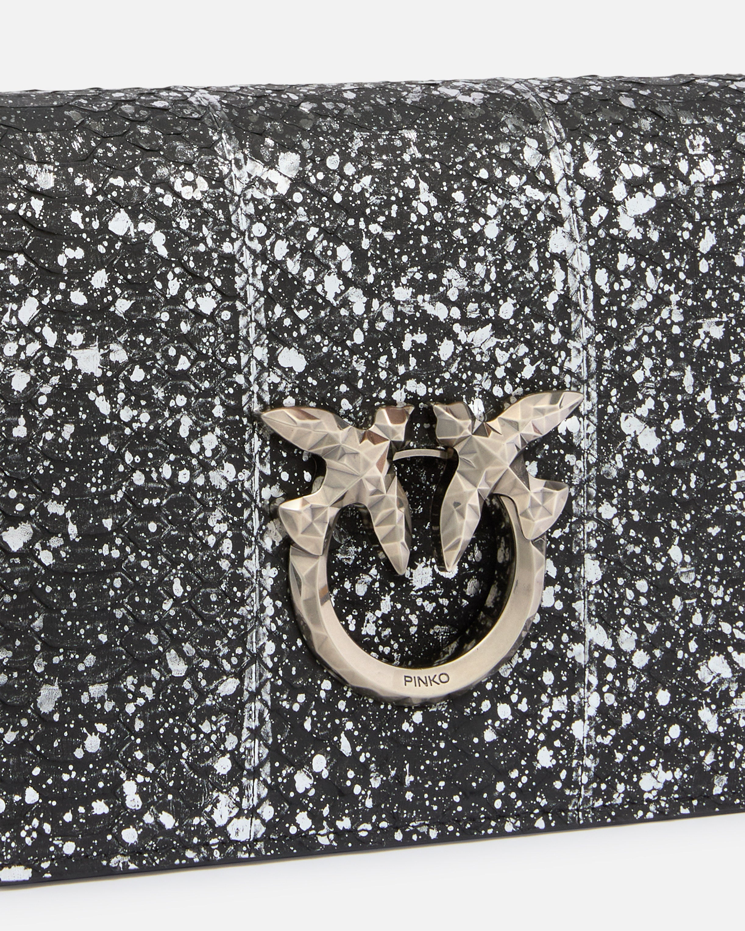Pequeña bandolera Mini Love Bag realizada en preciosa piel de reptil ayers, acabada con una particular pulverización laminada, que añade un toque especial a tus looks. Gracias a la aplicación manual de la piel en cada bolso, todos los modelos presentan diferencias a nivel de rayas y matices: se trata de características únicas, que hacen que tu bolso sea aún más único. El cierre se completa con la emblemática hebilla de metal con el logotipo de los pajaritos Love Birds Diamond Cut personalizada con tallado de efecto facetado tridimensional. La correa de cadena metálica incluye una práctica hombrera ajustable, mientras que el interior, forrado de tela, también incluye un práctico panel divisorio con cierre de cremallera para mejorar la organización del espacio. El bolso forma parte de la colección cápsula especial de edición limitada creada en exclusiva para PINKO Galleria. ¡Utiliza el chip especial NFC para vivir una experiencia única sobre el bolso que has comprado!