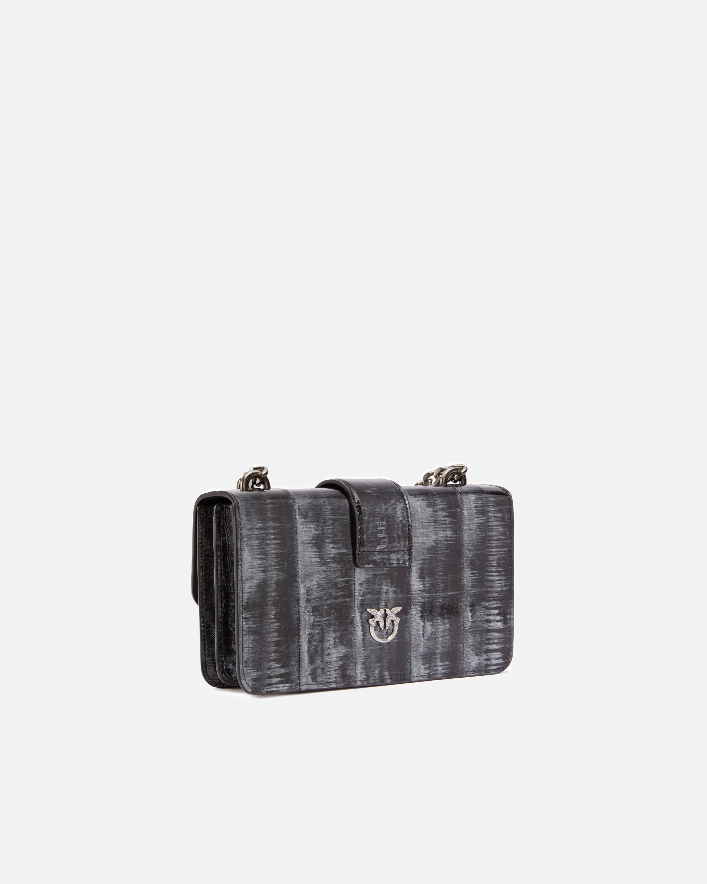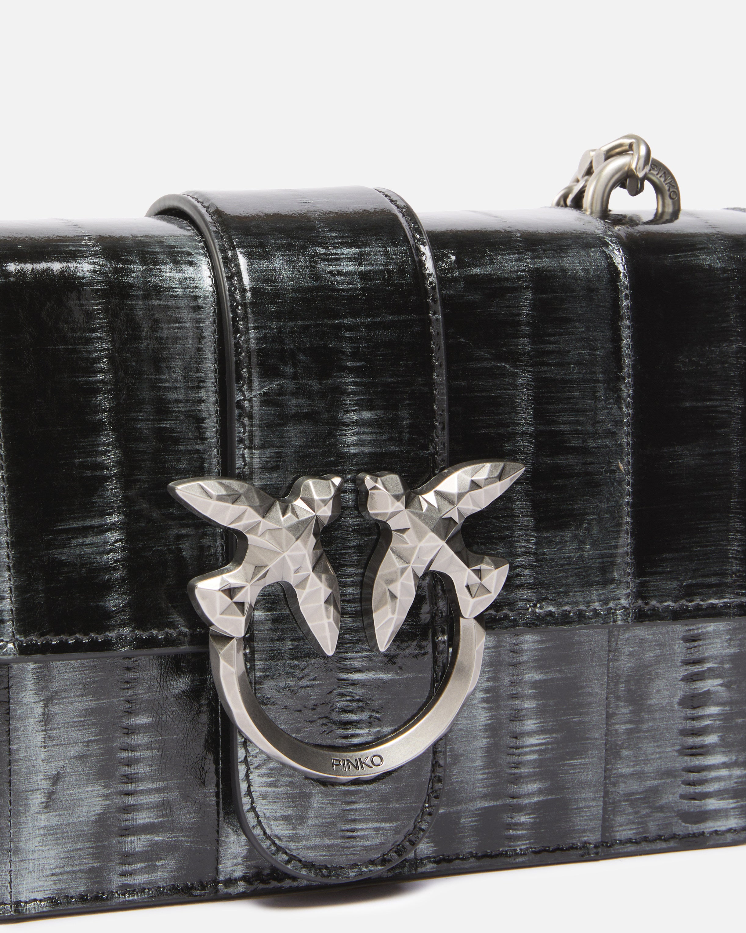 Pequeña bandolera Mini Love Bag en piel de mixino, caracterizada por una textura delicada especial y, al mismo tiempo, resistente y sofisticada, acabada con un efecto degradado. Las pieles, que son de pequeñas dimensiones, se cosen una al lado de la otra para conseguir superficies más grandes a partir de las que, posteriormente, se obtienen los cortes necesarios. Las manchas, las cicatrices y las diferencias de color entre pieles deben considerarse una característica que convierte cada bolso en una pieza única. El cierre del bolso se completa con un pasador y la emblemática hebilla de metal con el logotipo de pajaritos Love Birds Diamond Cut tallado con efecto facetado. La correa, a juego con el bolso, combina la clásica cadena redonda de metal con una práctica hombrera de piel para llevarlo cómodamente al hombro. El bolso forma parte de la colección cápsula especial de edición limitada creada en exclusiva para PINKO Galleria. ¡Utiliza el chip especial NFC para vivir una experiencia única sobre el bolso que has comprado!