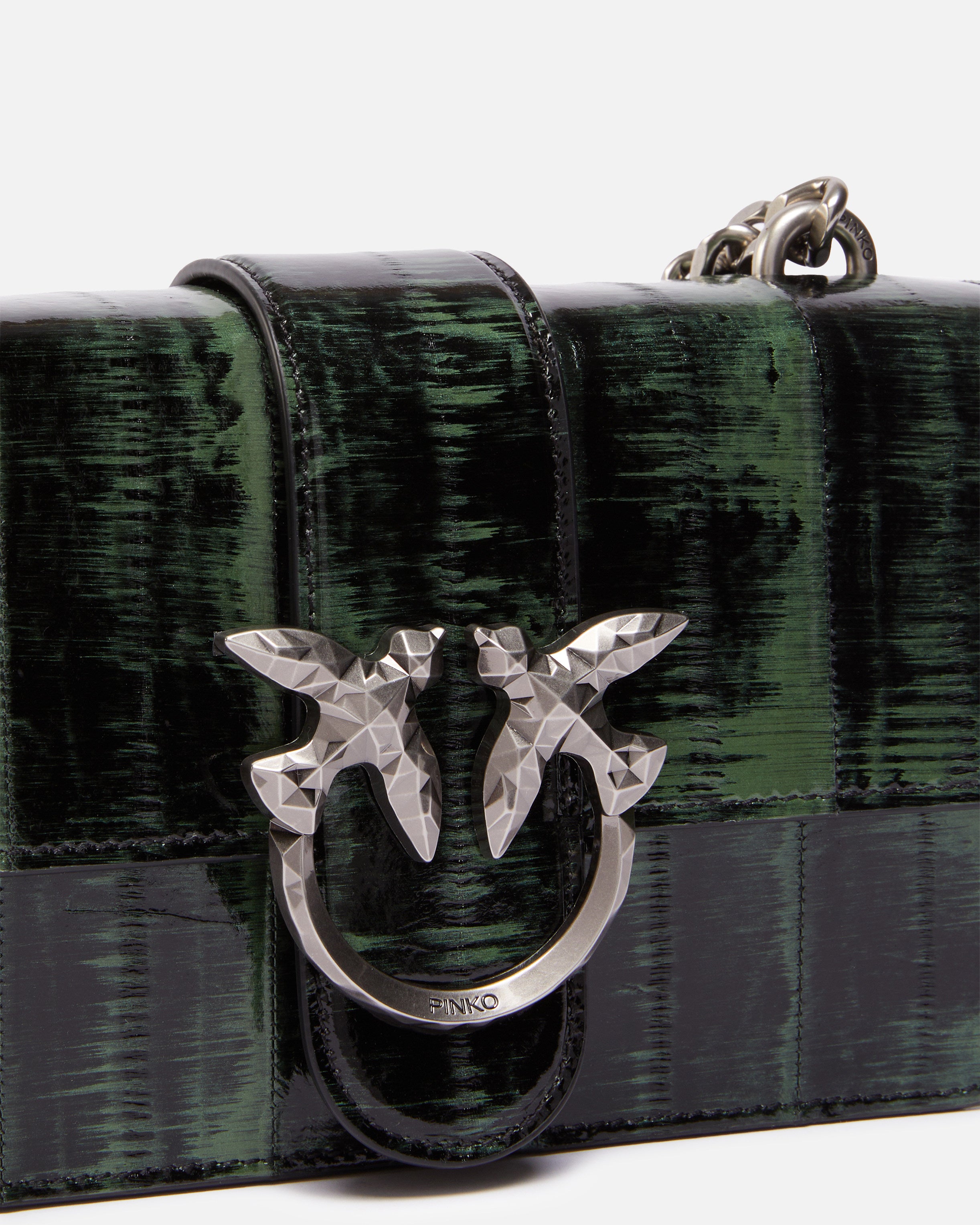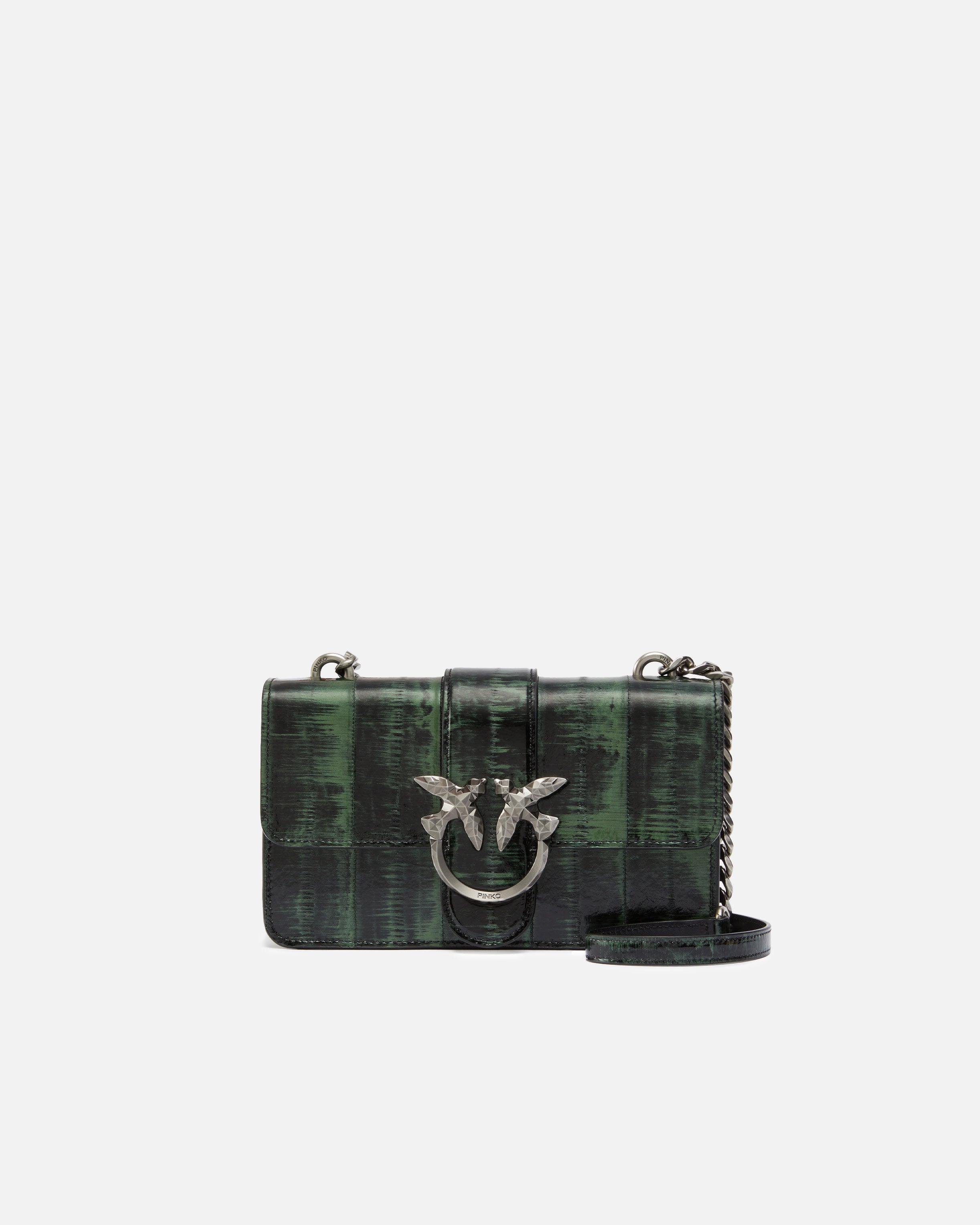 Pequeña bandolera Mini Love Bag en piel de mixino, caracterizada por una textura delicada especial y, al mismo tiempo, resistente y sofisticada, acabada con un efecto degradado. Las pieles, que son de pequeñas dimensiones, se cosen una al lado de la otra para conseguir superficies más grandes a partir de las que, posteriormente, se obtienen los cortes necesarios. Las manchas, las cicatrices y las diferencias de color entre pieles deben considerarse una característica que convierte cada bolso en una pieza única. El cierre del bolso se completa con un pasador y la emblemática hebilla de metal con el logotipo de pajaritos Love Birds Diamond Cut tallado con efecto facetado. La correa, a juego con el bolso, combina la clásica cadena redonda de metal con una práctica hombrera de piel para llevarlo cómodamente al hombro. El bolso forma parte de la colección cápsula especial de edición limitada creada en exclusiva para PINKO Galleria. ¡Utiliza el chip especial NFC para vivir una experiencia única sobre el bolso que has comprado!
