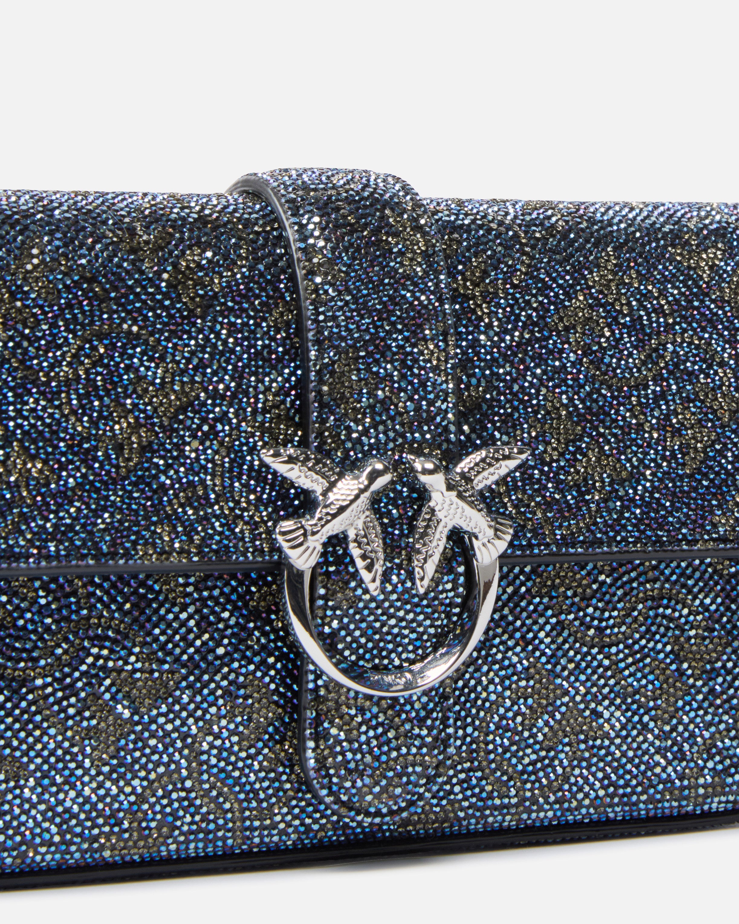 Bolso de hombro pequeño Baby Love Bag Slouchy realizado en piel y totalmente recubierto de pedrería de diferentes colores que forman un motivo monograma en toda la superficie para un look brillante perfecto. Caracterizado por una correa bandolera ajustable de piel y cadena para llevarlo al hombro o cruzado, el bolsito resulta extremadamente elegante y práctico. El cierre de solapa se completa con la atemporal hebilla con el logotipo de los pajaritos Love Birds Diamond Cut. El interior presenta un forro de dril de algodón e incluye un bolsillo plano con cierre de cremallera. ¡Activa tu bolso PINKO: verifica la autenticidad de tu producto y accede a la experiencia personalizada acercando tu smartphone al bordado Love Birds que encontrarás en la parte posterior del bolso!