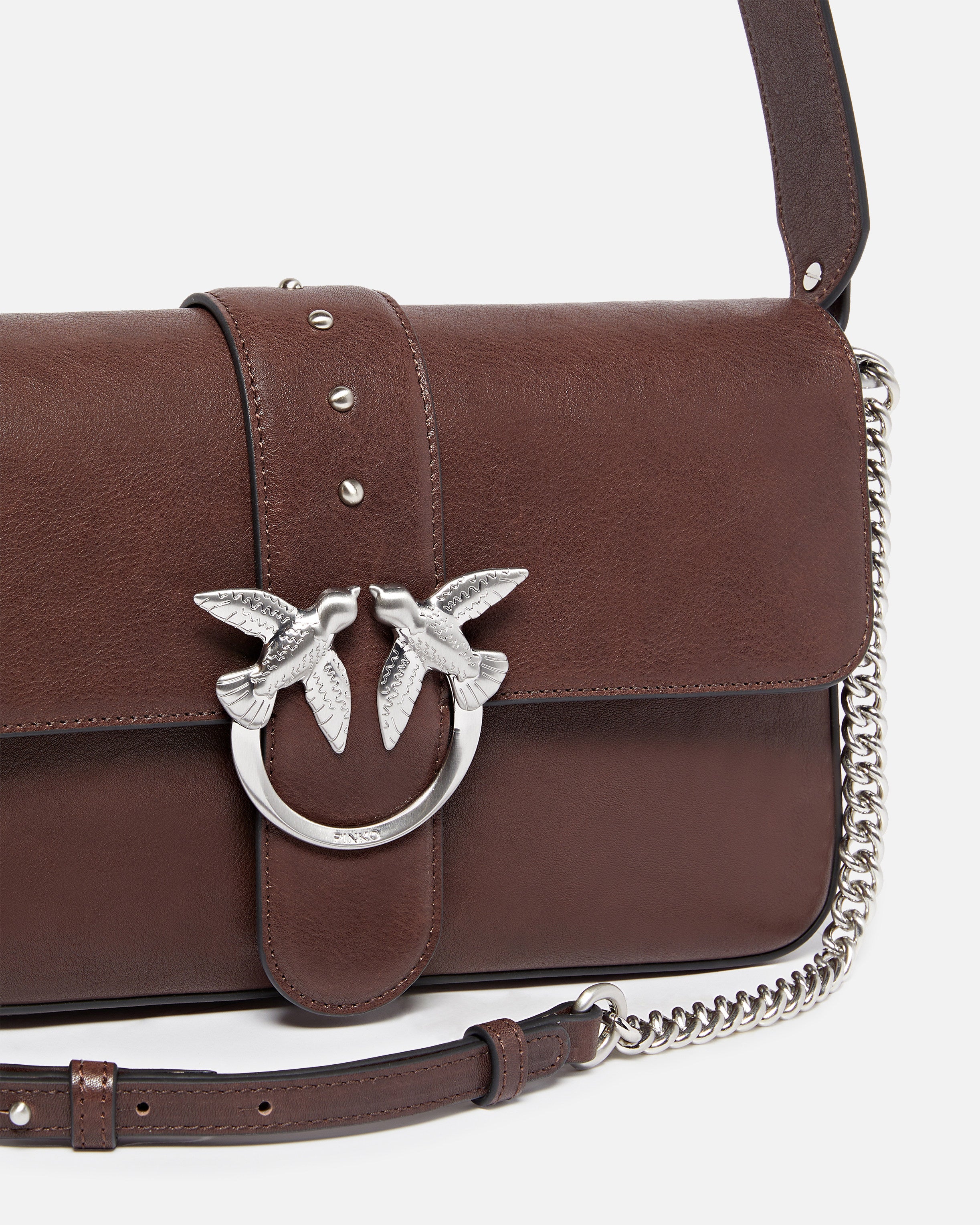 Bolso mediano Classic Love Bag Slouchy de piel suave, con forro de algodón y bolsillo interior con cremallera para guardar de forma segura tus objetos personales. Las pequeñas tachuelas y la cremallera de metal que recorre los laterales y la parte inferior añaden un distintivo detalle motero, mientras que la hebilla Love Birds Diamond Cut se convierte en portavoz del inimitable estilo PINKO. El accesorio se completa con dos correas diferentes: una bandolera ancha y ajustable de piel y una bandolera extraíble que combina una cadena metálica y una hombrera de piel. ¡Activa tu bolso PINKO: verifica la autenticidad de tu producto y accede a la experiencia personalizada acercando tu smartphone al bordado Love Birds que encontrarás en la parte posterior del bolso!