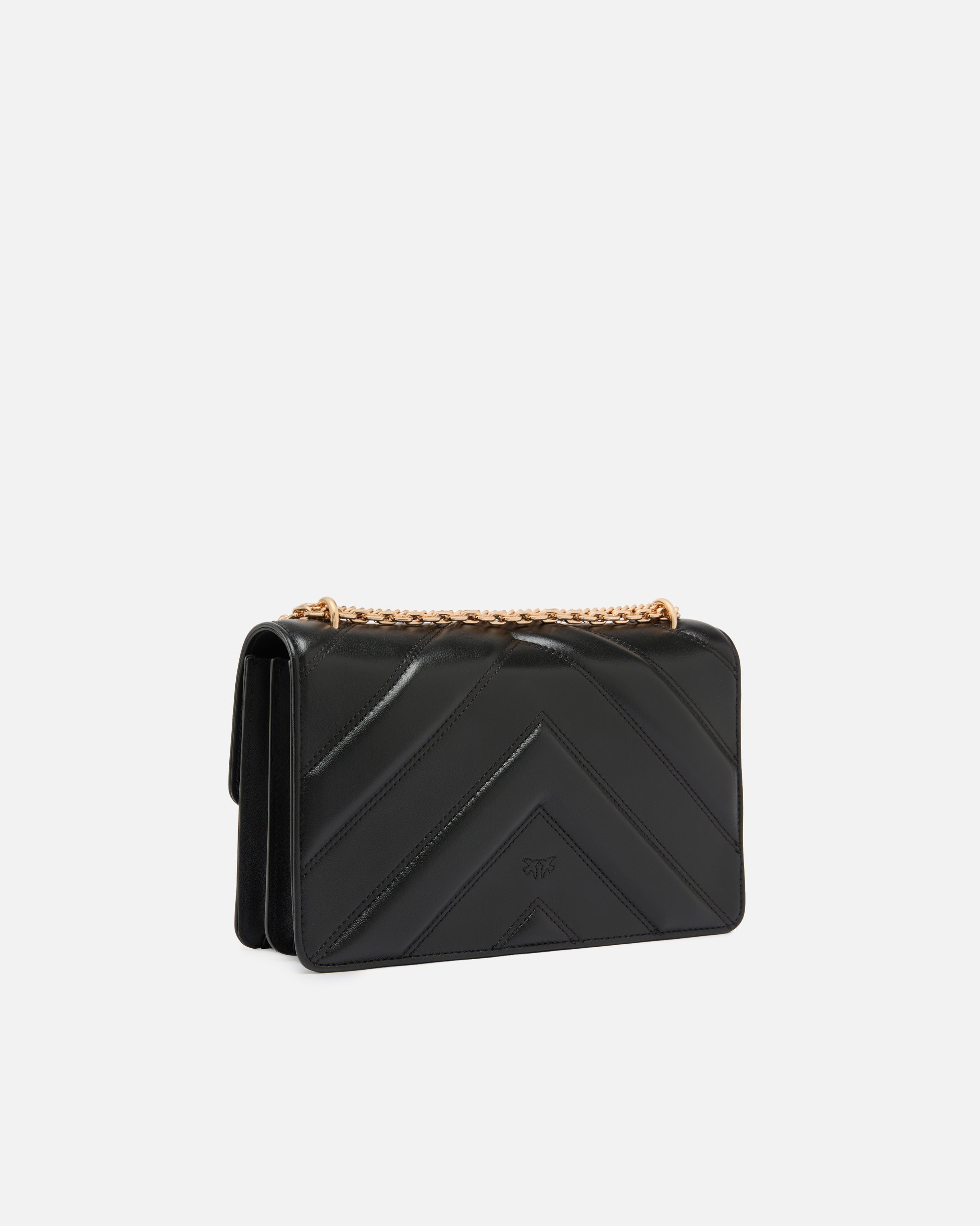Bolso Love Bag One de tamaño mediano caracterizado por un motivo chevrón que alterna inserciones de piel suave y sedosa con inserciones de napa, creando un efecto pespunteado ligeramente acolchado. Este modelo presenta un cierre con botón magnético completado con la emblemática hebilla Love Birds Diamond Cut y cuenta con una bandolera con hombrera a juego de piel y triple cadena: una de hilo redondo, otra de eslabones rectangulares y otra de pequeños eslabones redondos, para ofrecer un efecto final que refleja plenamente la creatividad de la marca. El interior, forrado de dril de algodón, incluye un panel divisorio con cierre de cremallera que divide el espacio en dos compartimentos. ¡Activa tu bolso PINKO: verifica la autenticidad de tu producto y accede a la experiencia personalizada acercando tu smartphone al bordado Love Birds que encontrarás en la parte posterior del bolso!