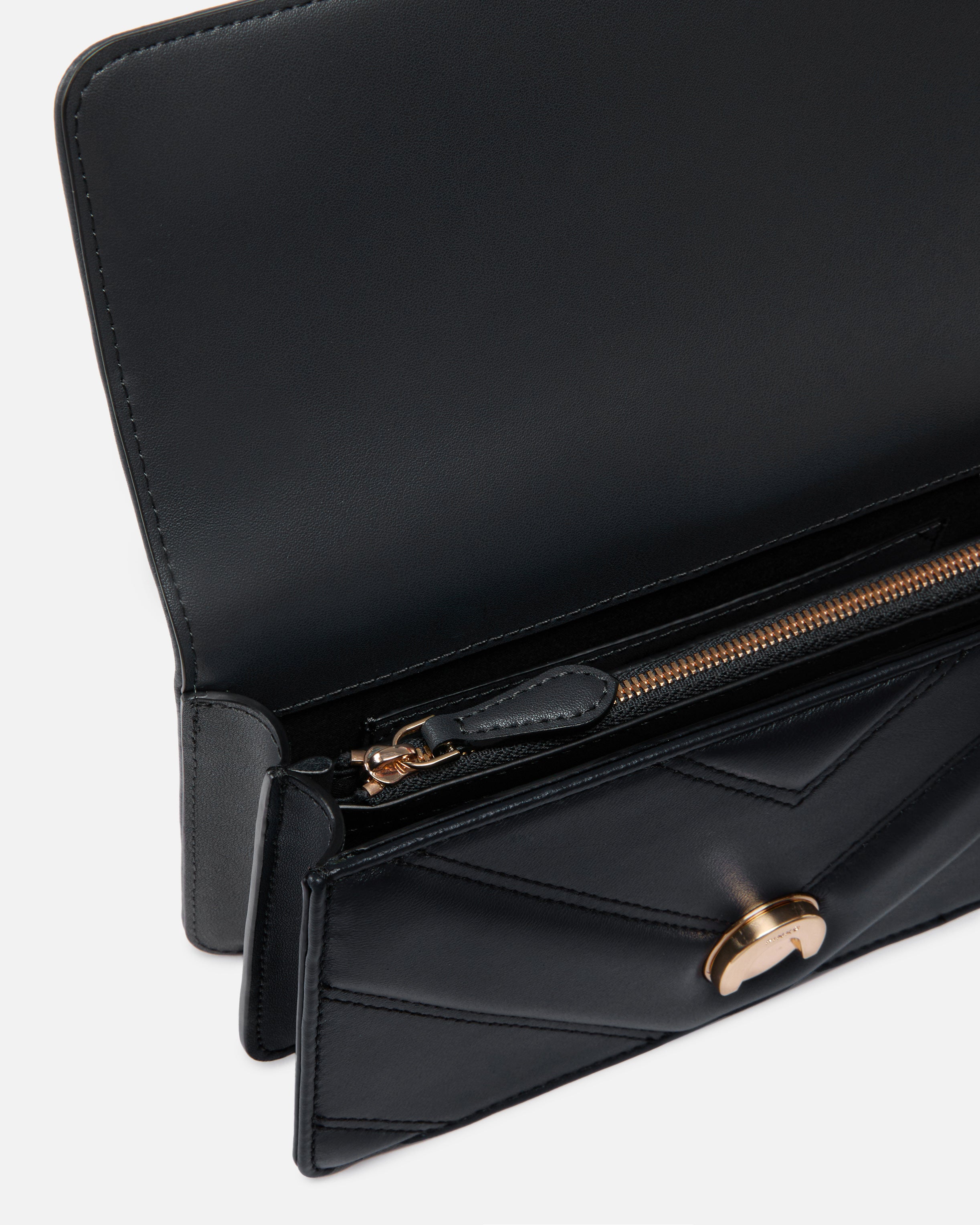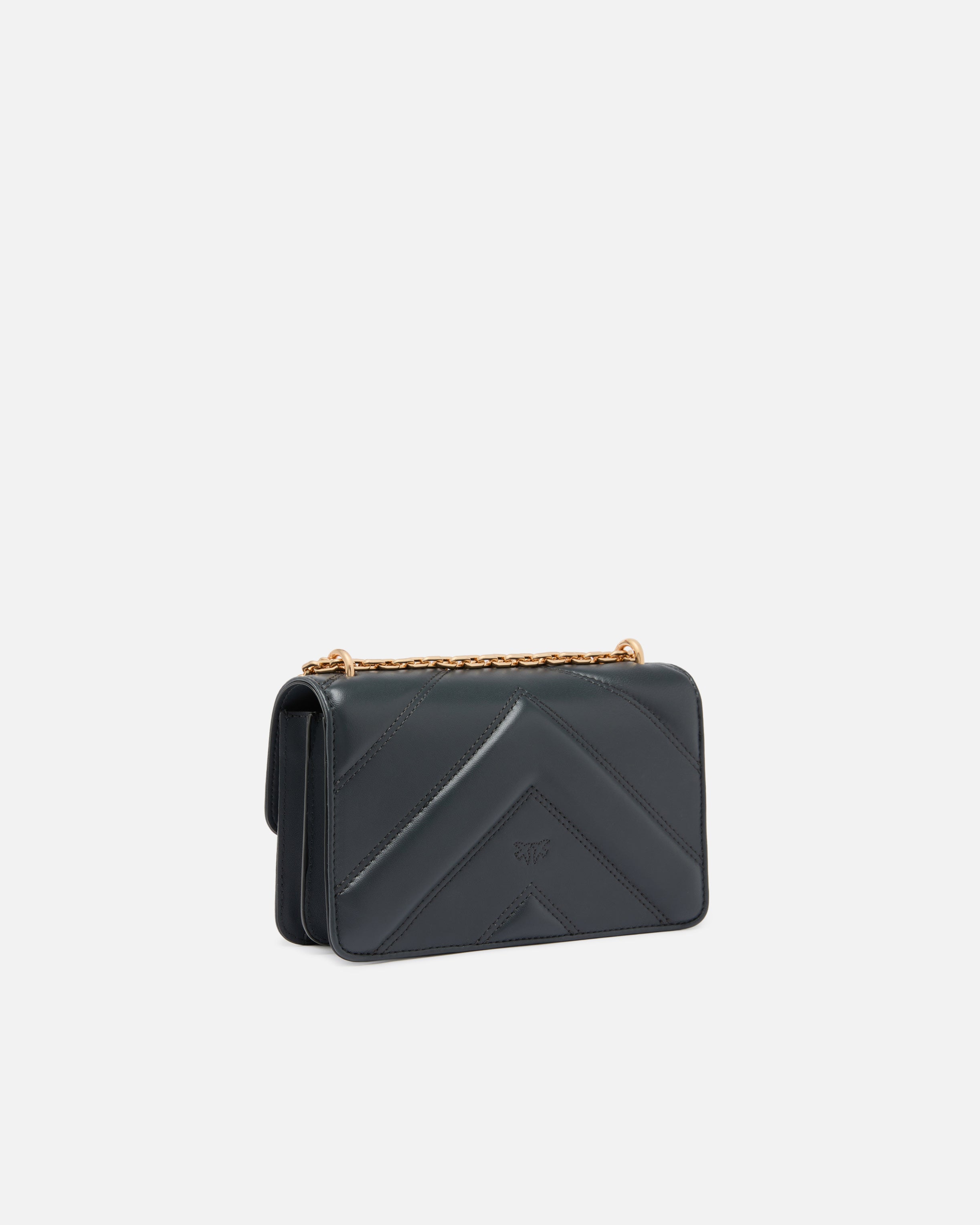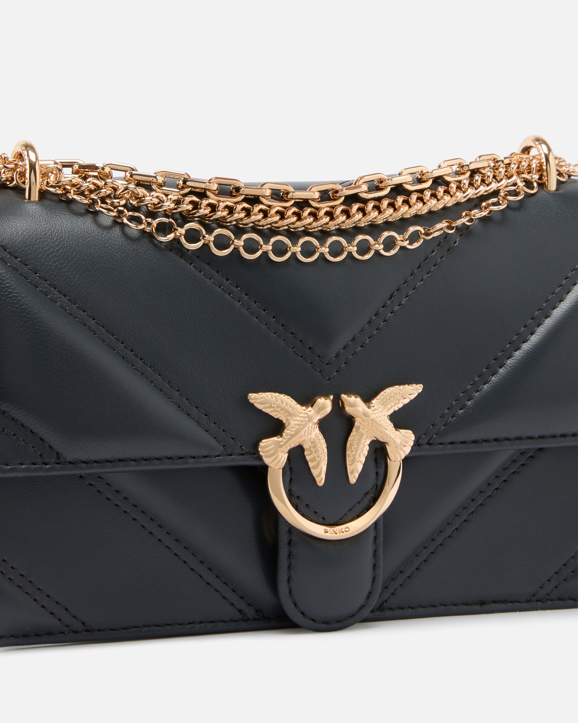 Bolso pequeño Mini Love Bag One caracterizado por un motivo chevrón que alterna inserciones de piel suave como la seda con inserciones de napa, creando un efecto pespunteado ligeramente acolchado. Este modelo presenta un cierre con botón magnético completado con la emblemática hebilla Love Birds Diamond Cut y cuenta con una bandolera con hombrera a juego de piel y triple cadena: una de hilo redondo, otra de eslabones rectangulares y otra de pequeños eslabones redondos, para ofrecer un efecto final que refleja plenamente la creatividad de la marca. El interior, forrado de dril de algodón, incluye un panel divisorio con cierre de cremallera que divide el espacio en dos compartimentos. ¡Activa tu bolso PINKO: verifica la autenticidad de tu producto y accede a la experiencia personalizada acercando tu smartphone al bordado Love Birds que encontrarás en la parte posterior del bolso!
