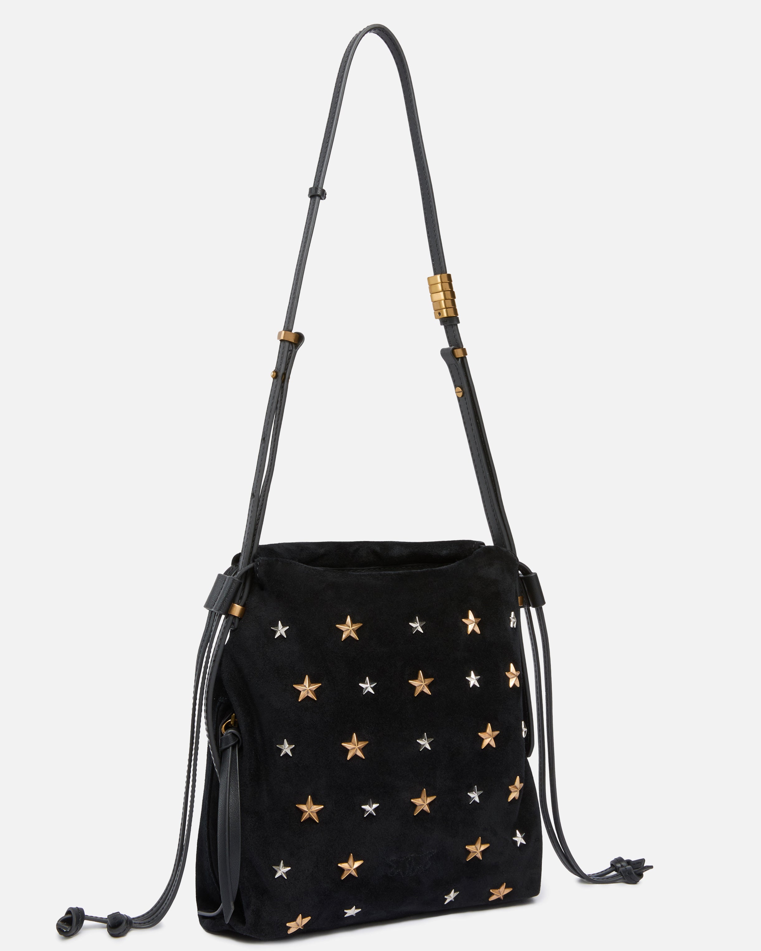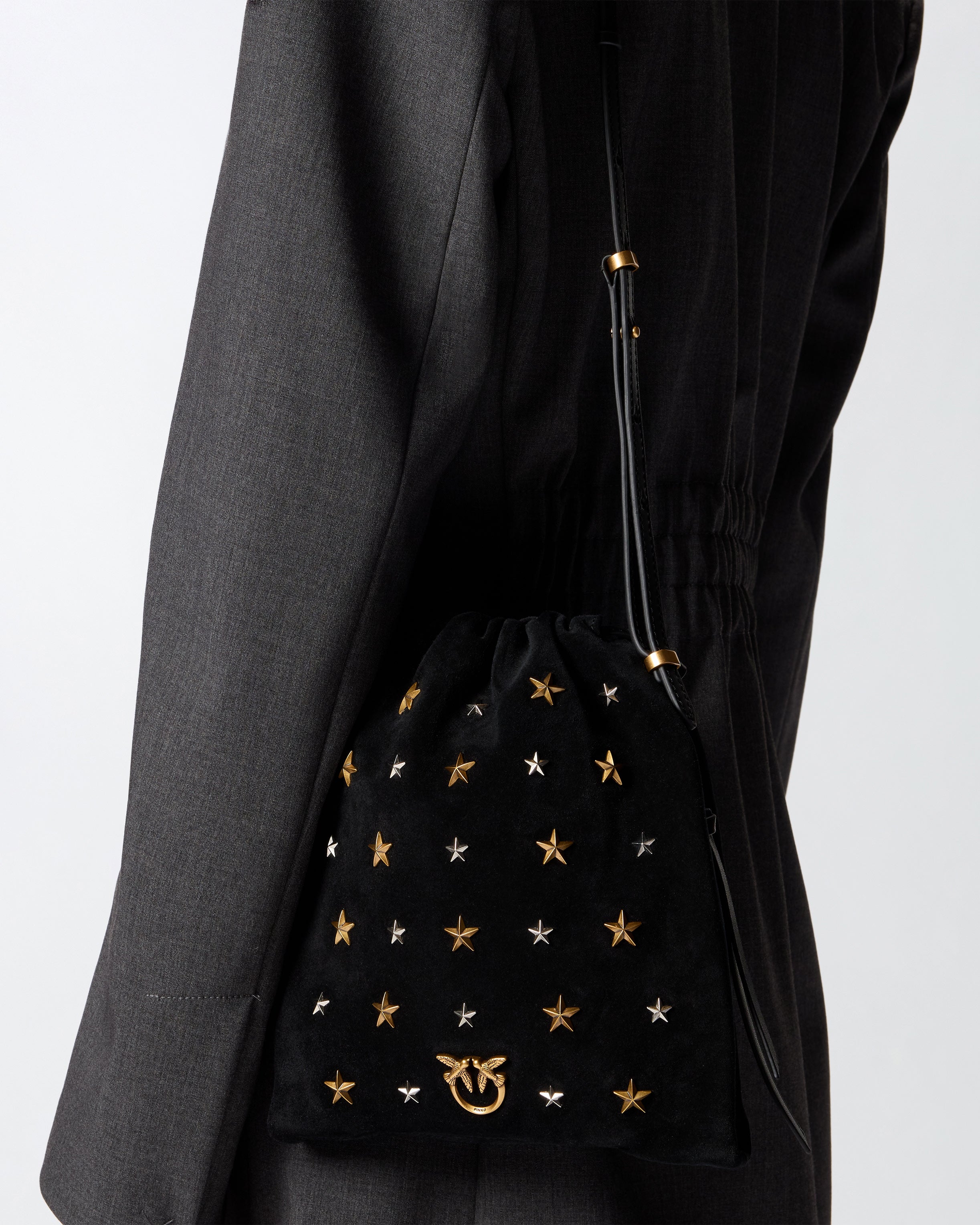 Bolso de hombro pequeño Mini Slouchy Bag de ante suave y línea flexible y desestructurada, con forro de algodón. Accesorio distintivo de infinitos looks, este bolsito cuenta con cordón ajustable y cremallera lateral para regular el cierre estilo saco y un bolsillo interior con cremallera para guardar de forma segura tus objetos personales. El diseño resulta versátil gracias a la correa de piel que permite llevarlo de varias maneras según prefieras. El modelo está adornado con minitachuelas en forma de estrella que aportan un aire soñador, mientras que el icónico logotipo Love Birds se convierte en portavoz del inimitable estilo PINKO. ¡Activa tu bolso PINKO: verifica la autenticidad de tu producto y accede a la experiencia personalizada acercando tu smartphone al bordado Love Birds que encontrarás en la parte posterior del bolso!