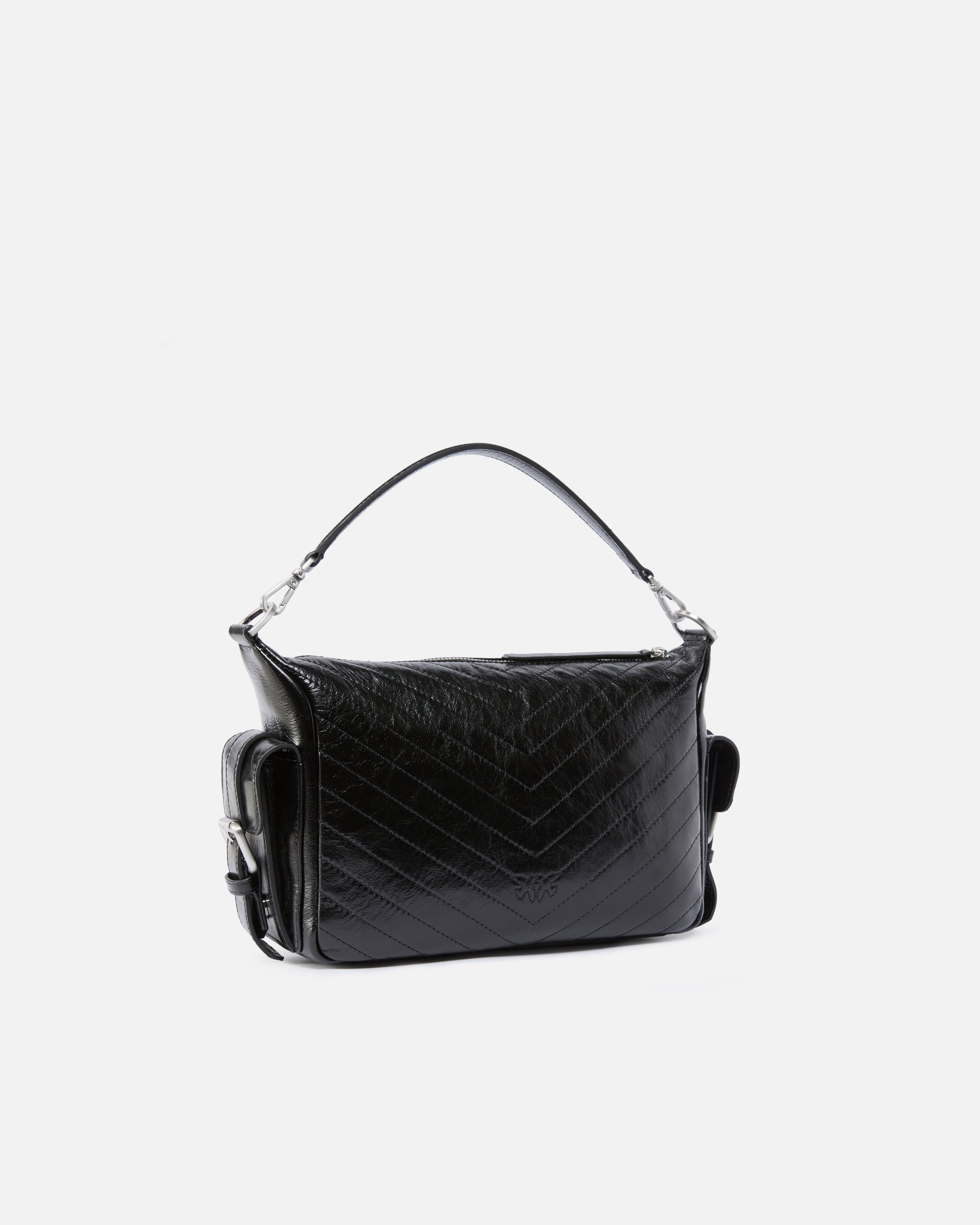 Bolso de mano Cargo Bag de tamaño mediano en piel de textura arrugada, ligeramente ondulada, con pespunteado de chevrón y forro interior de algodón. Caracterizado por una correa ajustable de piel y un asa superior, ambas extraíbles para personalizar la forma de llevarlo, el bolso resulta extremadamente versátil y práctico. Accesorio distintivo de infinitos looks, este modelo cuenta con dos bolsillos exteriores con cremallera para guardar de forma segura tus objetos personales. El elegante diseño se completa con el logotipo Love Birds, que se convierte en portavoz del inimitable estilo de la marca. ¡Activa tu bolso PINKO: verifica la autenticidad de tu producto y accede a la experiencia personalizada acercando tu smartphone al bordado Love Birds que encontrarás en la parte posterior del bolso!