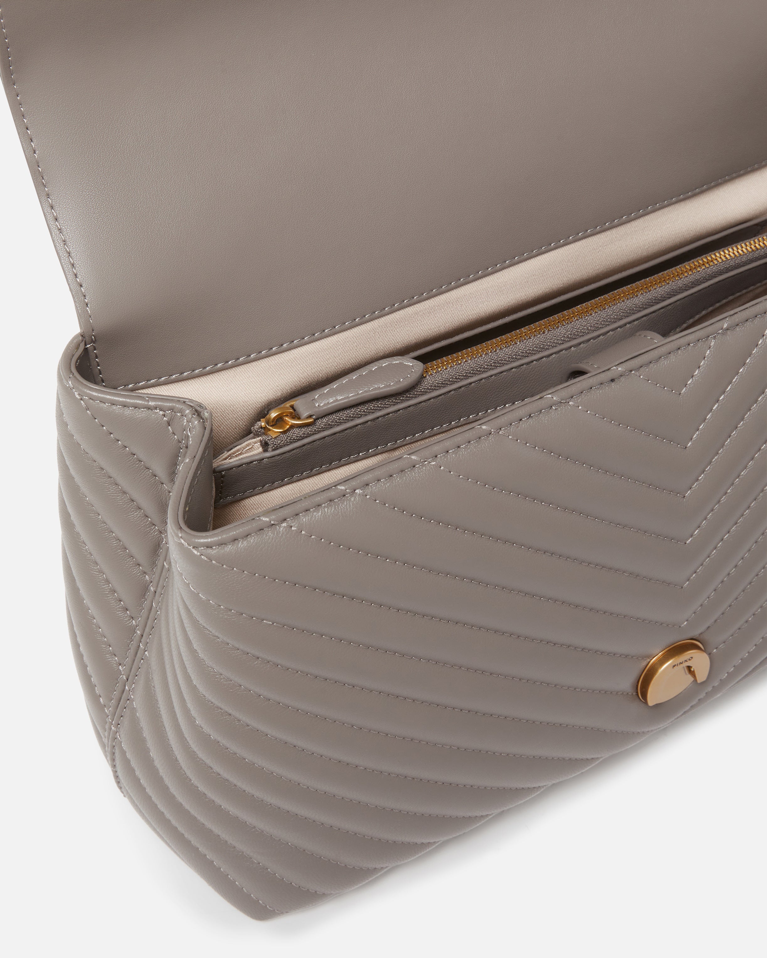 Bolso Big Love Bag Puff de napa acolchada con motivo chevrón. El cierre se completa con la emblemática hebilla Love Birds Diamond Cut de metal. El interior presenta un forro de microfibra con efecto ante e incluye un panel divisorio con cierre de cremallera y un bolsillo interno. La correa combina la clásica cadena redonda de metal con una práctica hombrera regulable de napa.