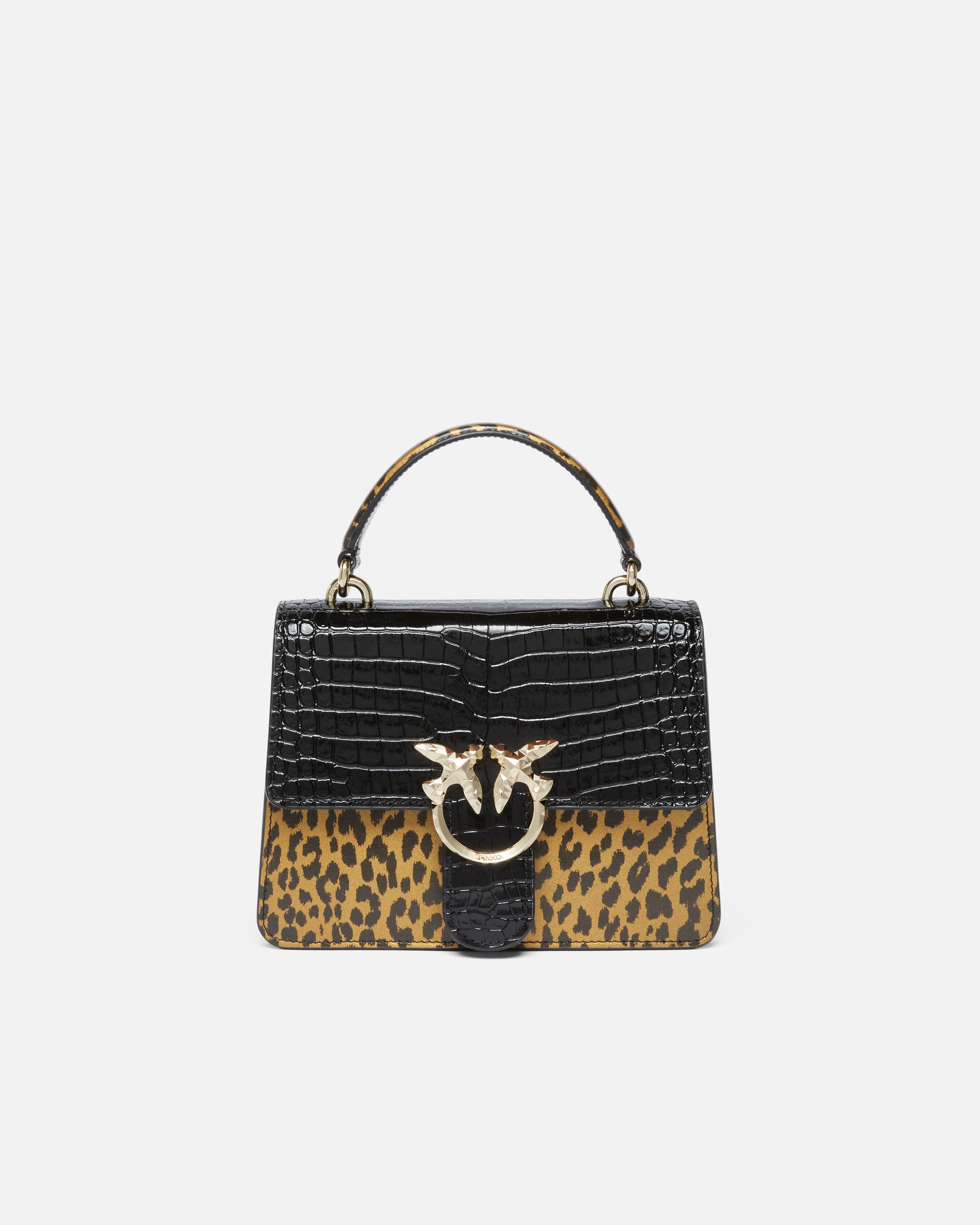 Pequeña bandolera de piel brillante con estampado de cocodrilo y detalles de piel lisa con estampado animal moteado en dos colores. Este bolso de forma trapezoidal se caracteriza por una estructura semirrígida, con un asa superior para llevarlo en la mano y una correa extraíble que combina la clásica cadena metálica con una práctica hombrera ajustable de piel, para que lo puedas llevar de dos maneras. El interior del bolso presenta un forro de tejido e incluye un bolsillo plano con cremallera para organizar mejor el espacio. El cierre magnético con solapa se completa con la emblemática hebilla metálica con el logotipo de los pajaritos Love Birds Diamond Cut, realizada con un efecto facetado especial. El bolso forma parte de la colección cápsula especial de edición limitada creada en exclusiva para PINKO Galleria. ¡Utiliza el chip especial NFC para vivir una experiencia única sobre el bolso que has comprado!