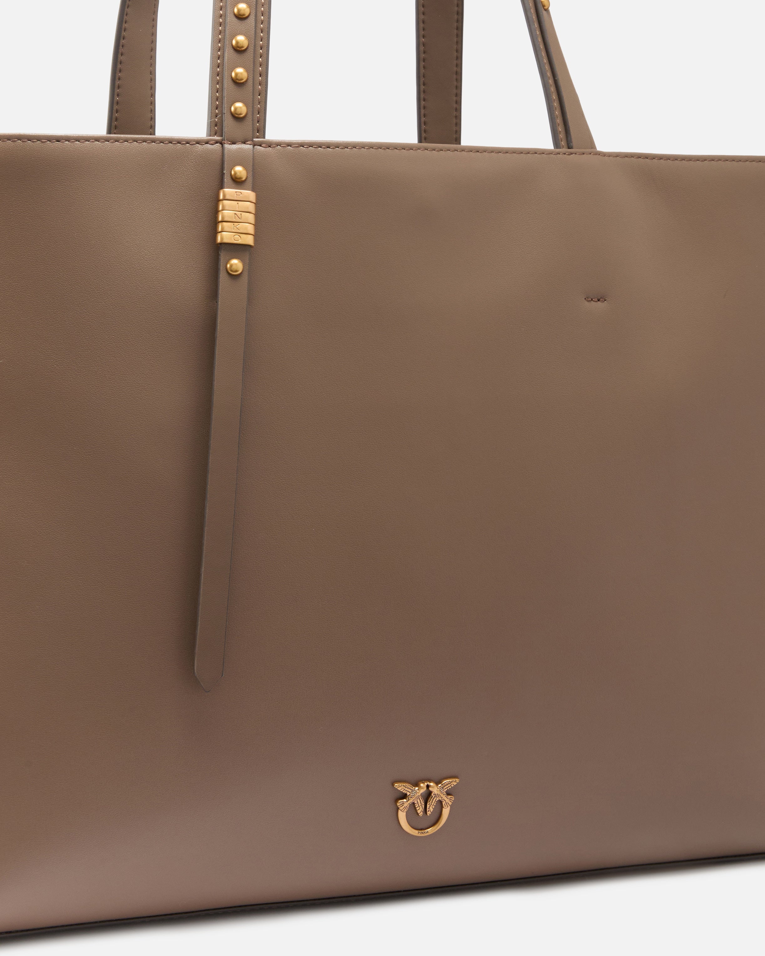 Bolso shopper de tamaño mediano con forma alargada, realizado en piel suave y personalizado con elementos decorativos metálicos a lo largo de las asas superiores: una serie de pequeñas tachuelas redondas y de anillas que forman la inscripción del logotipo PINKO. El modelo, que se lleva cómodamente al hombro gracias a las dos asas, se realza con cordones laterales en la parte inferior y con una pequeña aplicación metálica que representa el icónico logotipo Love Birds Diamond Cut en la parte delantera. Este accesorio, perfecto para llevar tus objetos personales siempre contigo durante el día, es la solución que estabas buscando para añadir un toque de elegancia a tus conjuntos sin renunciar a la funcionalidad. ¡Activa tu bolso PINKO: verifica la autenticidad de tu producto y accede a la experiencia personalizada acercando tu smartphone al bordado Love Birds que encontrarás en la parte posterior del bolso!