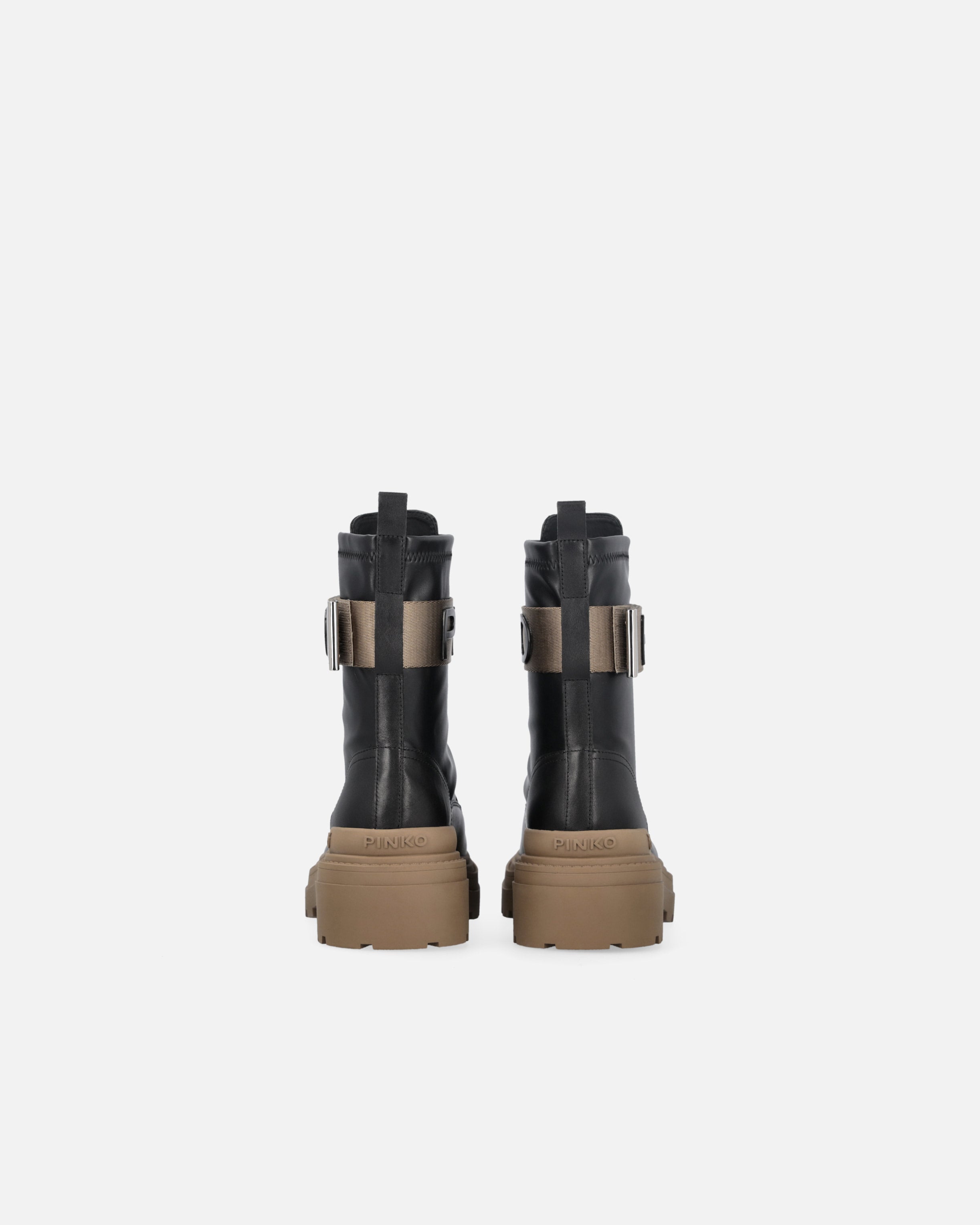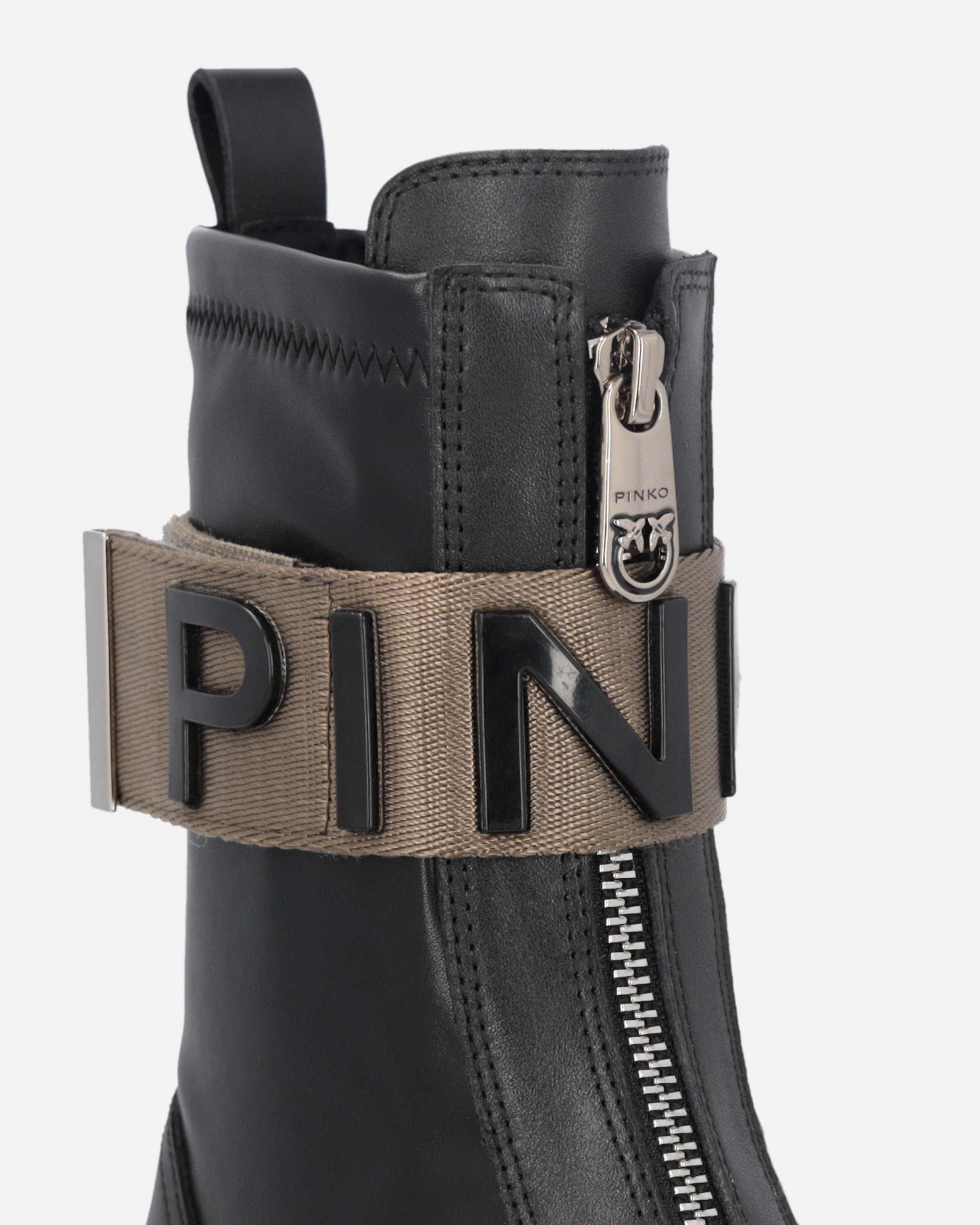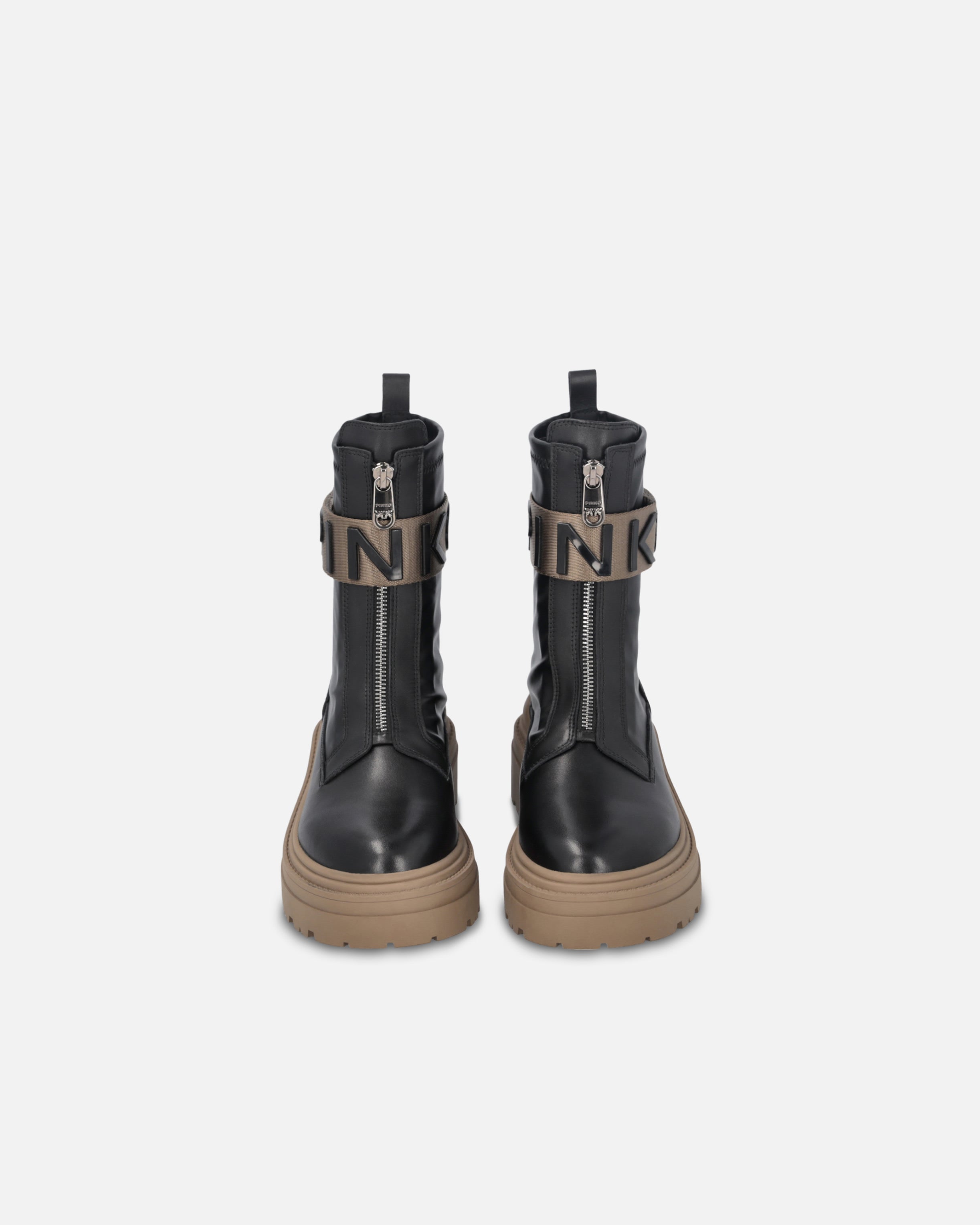 Botas hasta el tobillo de piel con suela en relieve de plataforma de goma, forro de piel, cierre de cremallera en la parte delantera y tirador trasero para facilitar el calzado. El toque final está dado por la banda de cinta técnica con el logotipo de la inscripción PINKO. Modernas y versátiles, estas botas militares son perfectas para un look casual y atrevido. Altura de la suela de plataforma: 5,5 cm.