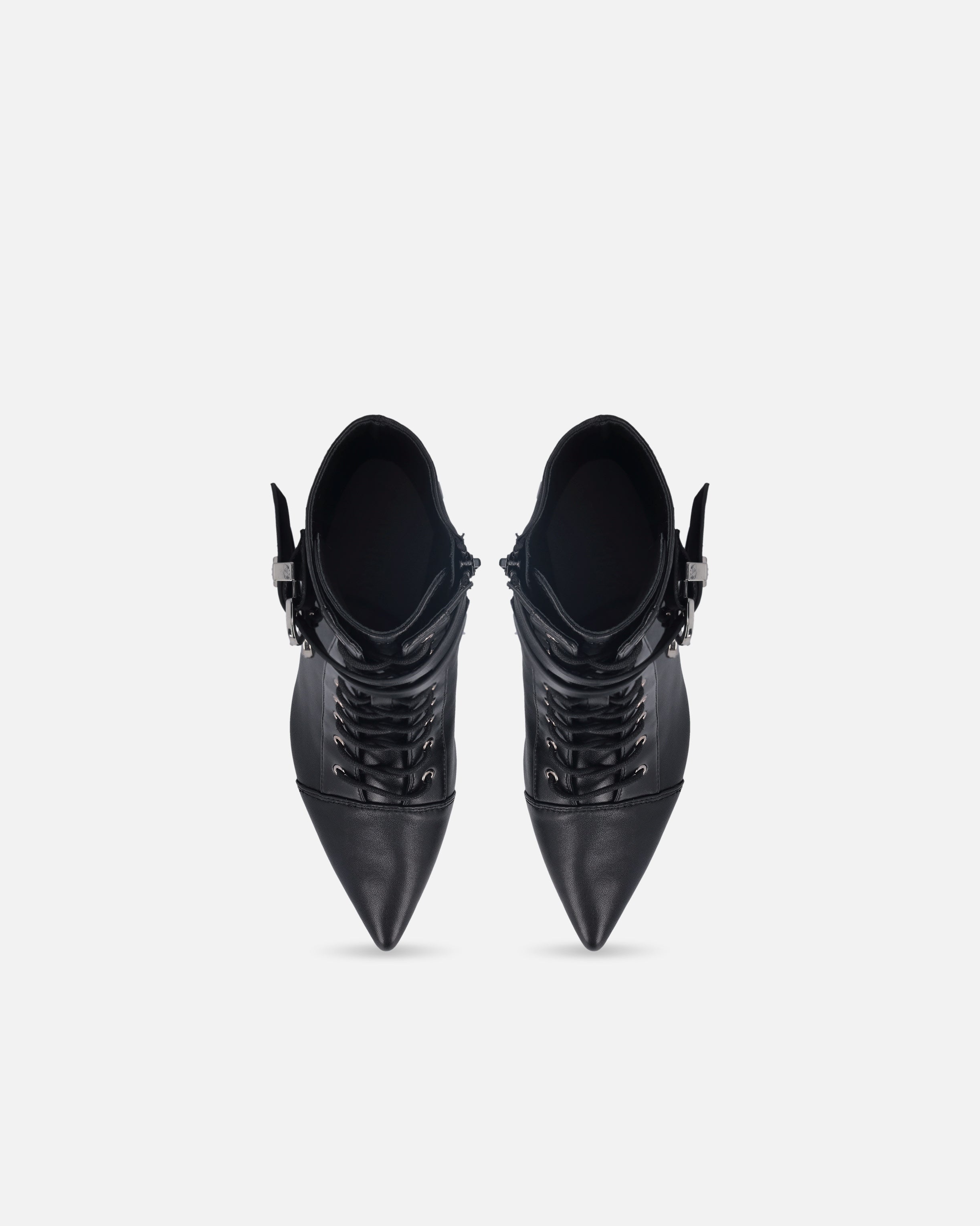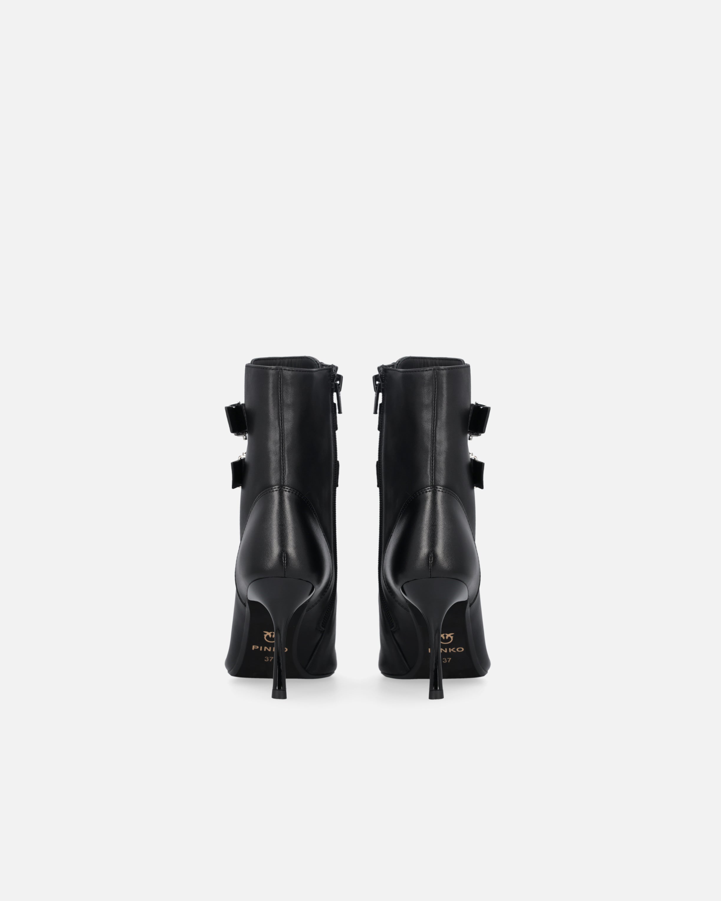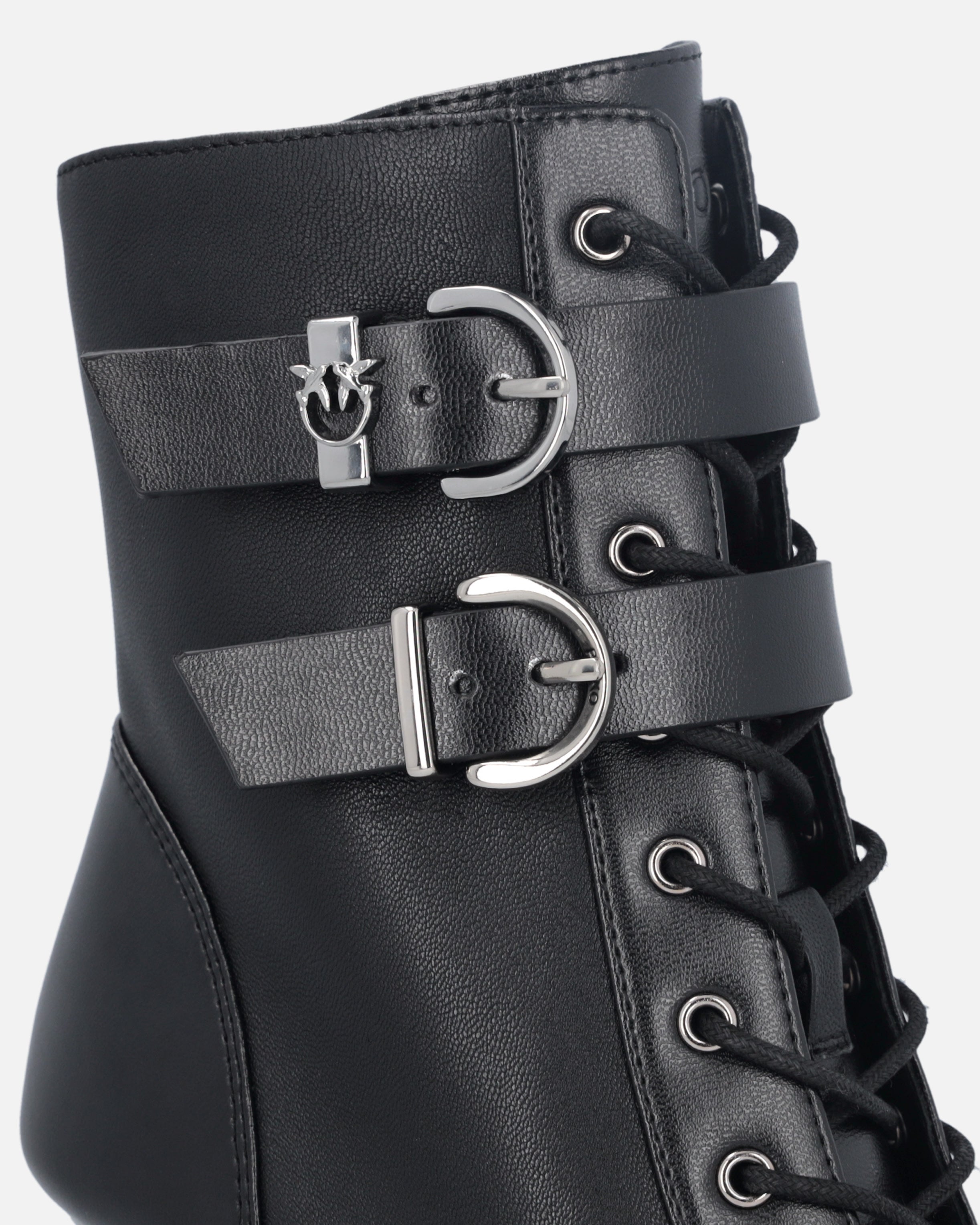 Botines con cordones realizados en suave piel con efecto brillante y caña de 14 cm de altura. El tacón fino de 9 cm de altura estiliza la figura sin renunciar a la comodidad, para ofrecer un equilibrio perfecto entre estilo y funcionalidad. El modelo está rematado con dos correas con hebilla en la caña, una de ellas adornada con el logotipo Love Birds en la trabilla metálica. Gracias a su versatilidad, este modelo será ideal para acompañarte en las ocasiones más especiales, por ejemplo en combinación con una falda elegante.