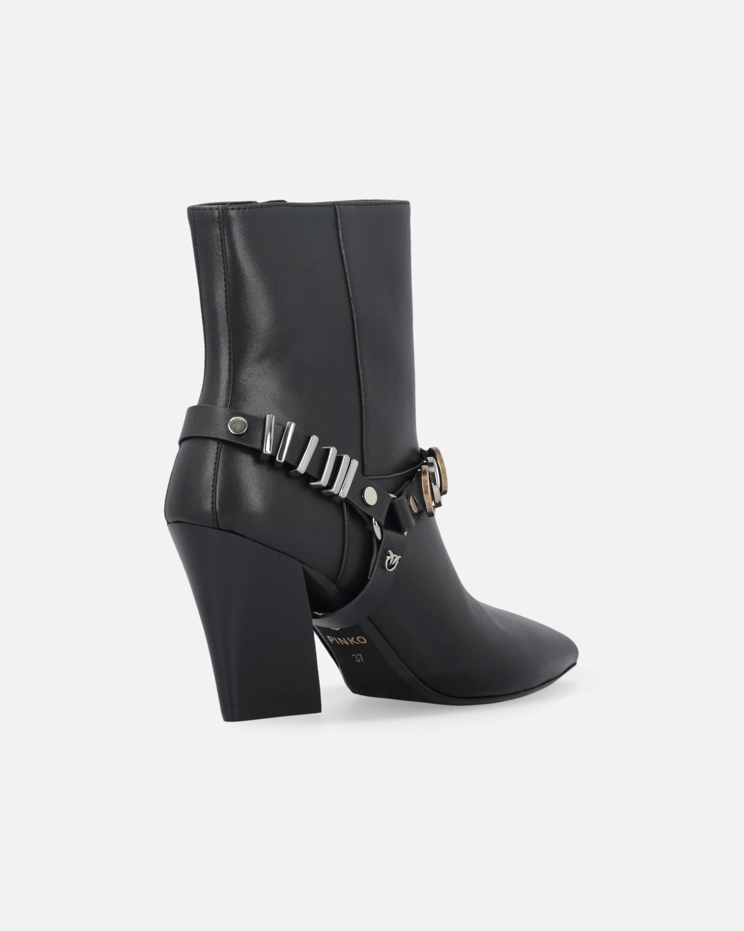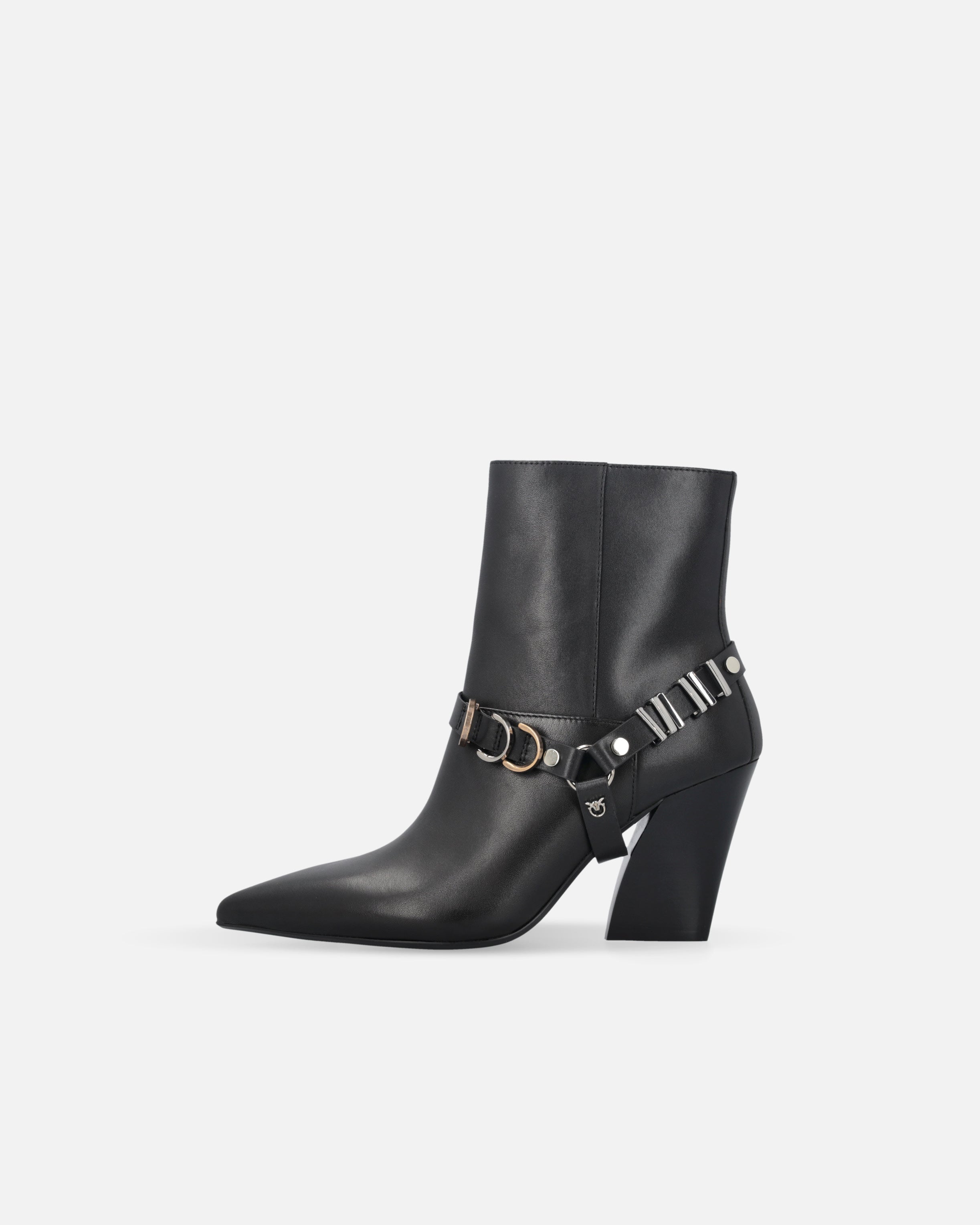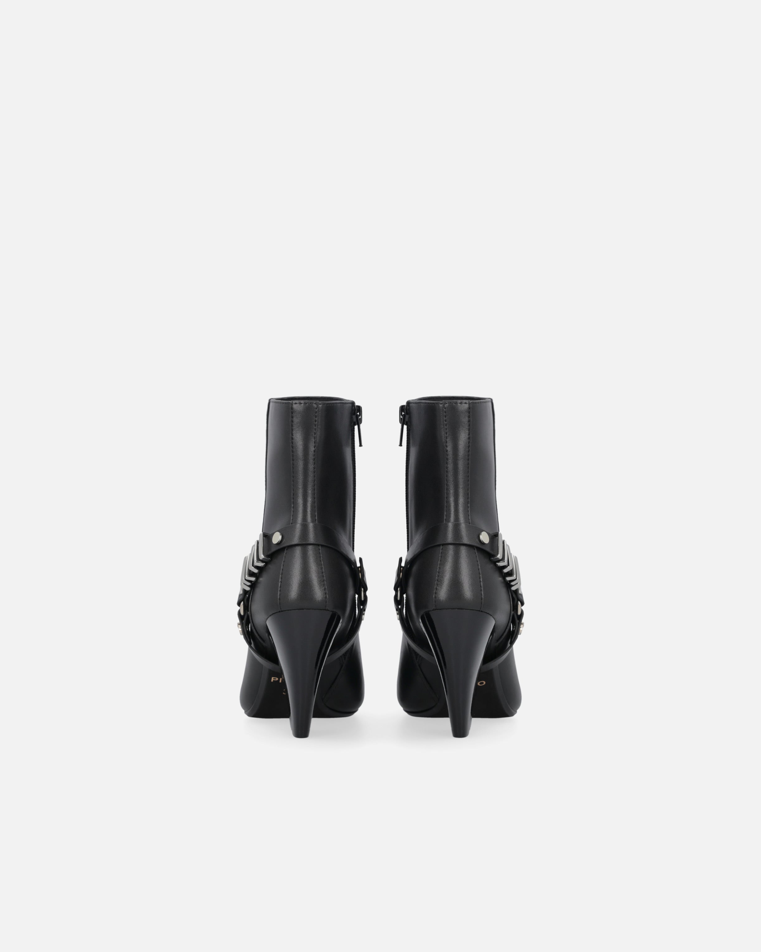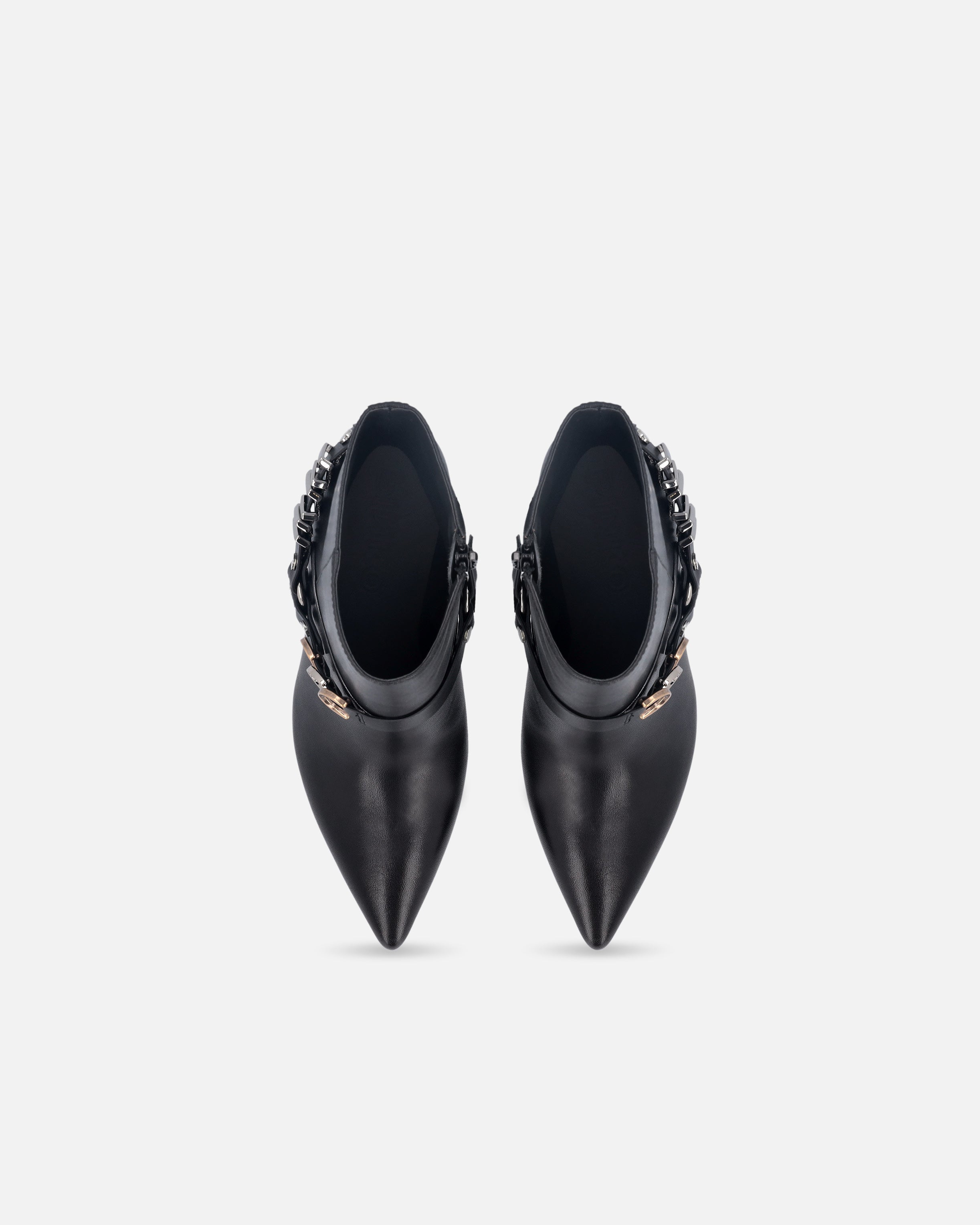 Botines realizados en suave piel con efecto brillante y caña de 13 cm de altura. El tacón de 8,5 cm de altura estiliza la figura sin renunciar a la comodidad, para ofrecer una combinación perfecta de estilo y funcionalidad. El modelo se completa con una triple correa cruzada extraíble enriquecida con el logotipo Love Birds en acero y trabillas metálicas doradas y plateadas, lo que hace que el zapato sea perfecto para quienes buscan un equilibrio entre audacia y elegancia.