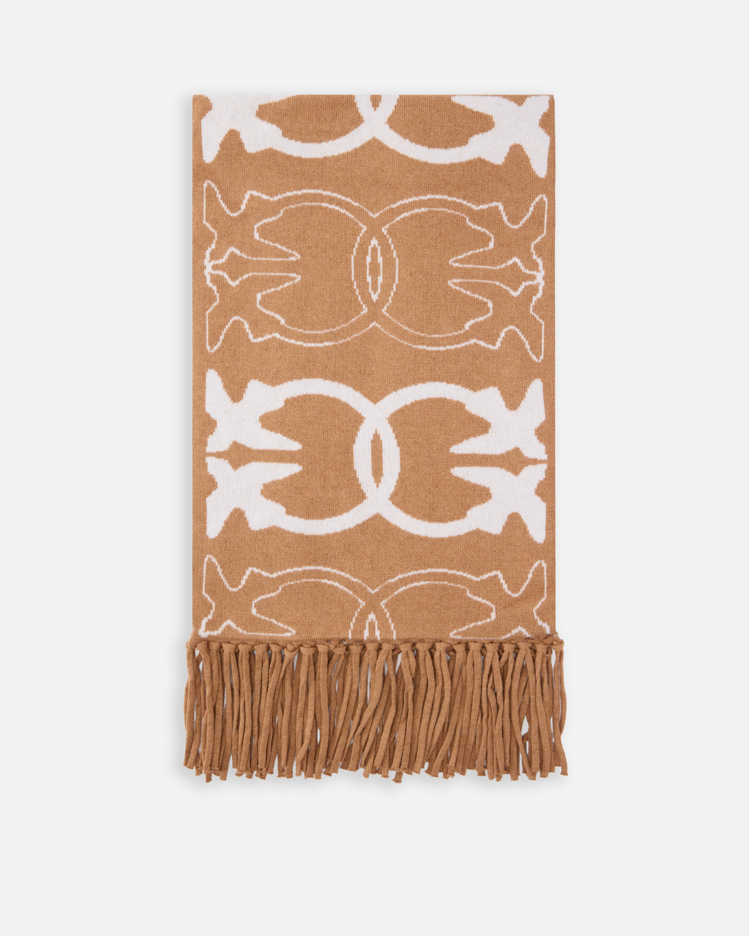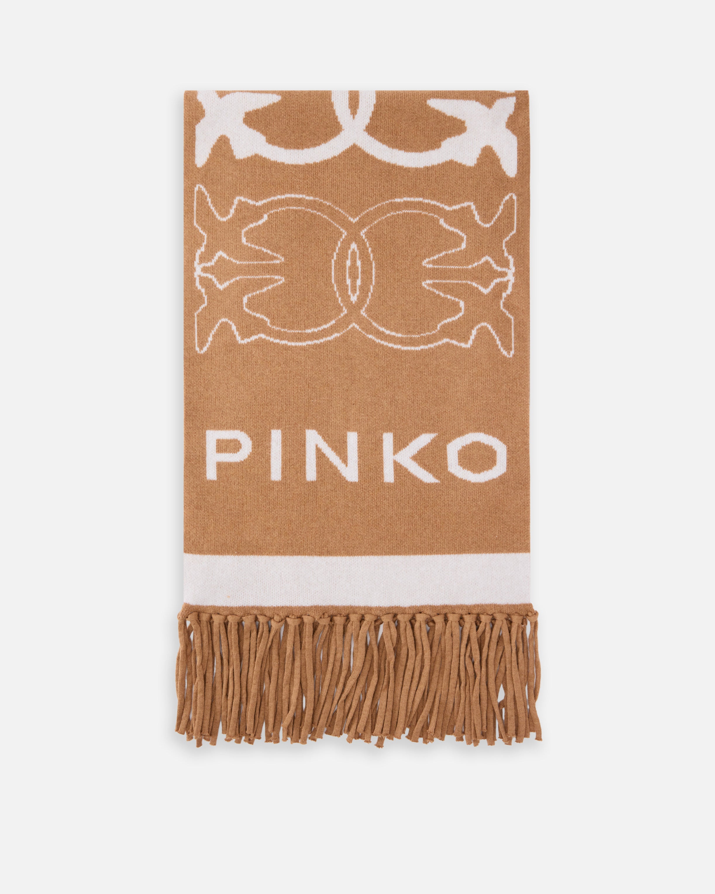 Bufanda de mezcla de lana, cachemira y viscosa de tacto suave. Los extremos en contraste, el motivo del logotipo Love Birds en punto jacquard por toda la superficie y el maxilogotipo de letras PINKO son elementos impactantes que enriquecen el diseño. Los flecos en el borde completan el look aportando un toque de movimiento. Enfréntate a los días más fríos al más puro estilo PINKO con este básico refinado del armario de invierno.