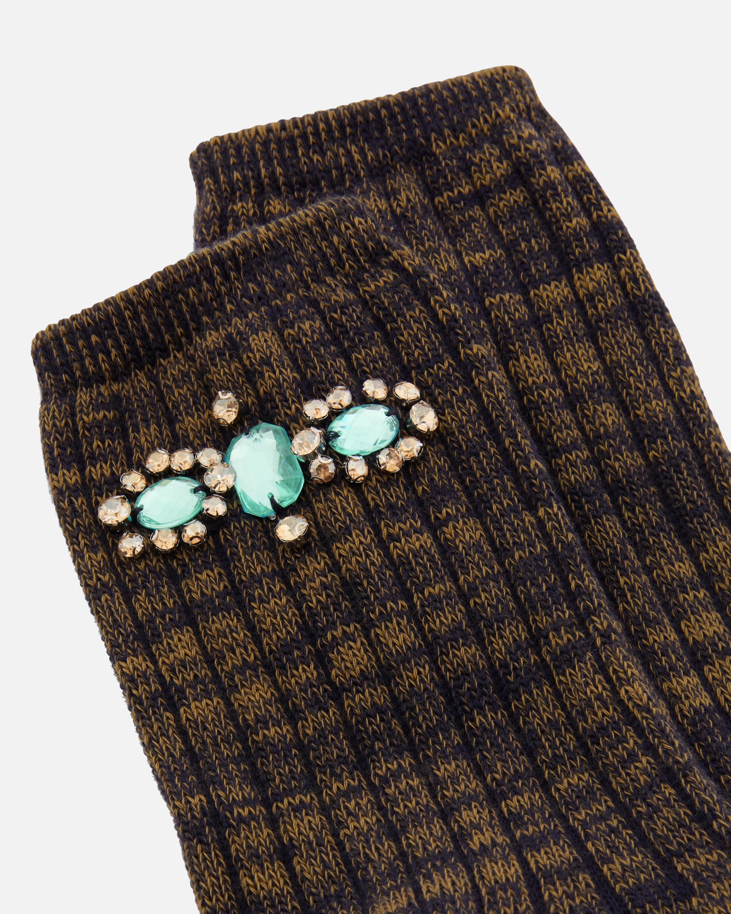 Calcetines medianos de tacto suave confeccionados en canalé. Adornado con un bordado de cristales realizado íntegramente a mano, este accesorio aportará un toque de originalidad a tu armario. Luce el modelo con unos zapatos planos y completa tus looks al más puro estilo PINKO.