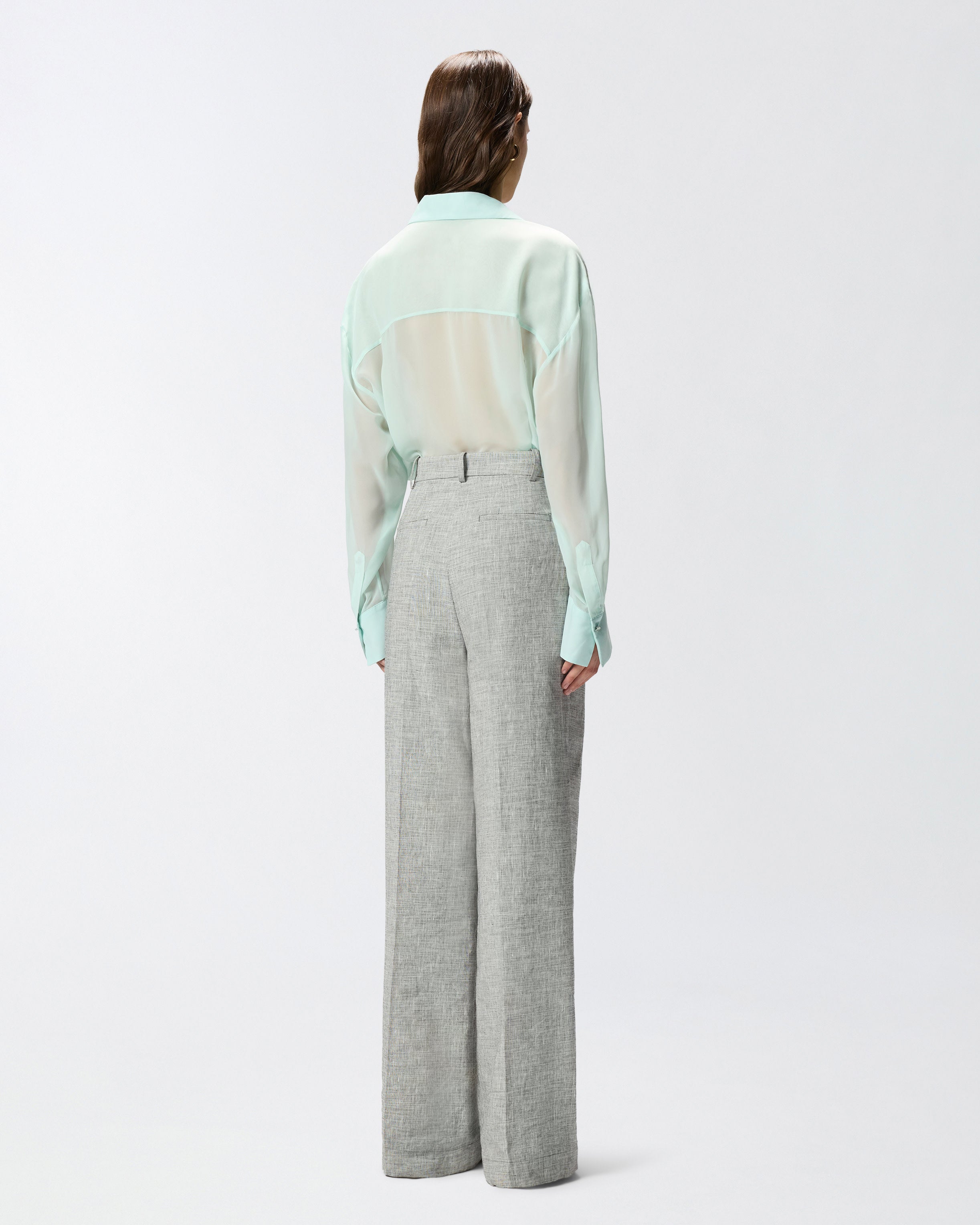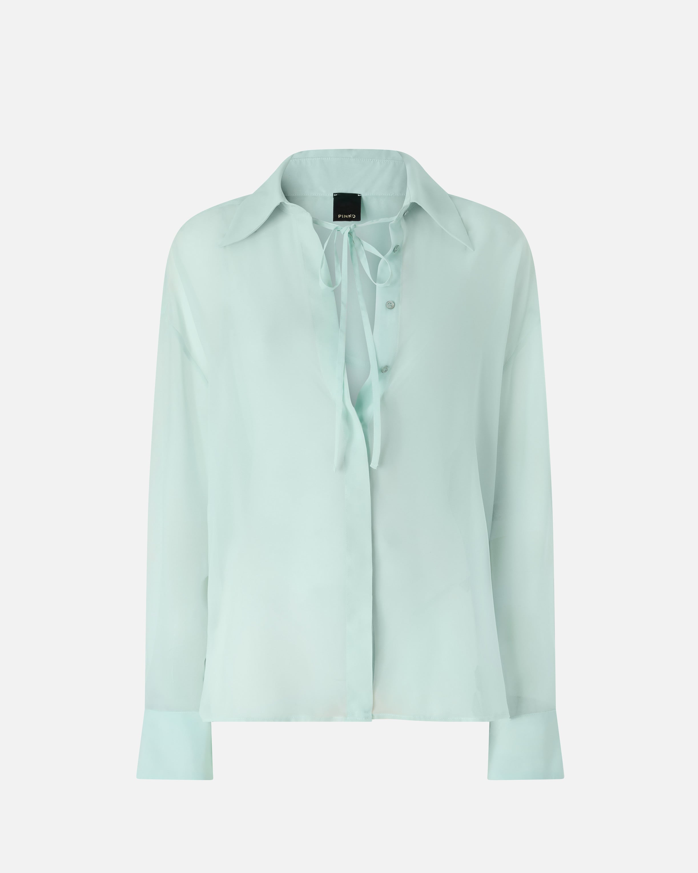Camisa de silueta fluida con cuello clásico, canesú trasero y mangas largas con hombros caídos, acabadas con puño y botón. La prenda está confeccionada en chifón, un tejido caracterizado por una increíble ligereza y un aspecto etéreo, y se completa con un cierre frontal oculto, que deja visible sólo el primer botón y que revela en su interior dos finas cintas: átalas en un delicado lazo y deja los primeros botones abiertos para lucir un estilo más atrevido. Si te gustan los looks con un efecto semitransparente, esta camisa será sin duda perfecta para ti y aportará un toque de sensualidad refinada a tus looks de noche.
