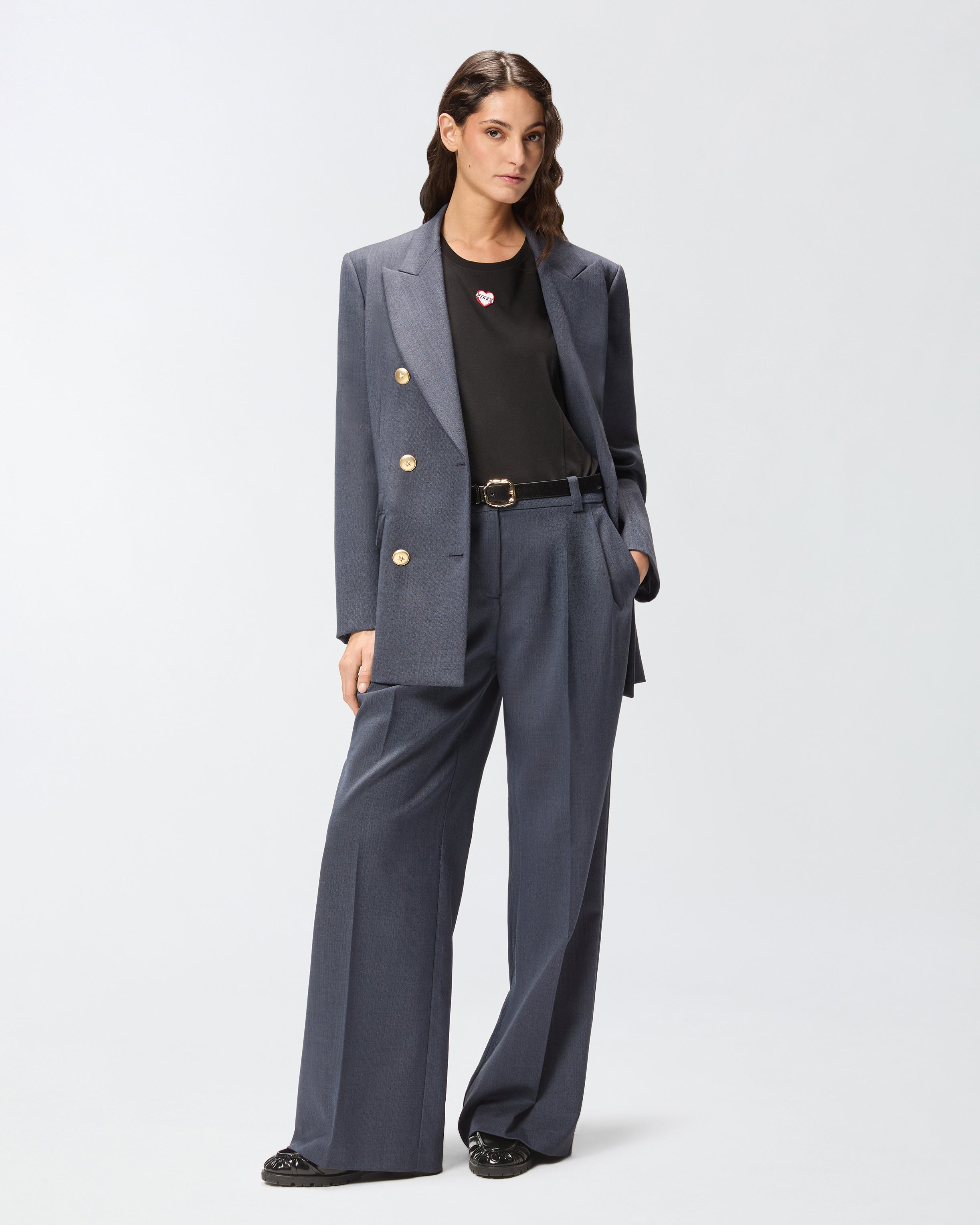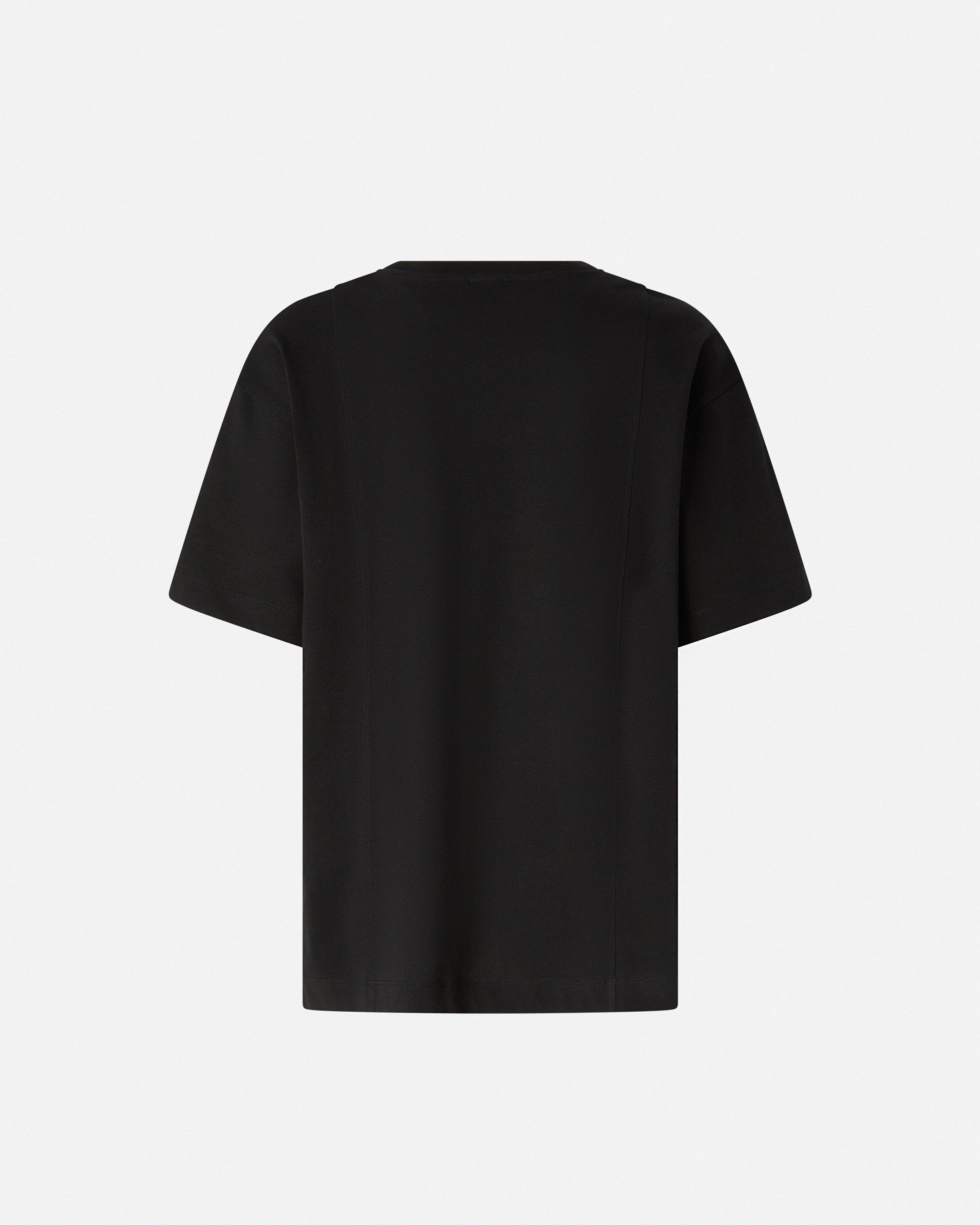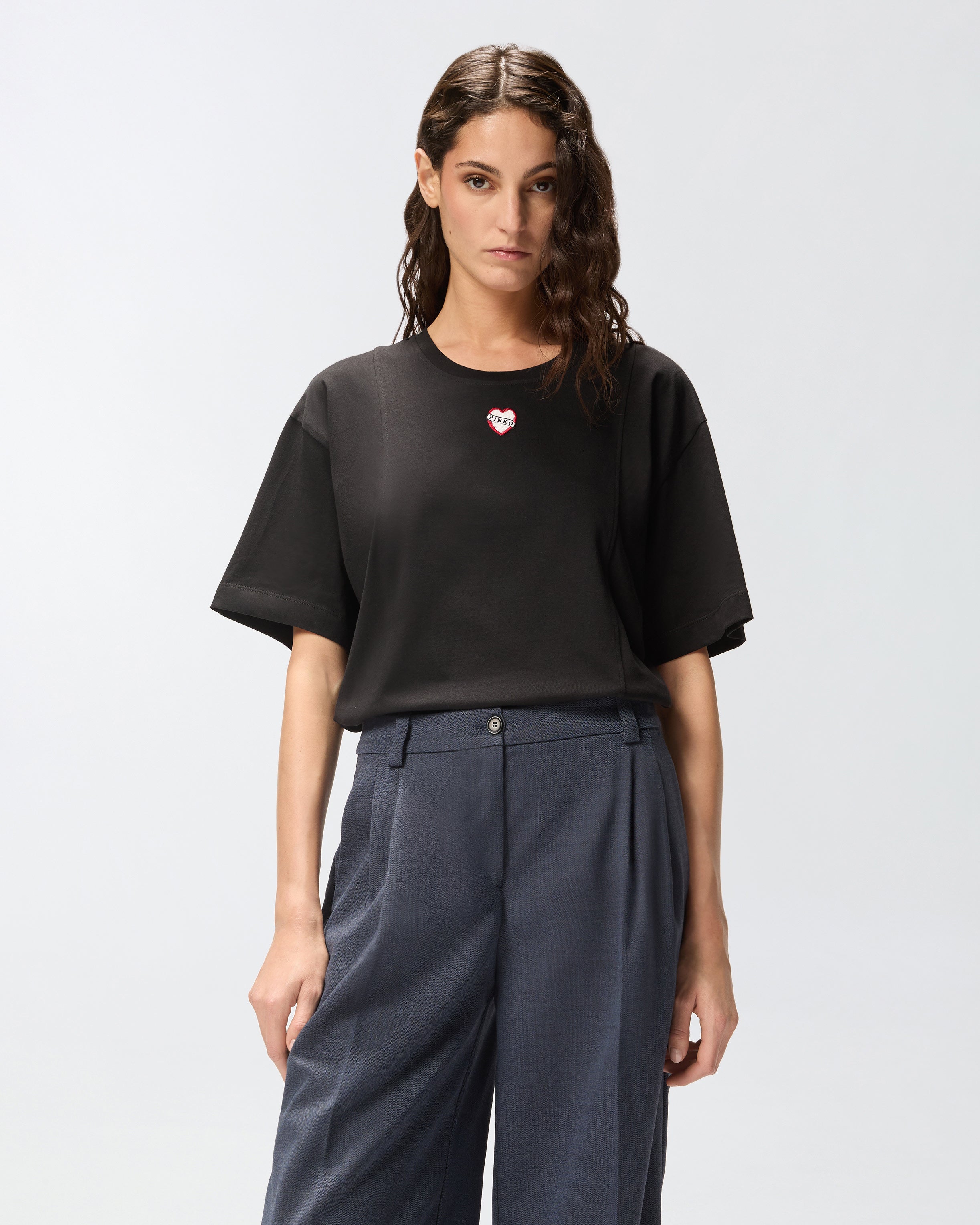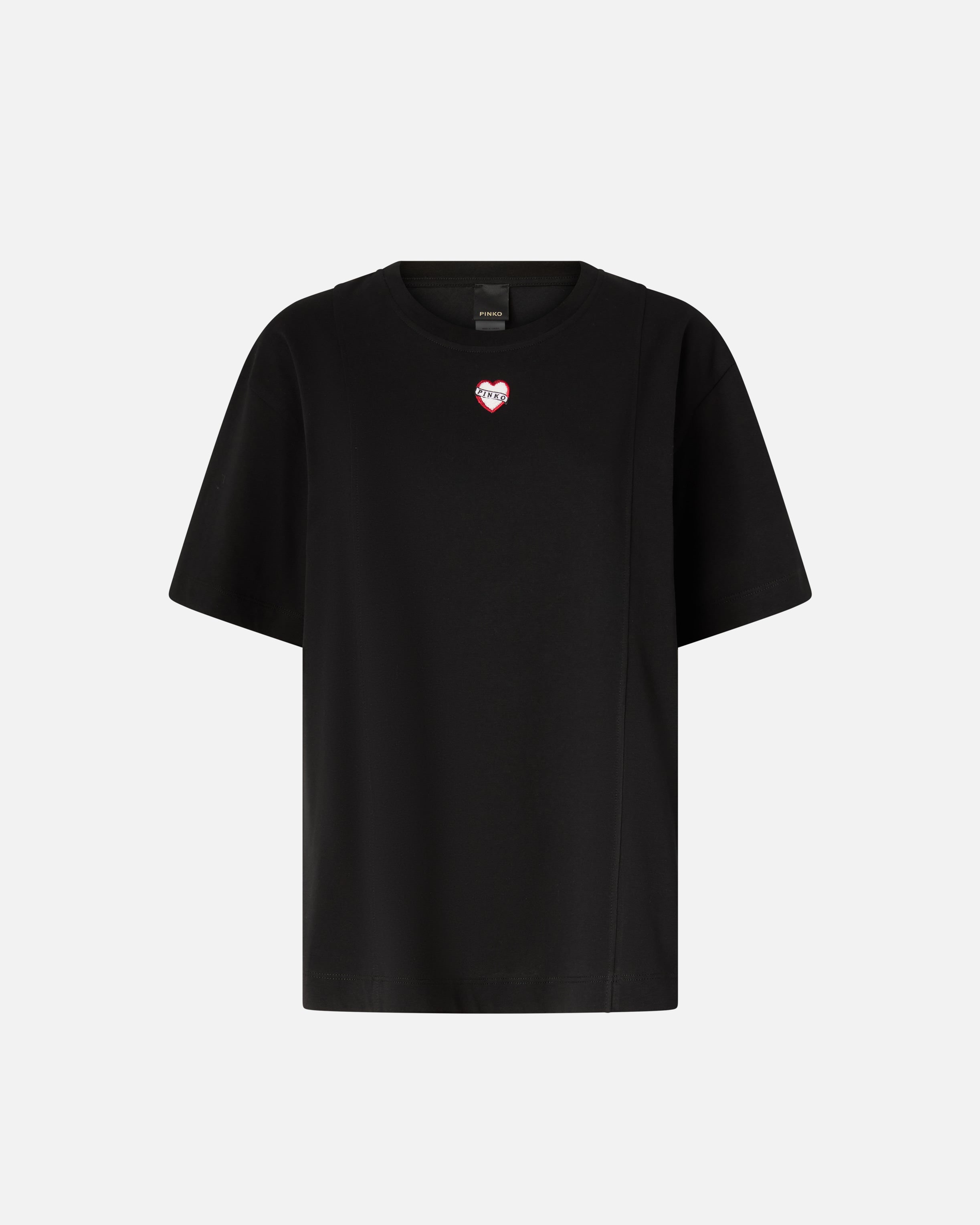 Camiseta de manga corta con cuello redondo acanalado confeccionada en punto de puro algodón. La parte delantera se caracteriza por un bordado en forma de corazón con el logotipo de letras PINKO. Una prenda versátil, fácil de llevar con unos vaqueros o bajo la chaqueta para un look informal.