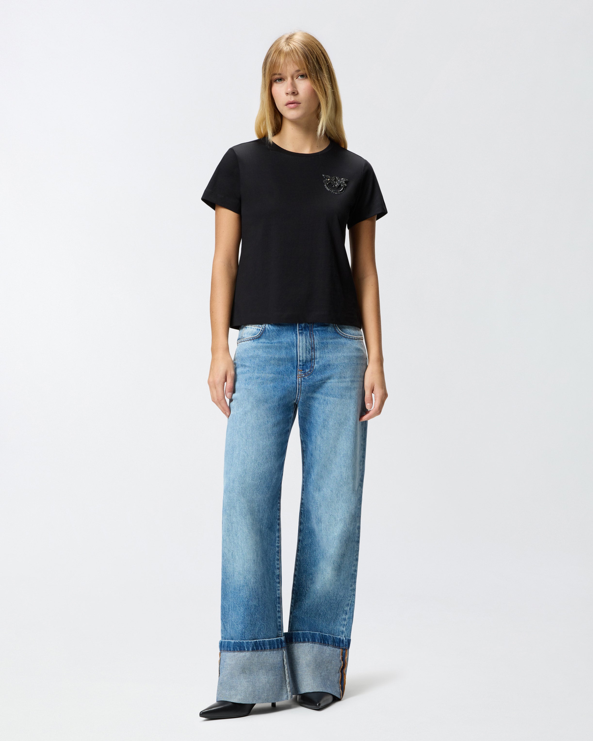 Camiseta de punto de puro algodón con cuello redondo y manga corta. Los cristales y las perlas de diferentes colores y formas aportan un toque de elegancia refinada al logotipo Love Birds presente en la parte delantera izquierda y rematan esta prenda con un precioso toque artesanal. Esta camiseta combina fácilmente con tus pantalones favoritos y eleva tu look de forma sencilla, elegante y original.